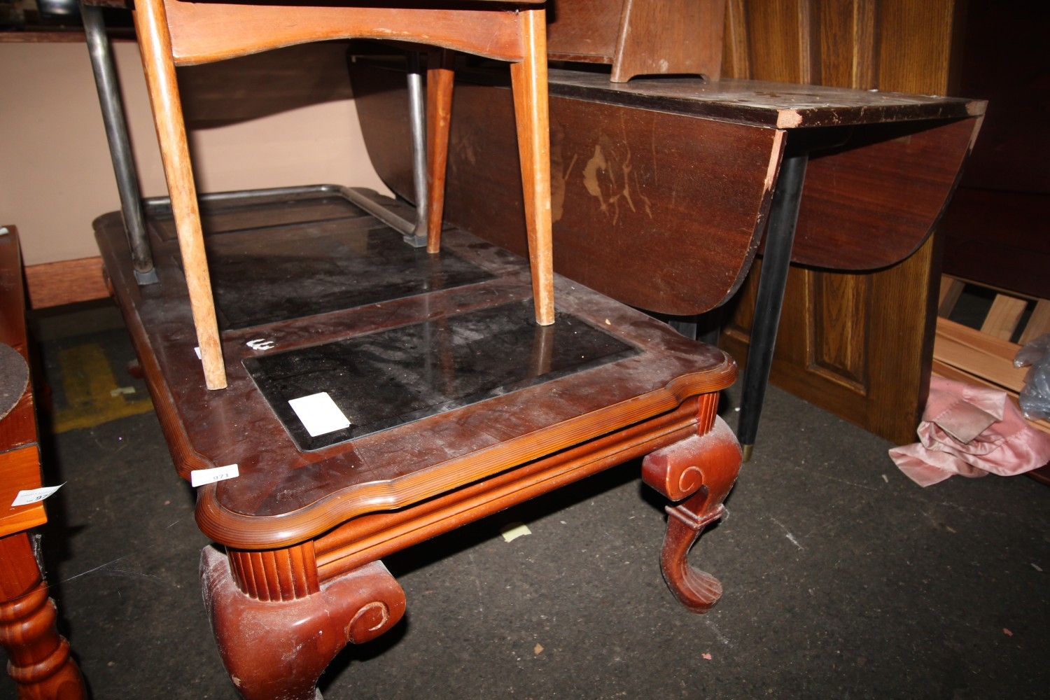 Lot 971: Ornate carved repro coffee table with glass panels...