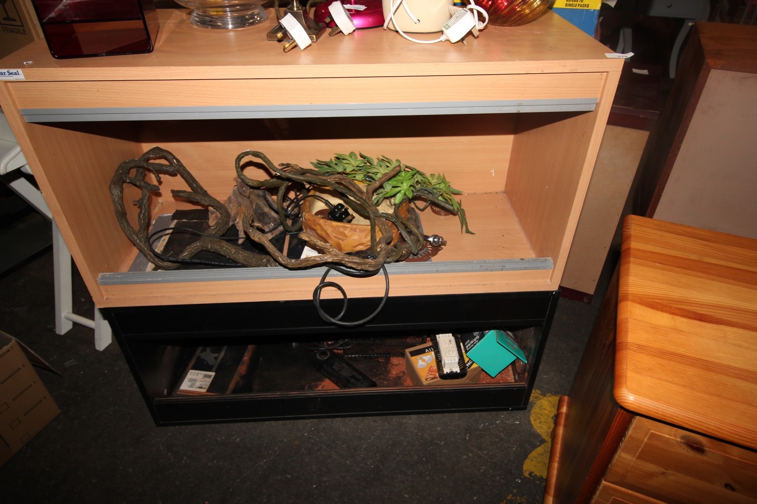 2X LARGE VIVARIUMS ROUGHLY 1FT WIDE WITH CONTENTS SUCH AS FAKE WOOD BATHING/LARGE DRINKING DISH BULBS INC INFARED BULBS AND MORE