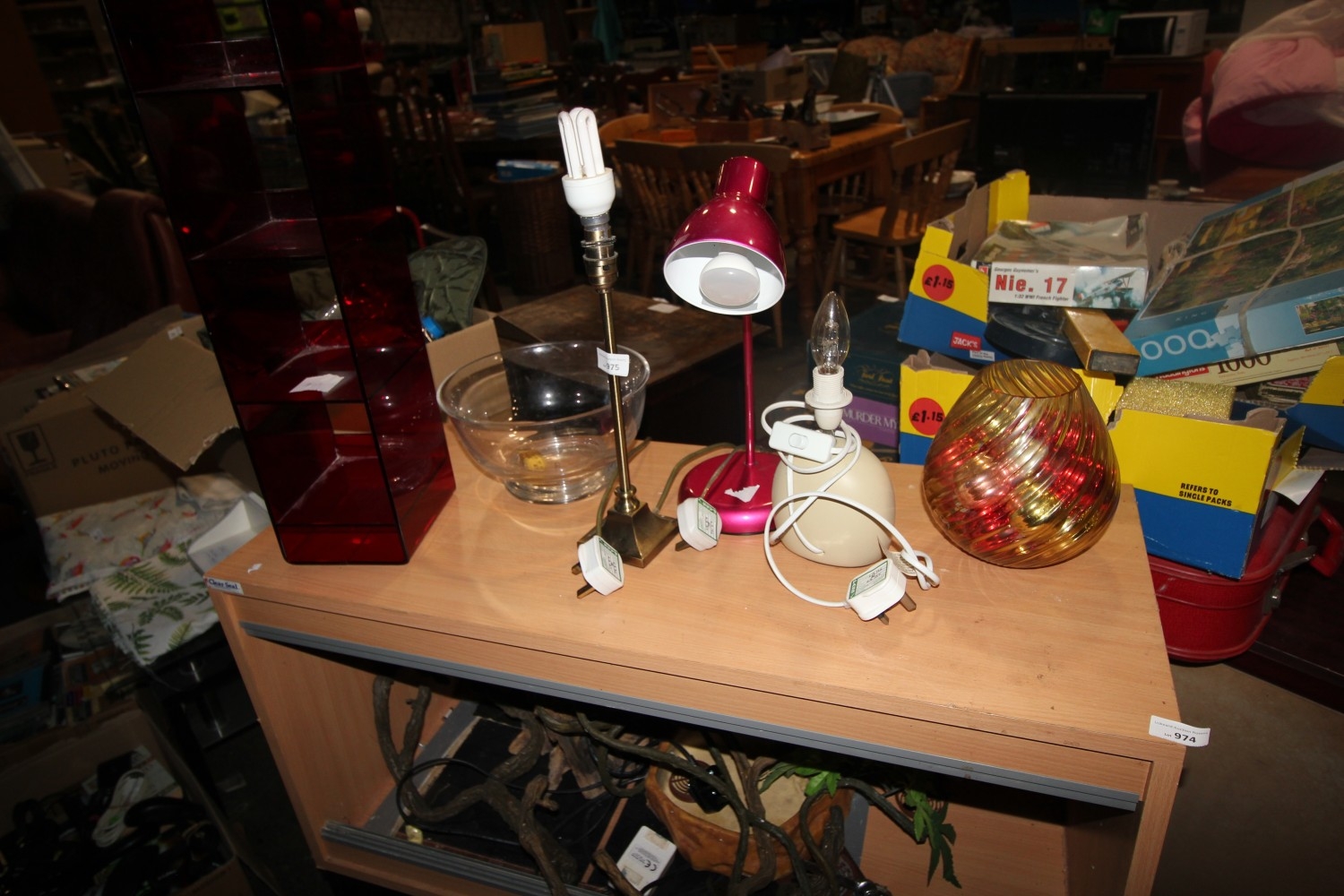 Collection of misc household items inc table and desk lamps, amber swirl glass vase, ruby perspex shelved organiser etc