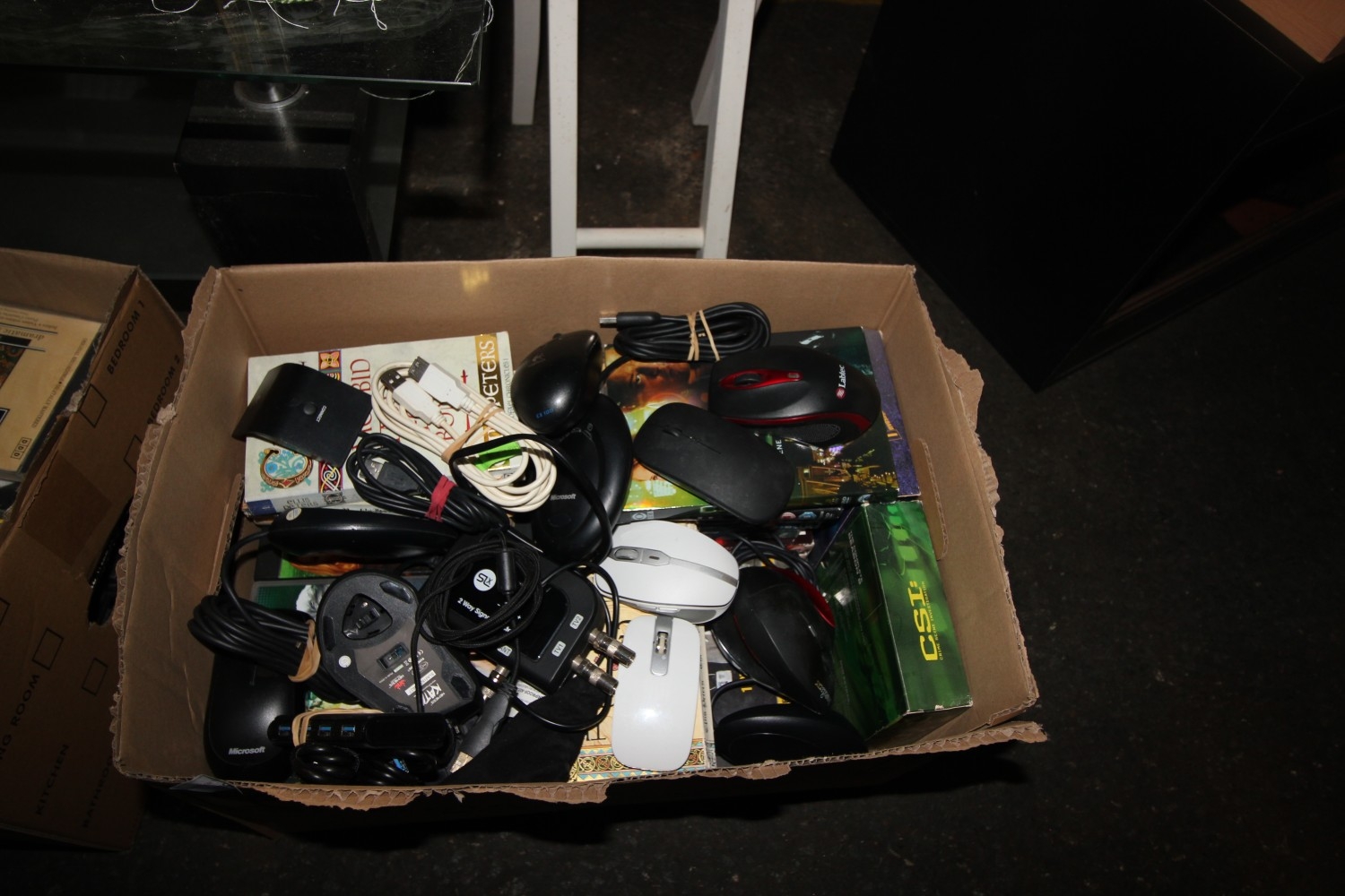 Box of misc inc a number of CSI DVD boxed sets, Ellis Peters novels and pc equipment inc left-handed Perixx Perimice mouse, and other wired and wireless pc mice