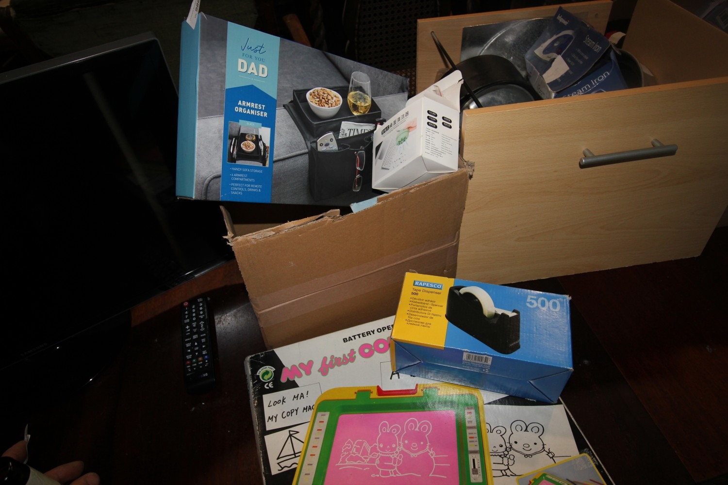 Box inc Rapesco tape dispenser, keyboard cleaner, armrest organiser, bobble off, battery operated "my first copy machine" and more