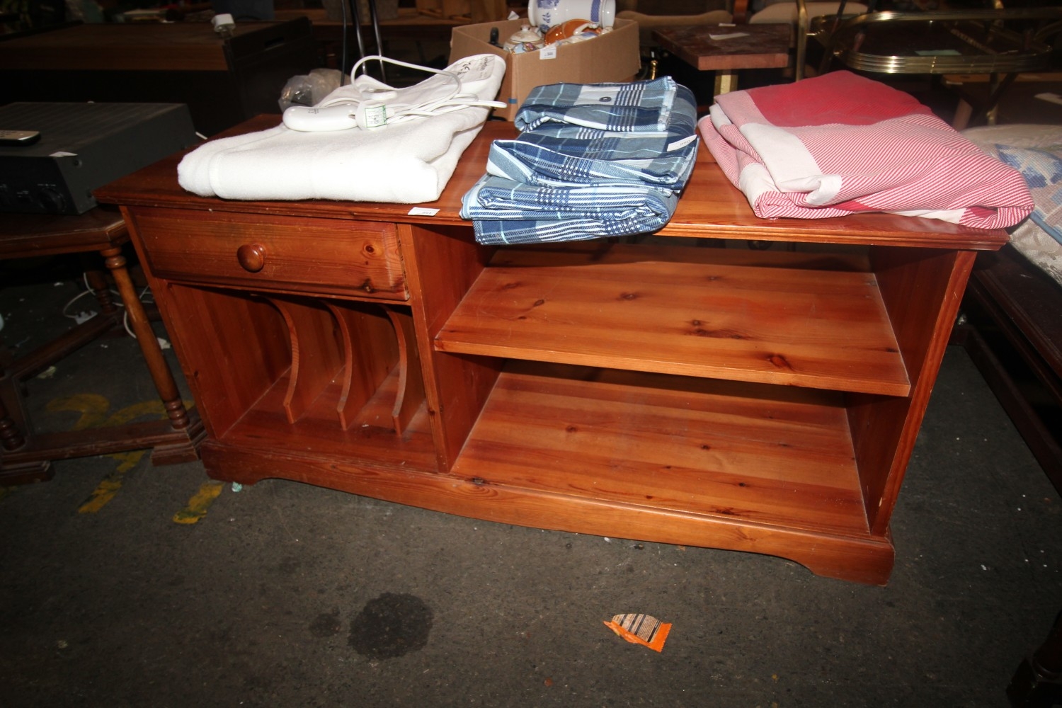 Vintage pine single drawer entertainment unit with two shelves and LP section