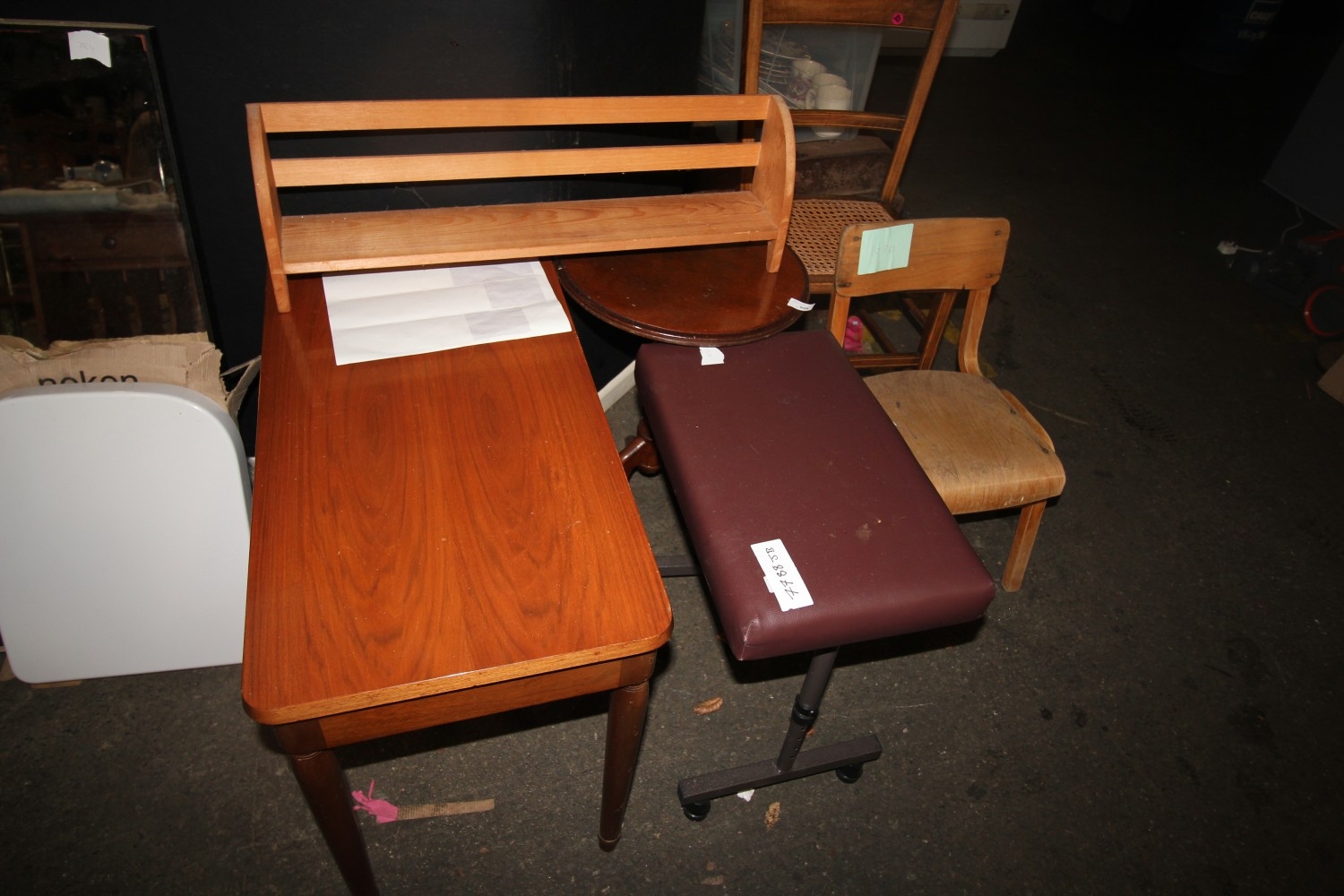 Selection of vintage tables and chairs and a pine freestanding shelf