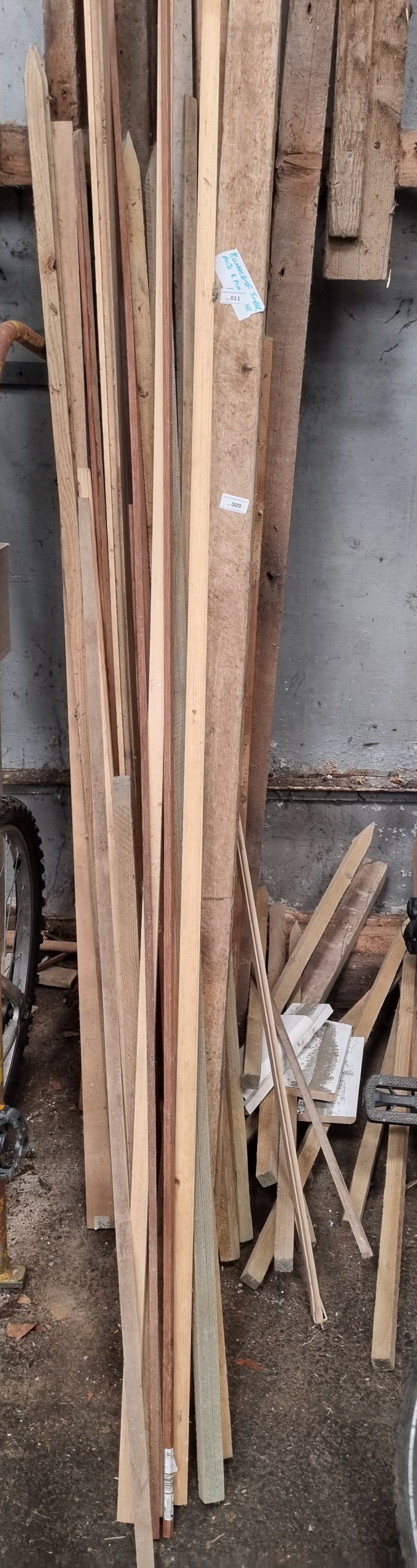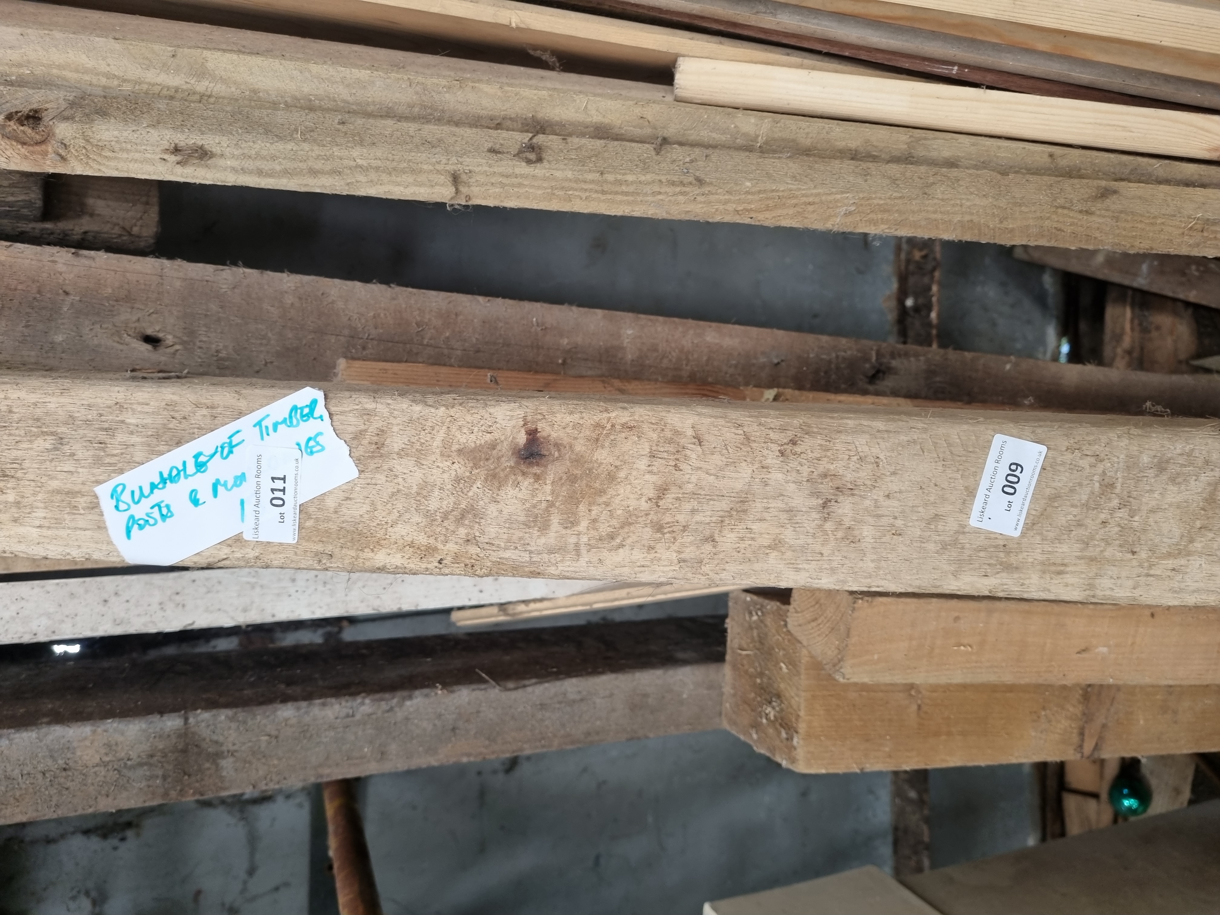 A collection of various timber lengths and building materials. The lot includes multiple pieces of lumber in diverse dimensions, featuring square-section posts, thin battens, and pointed timber stakes. The materials comprise a mix of natural wood types, showing varying degrees of surface wear consistent with storage. A group of white rectangular ceramic tiles is also present within the collection. The items bear labels from Liskeard Auction Rooms, including a handwritten note identifying a BUNDLE OF TIMBER POSTS & MORE and stickers for lot 009 and lot 011. All items appear in a used, reclaimed condition.