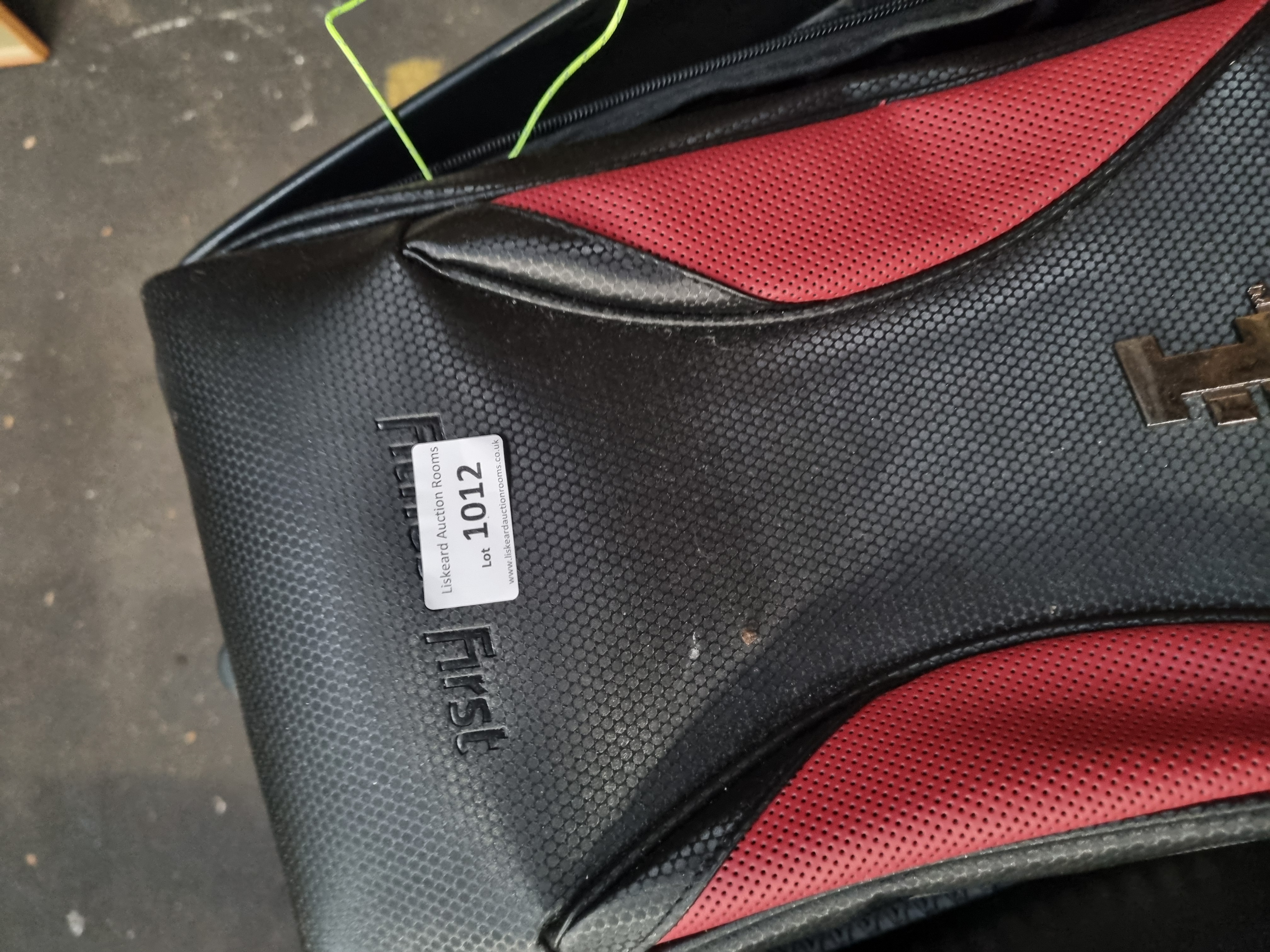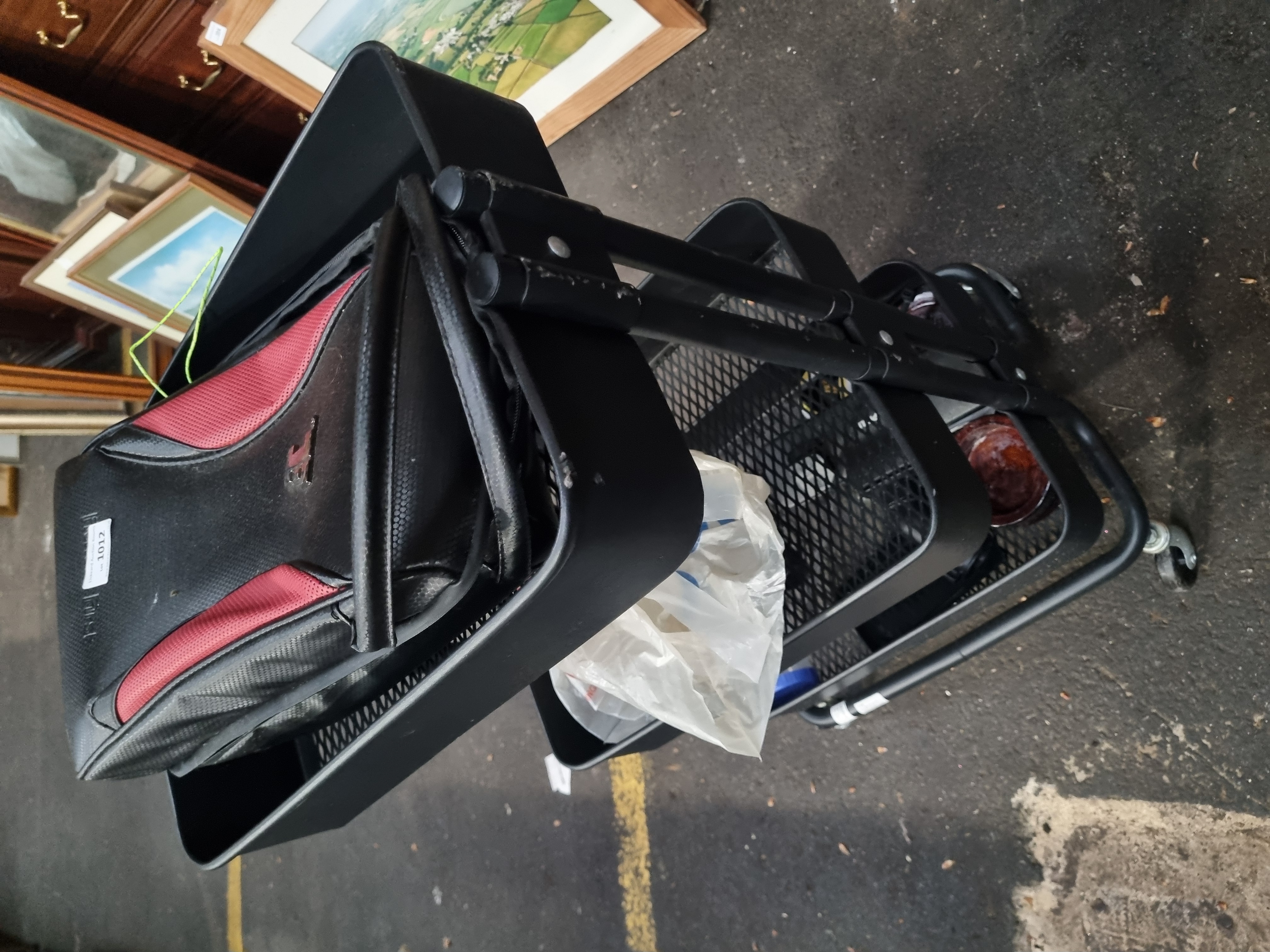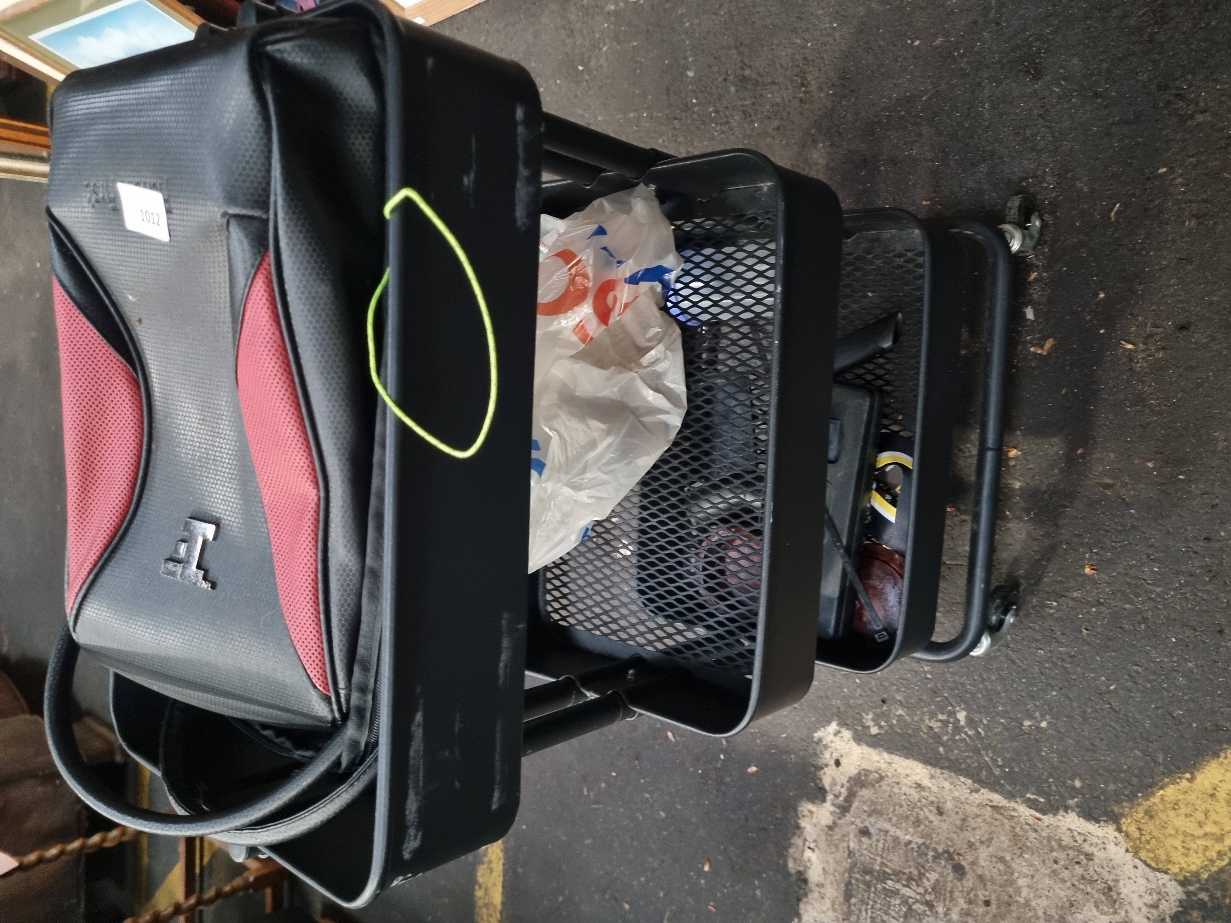 A black metal three-tier rolling utility cart featuring a tubular frame and three rectangular trays with wire mesh bottoms. The cart is mounted on four swivel casters for mobility. The top tray contains a black and red synthetic gear bag with embossed Hummel and First branding. The lower trays contain an assortment of miscellaneous items, including objects within a white plastic carrier bag. The gear bag features an adhesive auction lot label from Liskeard Auction Rooms for lot 1012.