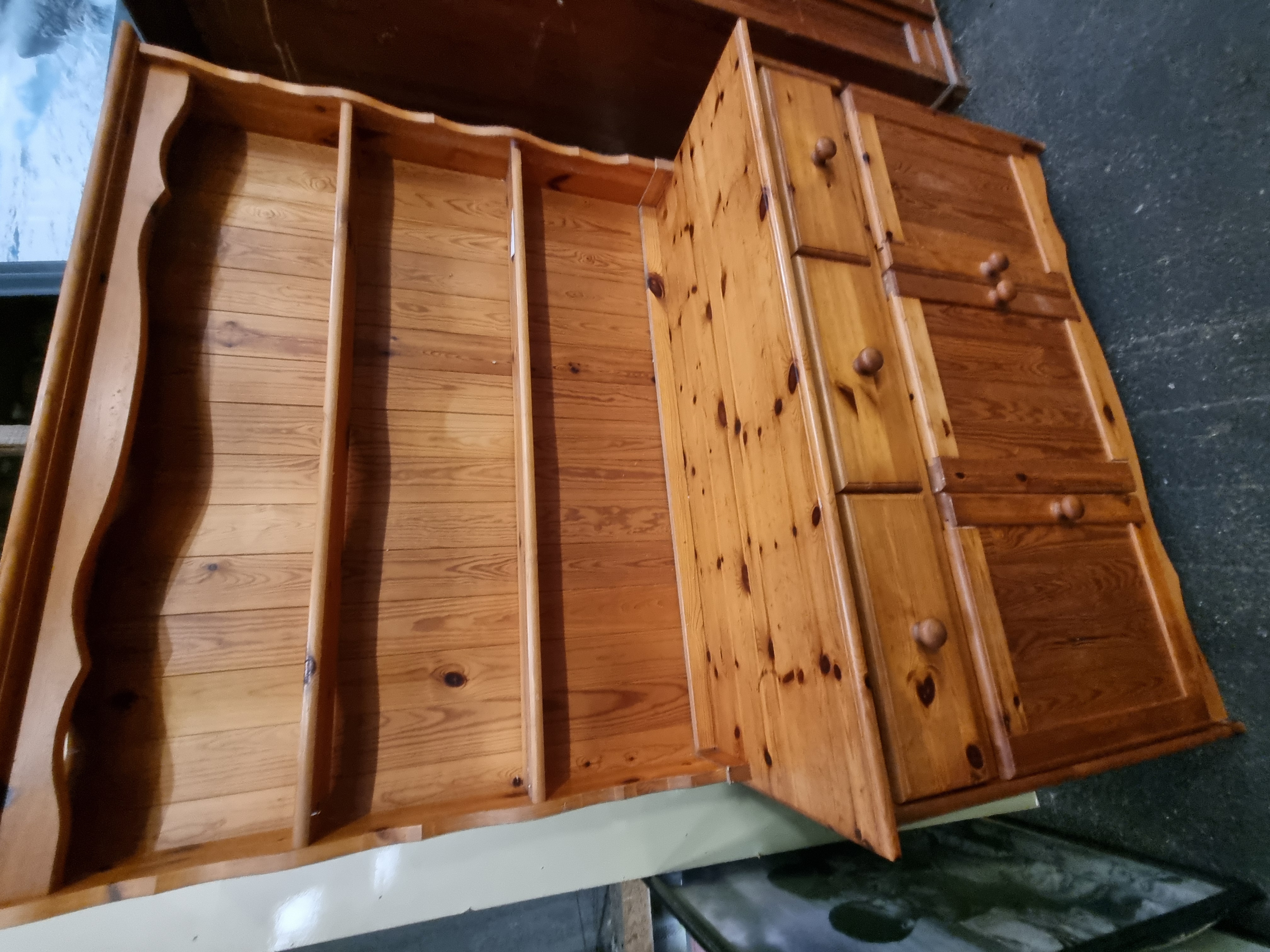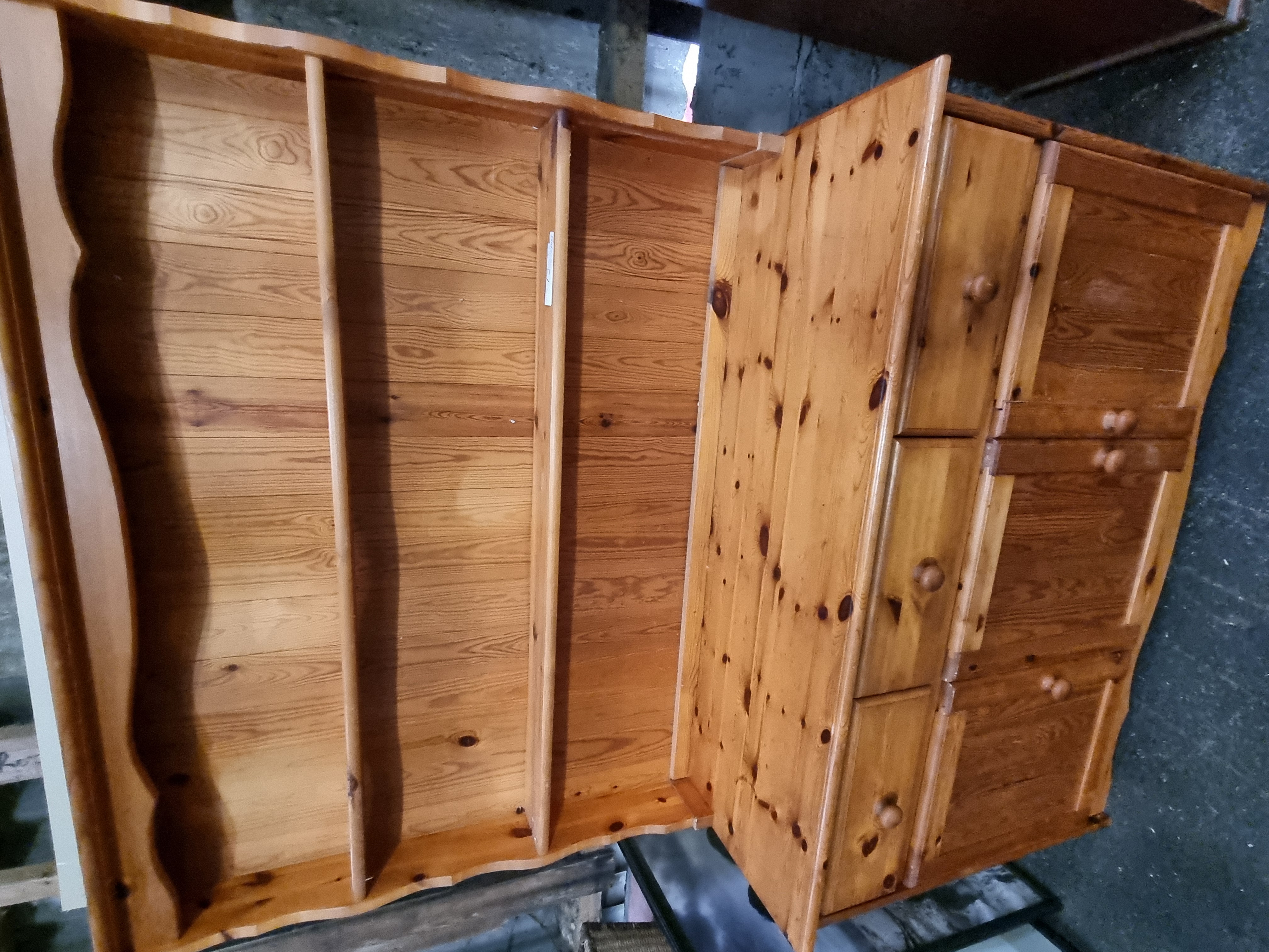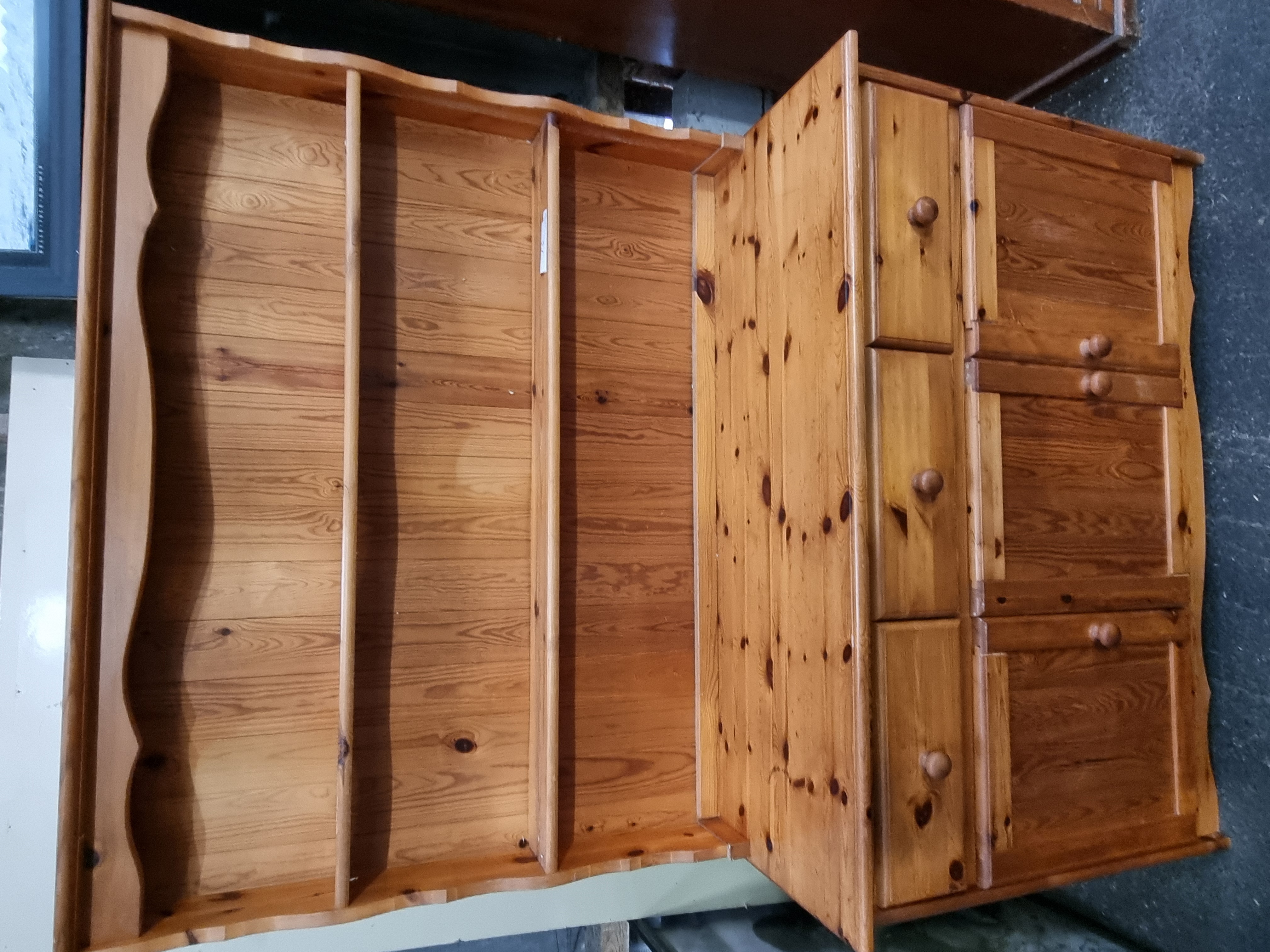 A two-piece country style Welsh dresser constructed from solid knotty pine with a polished finish. The upper section features a three-tier open plate rack with a decorative scalloped top frieze and shaped side supports. Each shelf is fitted with a front retaining rail. The lower sideboard base is configured with a vertical bank of three drawers to the left, while the right-hand side comprises a cupboard door with horizontal panelling designed to match the drawer configuration. The piece is fitted with original turned wooden knobs throughout. No manufacturer marks are discernible, although a small white adhesive label is present on the central shelf of the upper section.