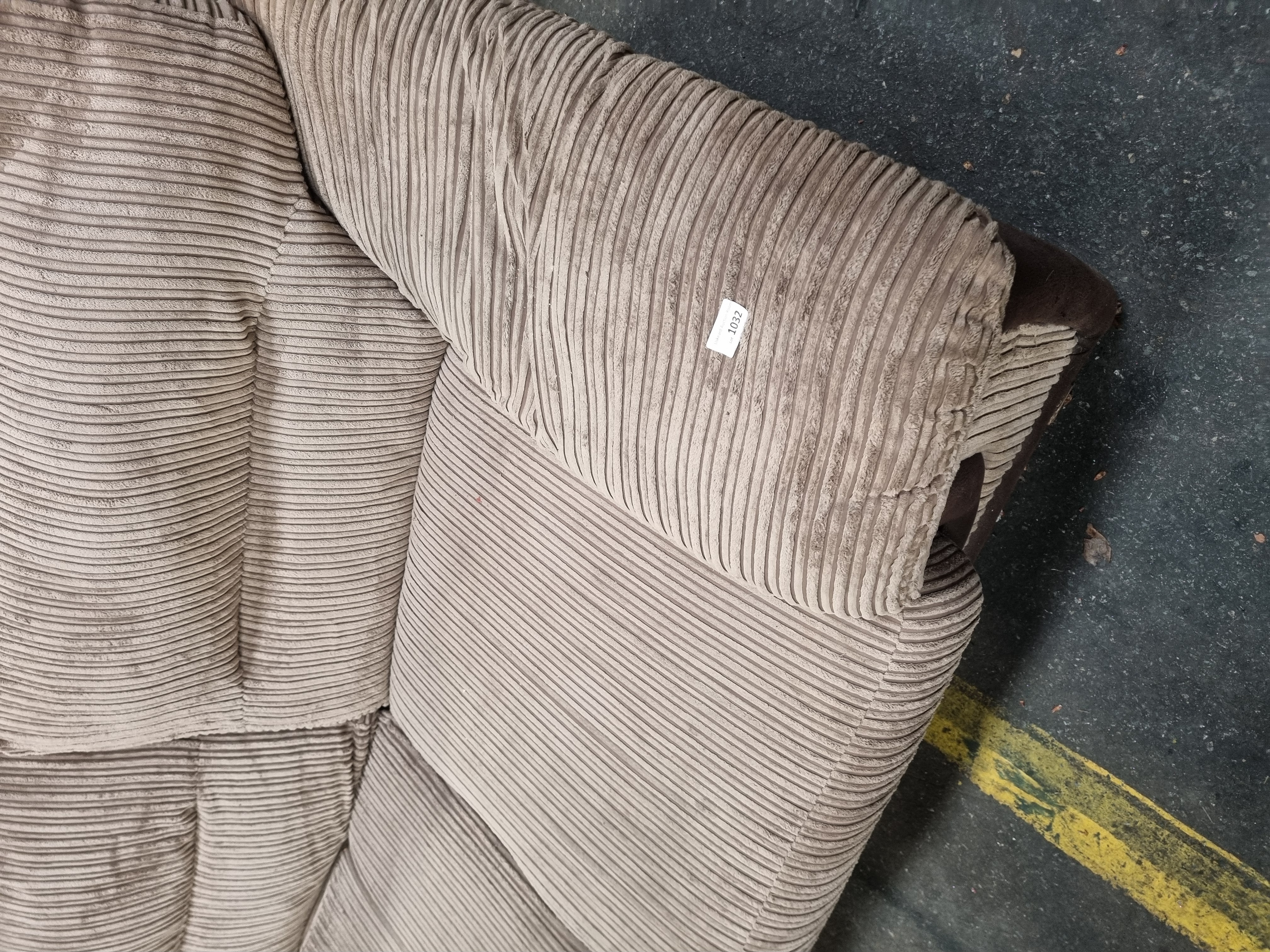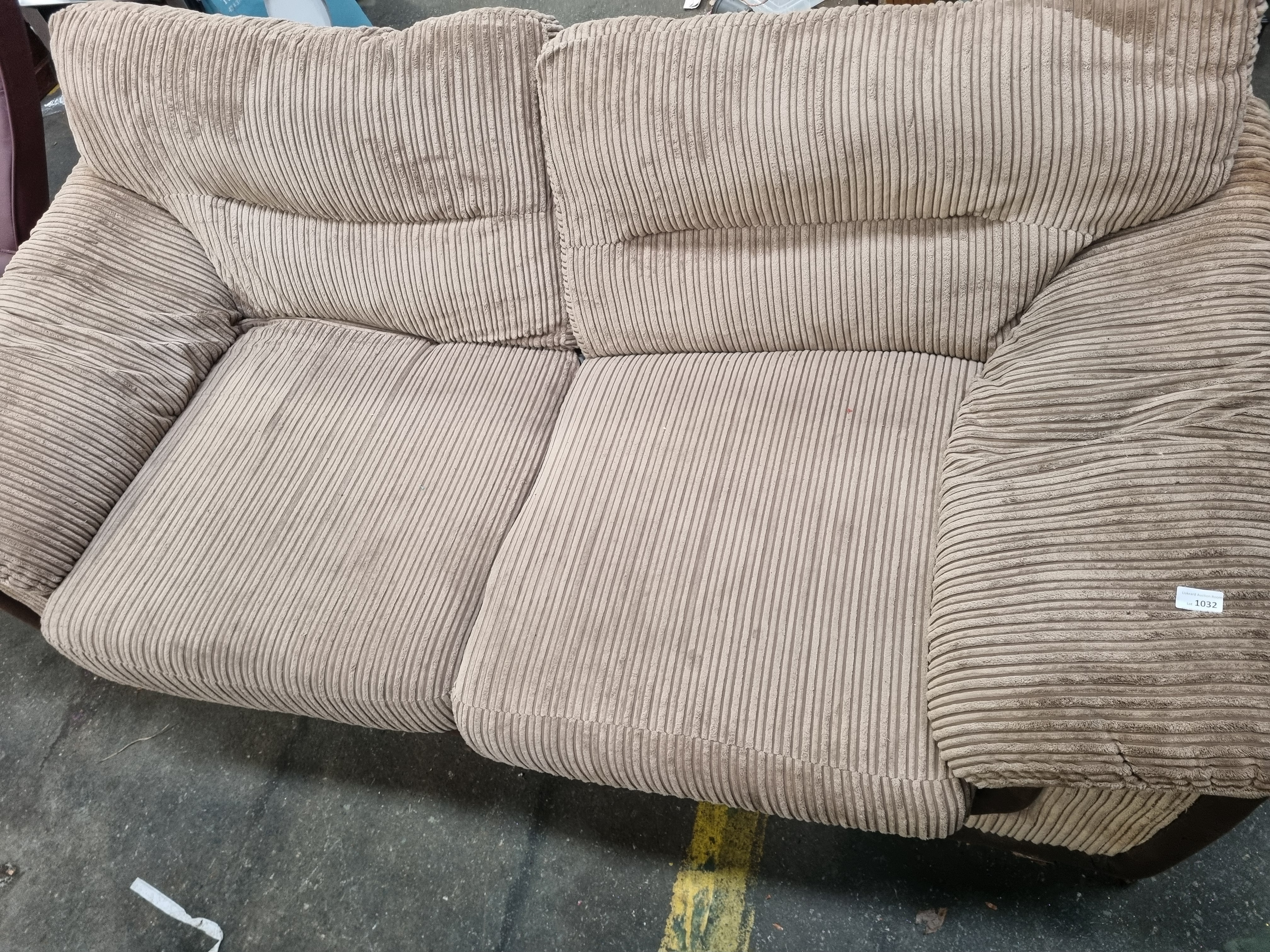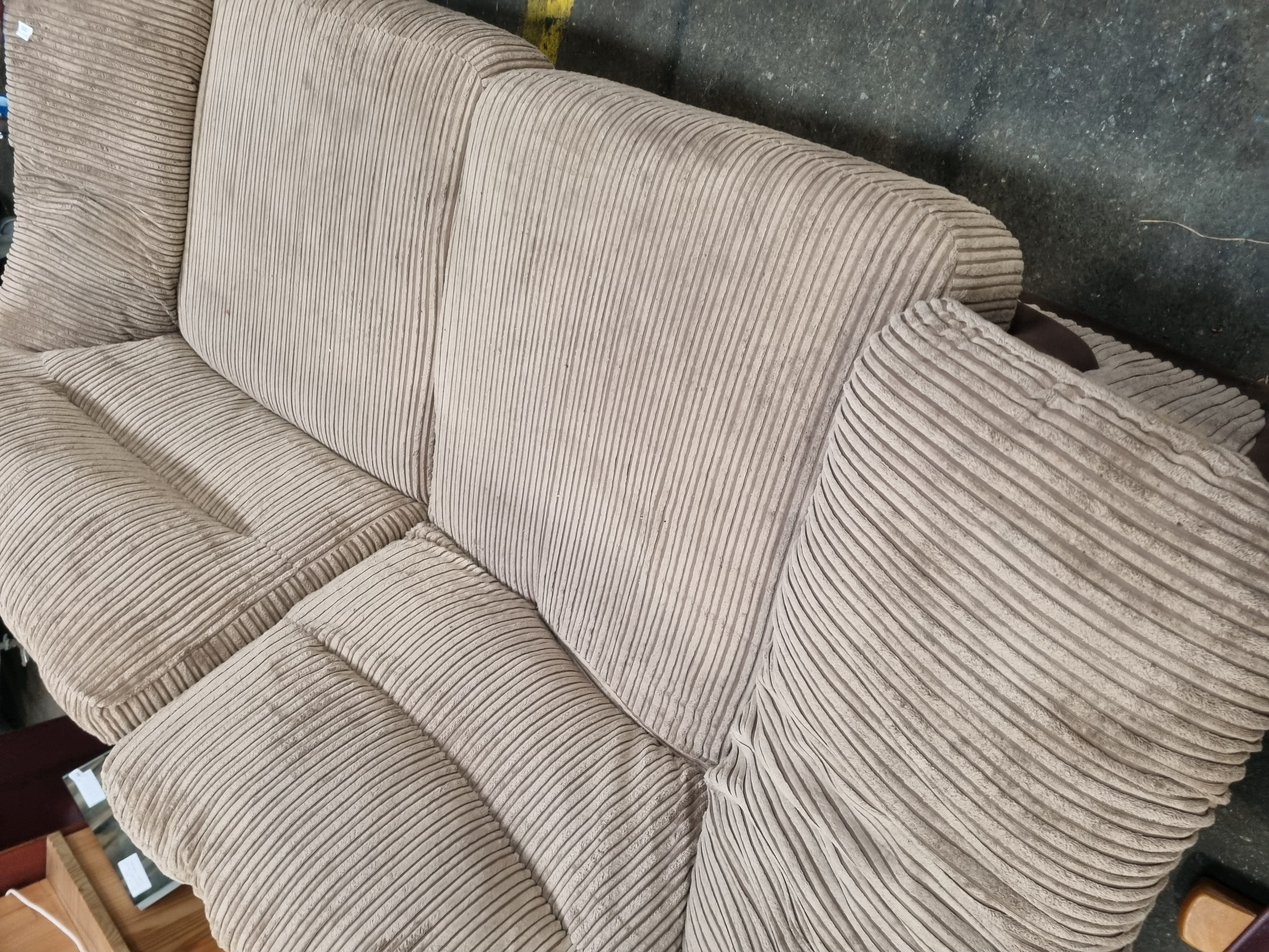 Lot 1032: Ashley Furniture SimpleJoy Two-Seater Sofa in Sand Cord and Brown Faux Leather