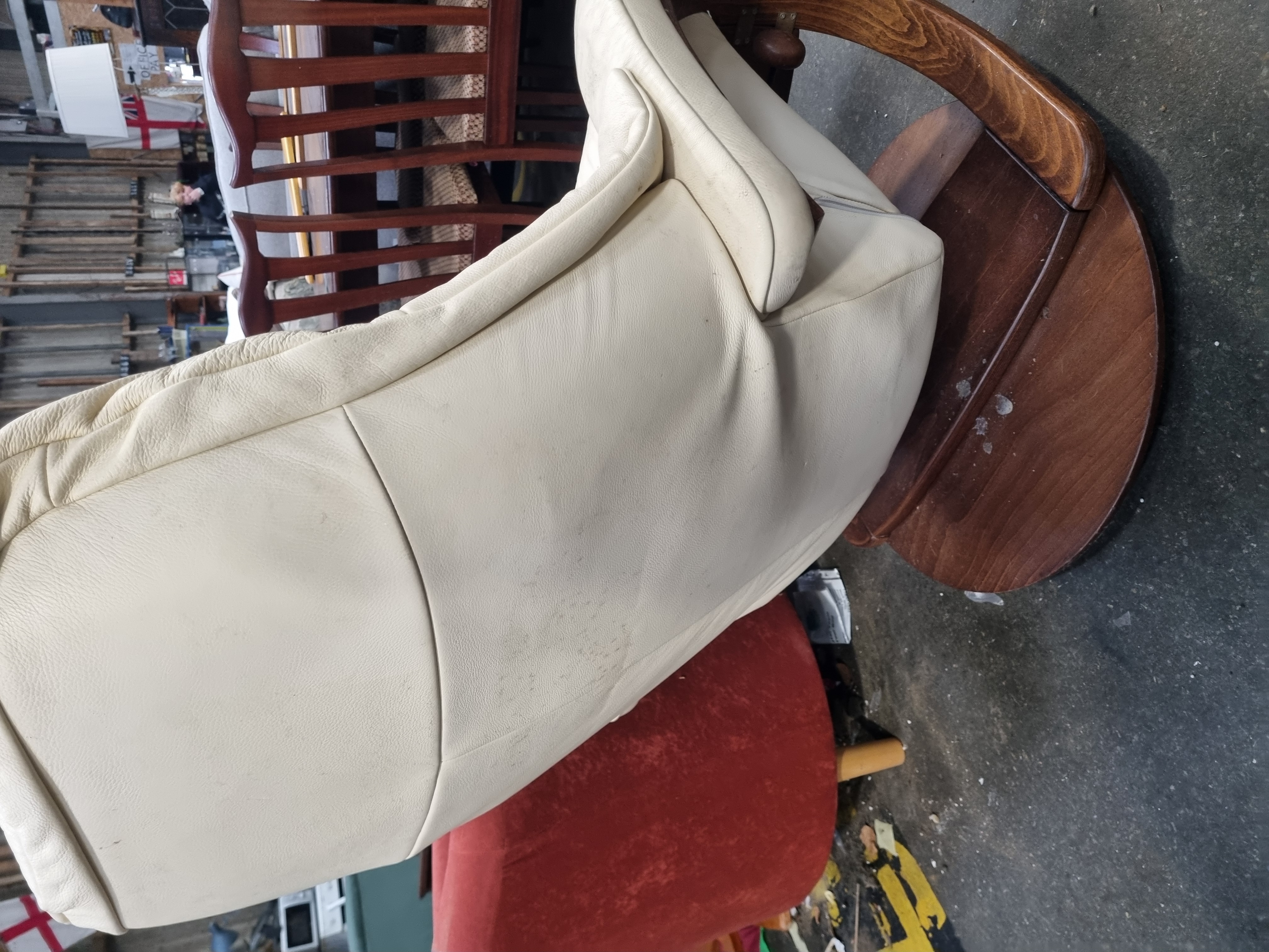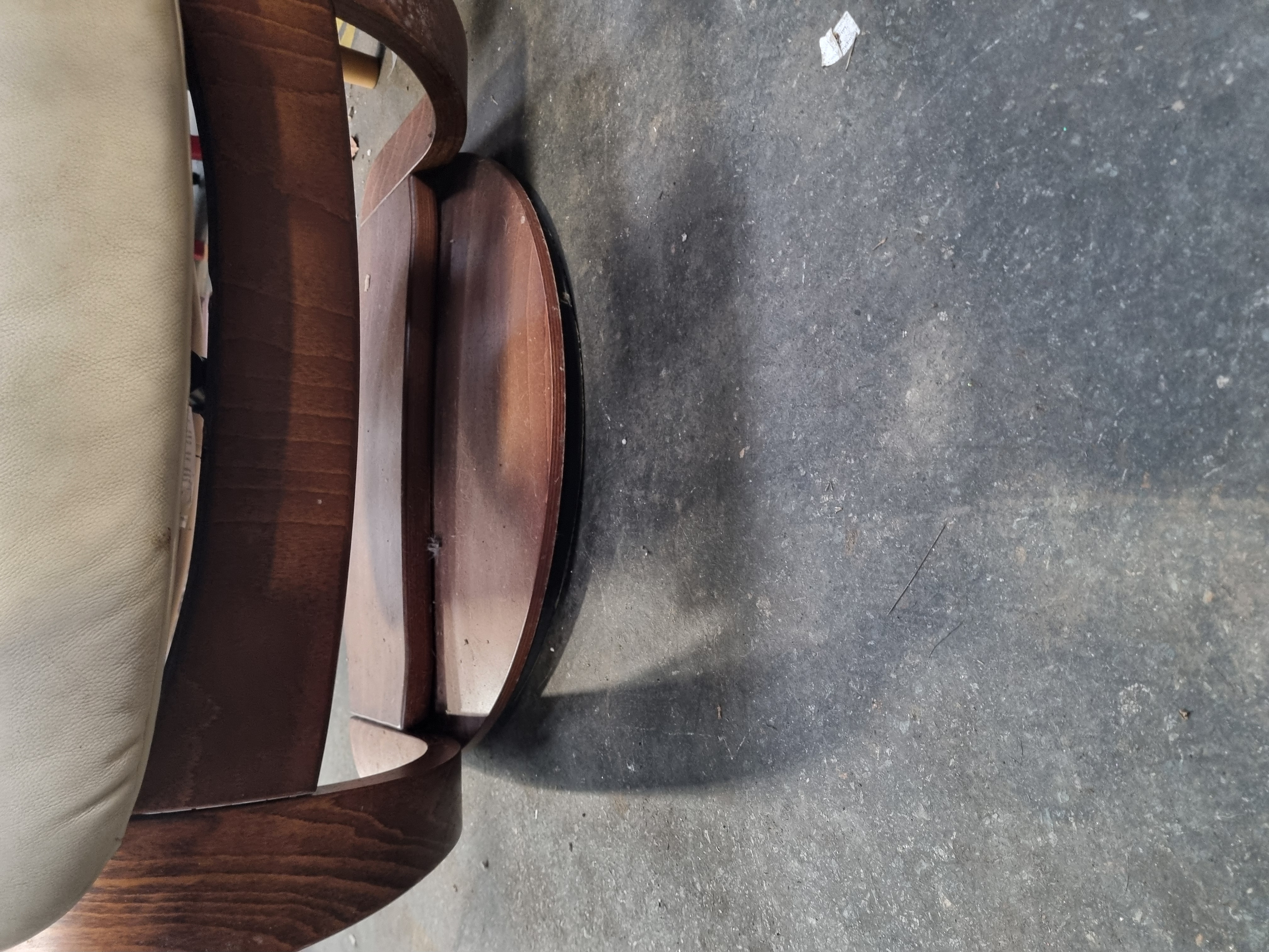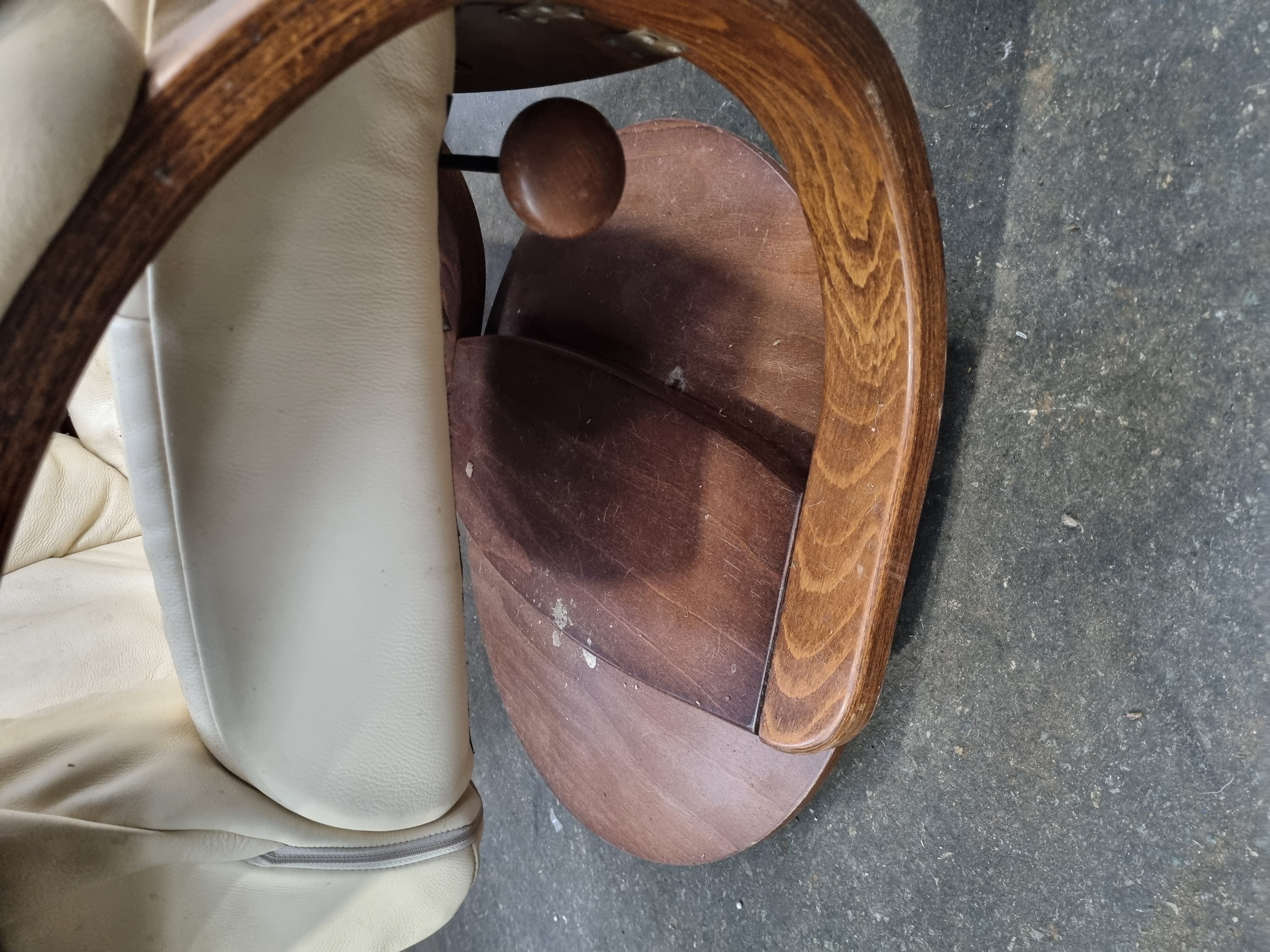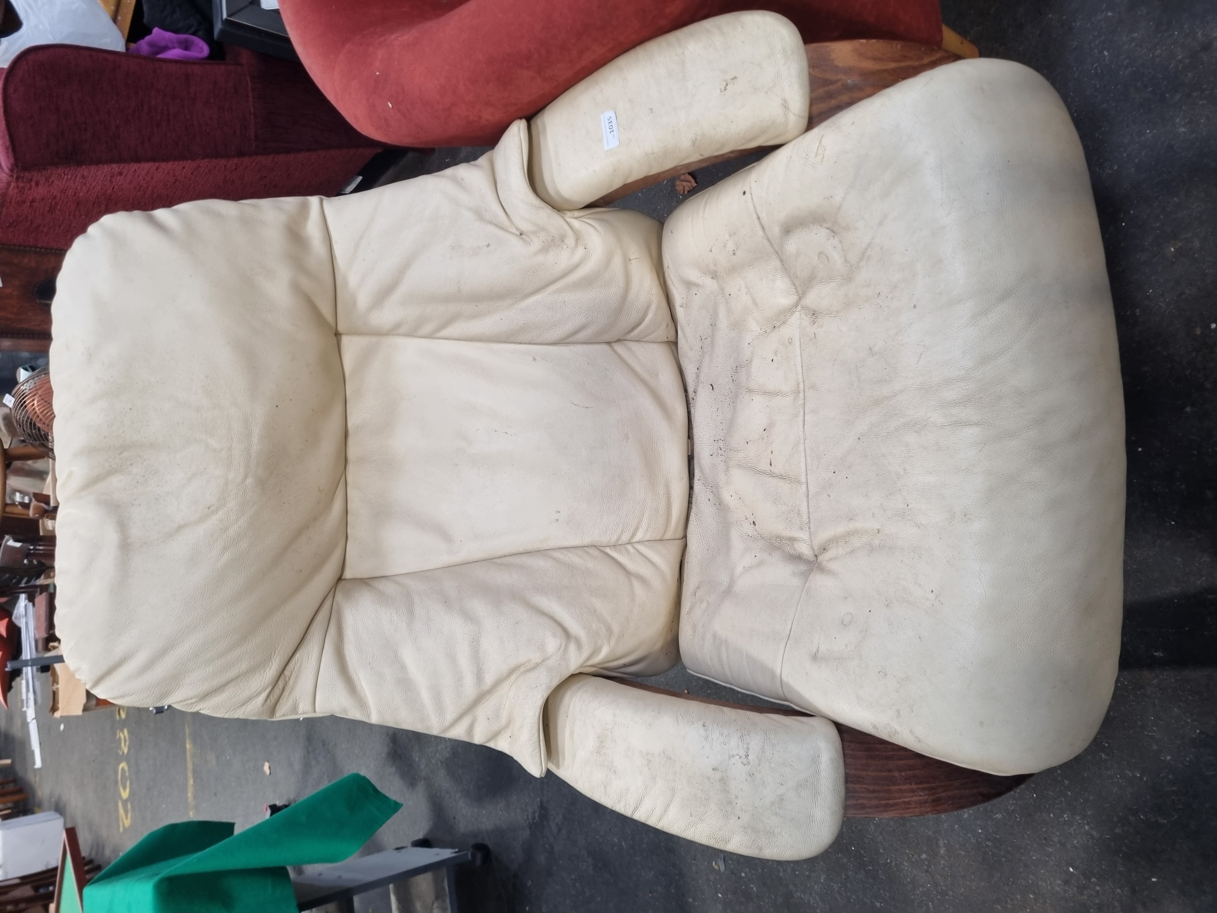 An upholstered swivel recliner armchair by Ekornes, part of the Stressless range. The chair is upholstered in cream-coloured leather with a padded headrest, back, seat, and armrests. It is mounted on a dark-stained laminated bentwood frame featuring C-scroll arm supports and a circular swivel base. The piece includes a manual reclining mechanism operated by a circular wooden tension knob located on the side of the seat frame. The design is characteristic of late 20th-century Scandinavian ergonomic furniture.