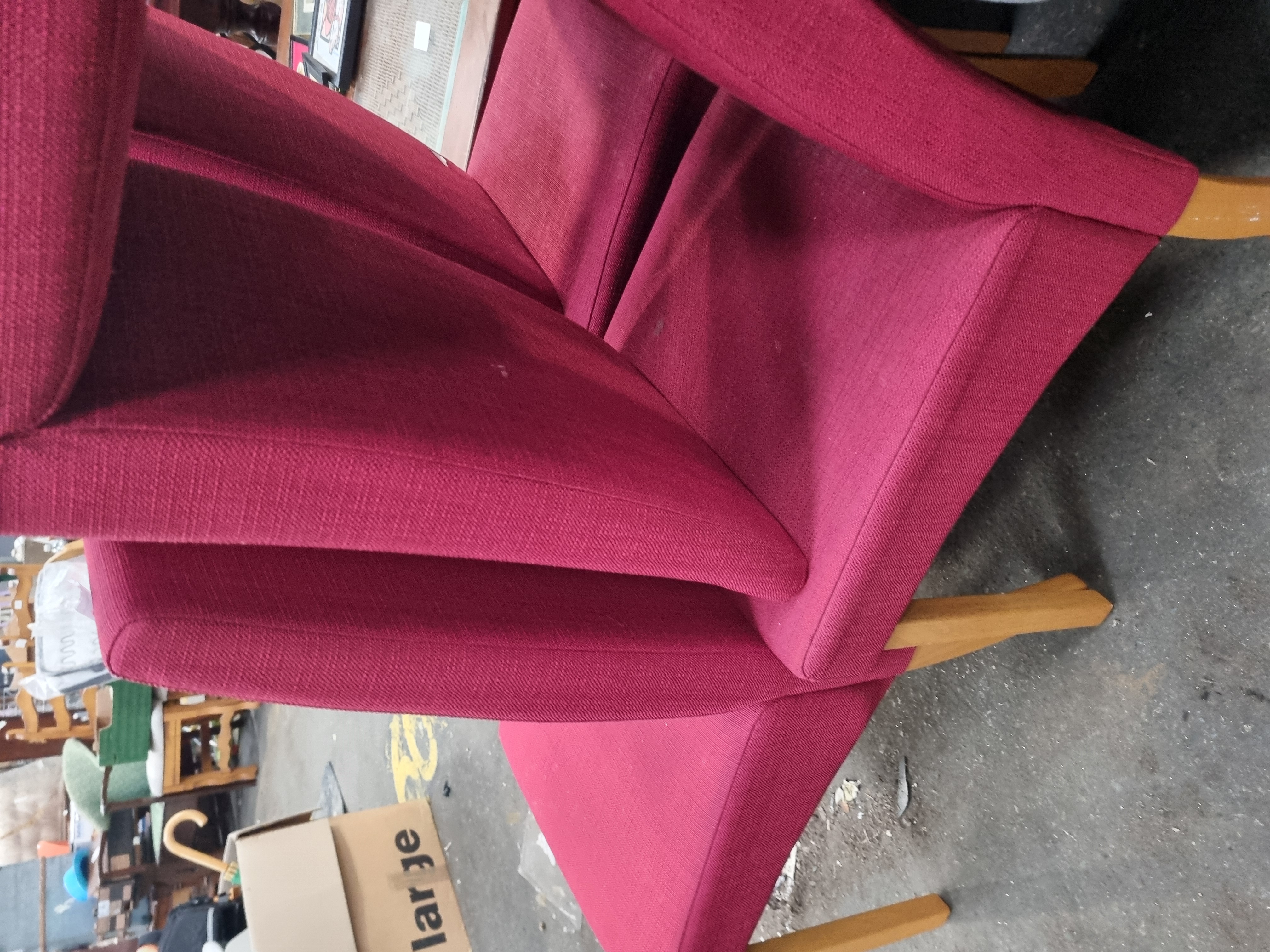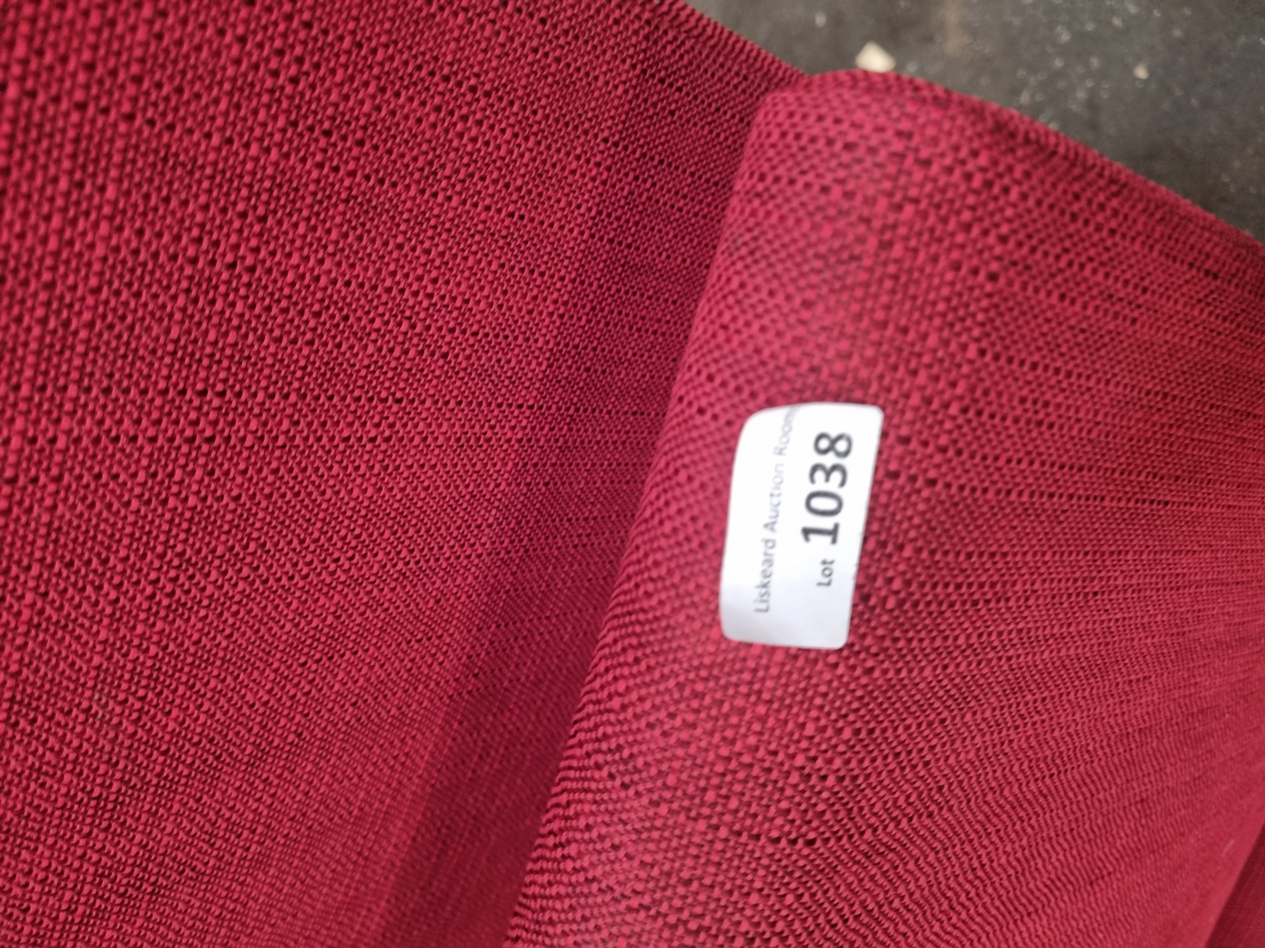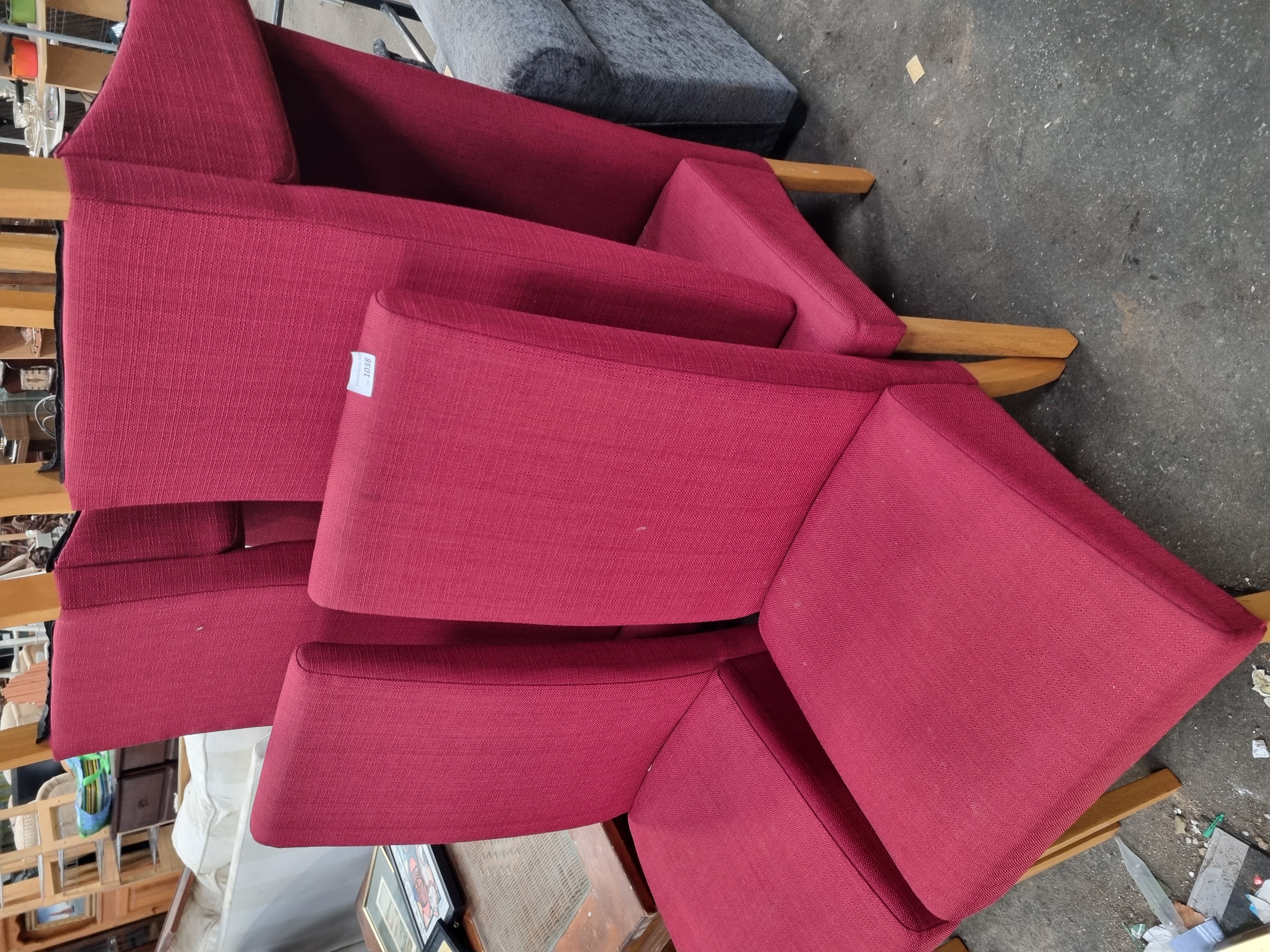 A set of six dining chairs in the mid-century modern style, featuring a clean, geometric silhouette. Each chair is designed with a high, slightly angled backrest and a square seat, both of which are fully upholstered. The chairs are supported by four tapered, splayed legs crafted from a light-toned hardwood finished with a clear lacquer. The undersides of the seats are fitted with black fabric dust covers. The upholstery consists of a durable, textured woven fabric in a deep red colour. A white adhesive auction lot label from Liskeard Auction Room, marked Lot 1038, is attached to the reverse of one chair.