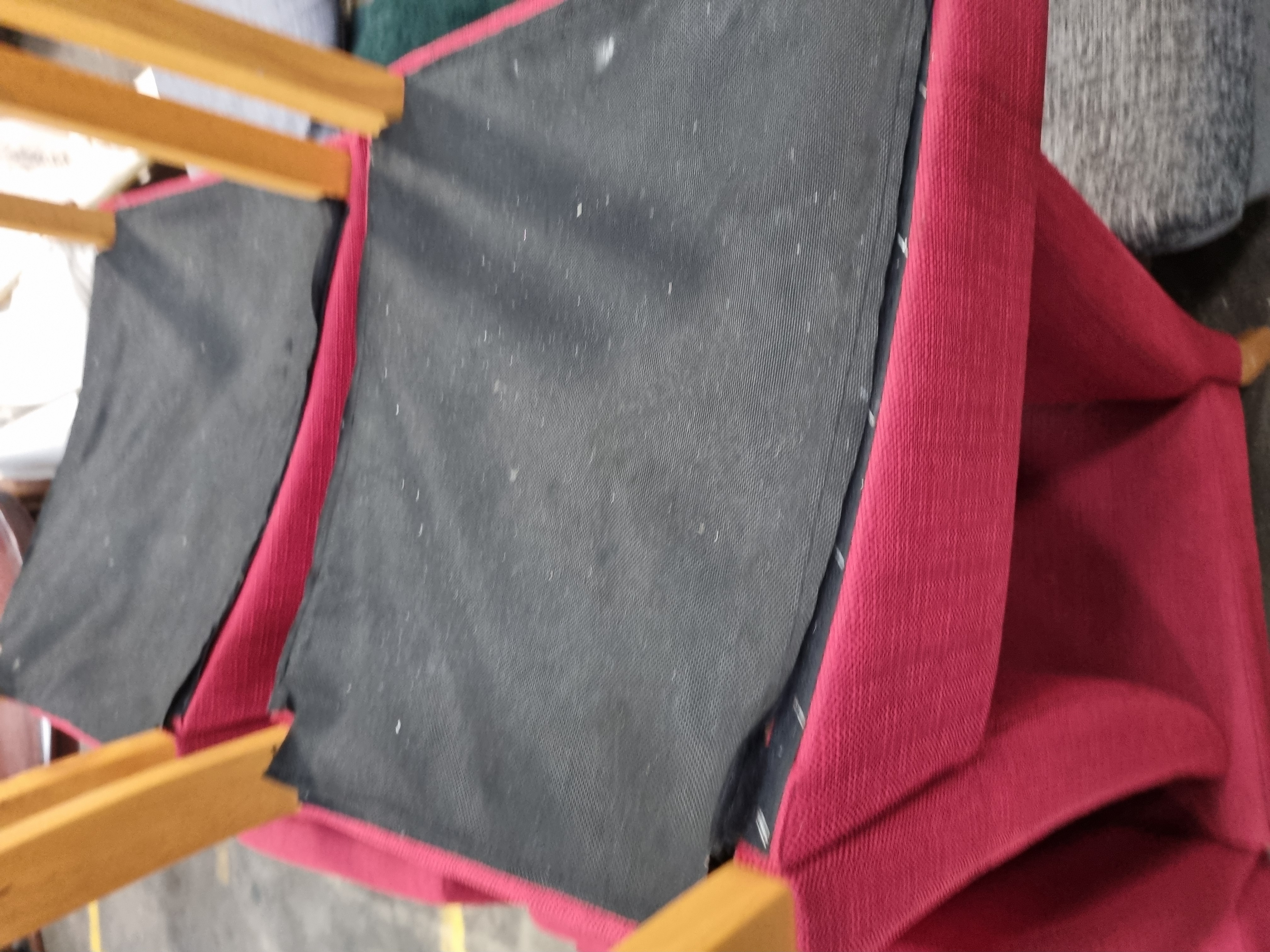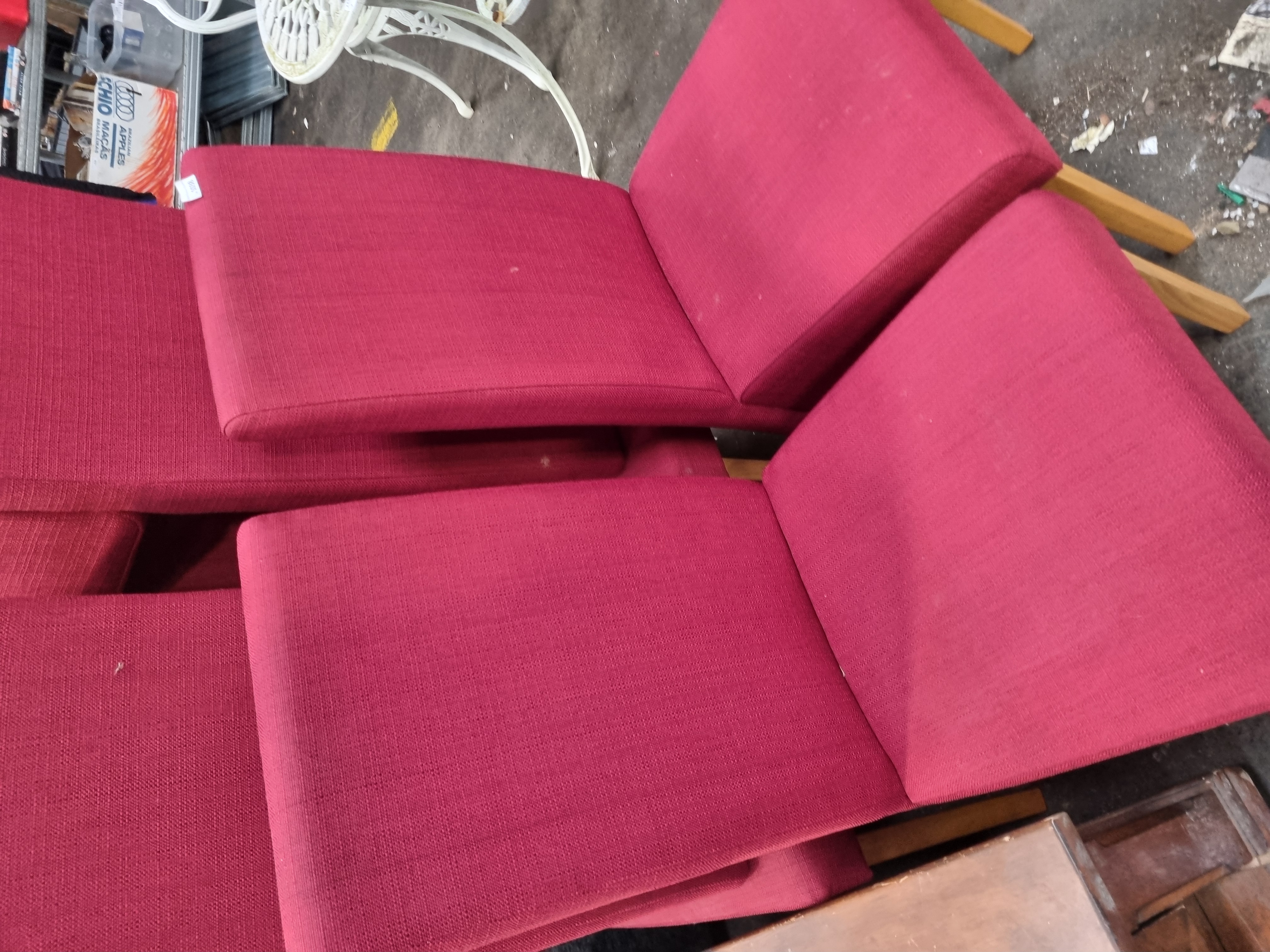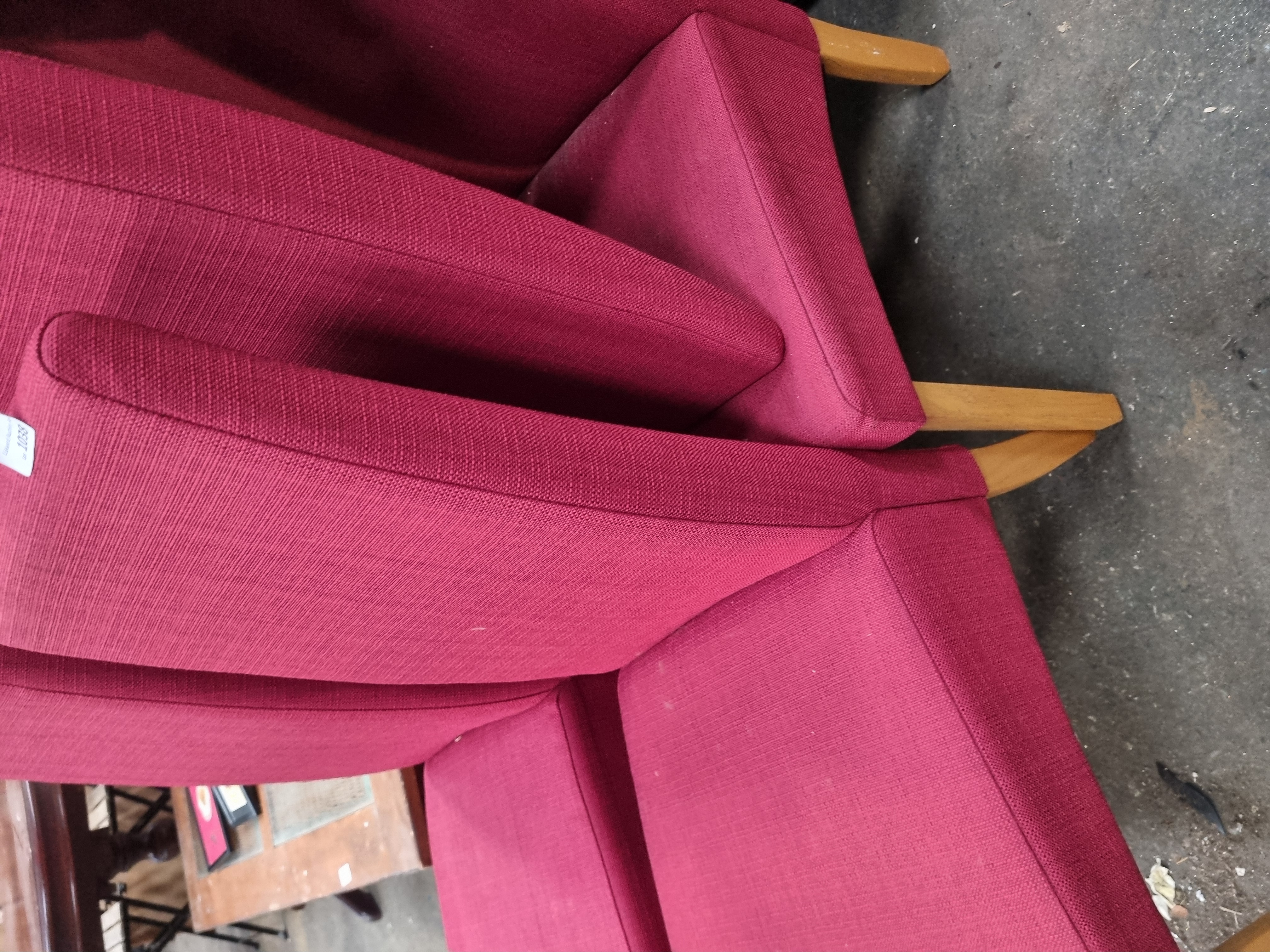 A set of six dining chairs in the mid-century modern style, featuring a clean, geometric silhouette. Each chair is designed with a high, slightly angled backrest and a square seat, both of which are fully upholstered. The chairs are supported by four tapered, splayed legs crafted from a light-toned hardwood finished with a clear lacquer. The undersides of the seats are fitted with black fabric dust covers. The upholstery consists of a durable, textured woven fabric in a deep red colour. A white adhesive auction lot label from Liskeard Auction Room, marked Lot 1038, is attached to the reverse of one chair.
