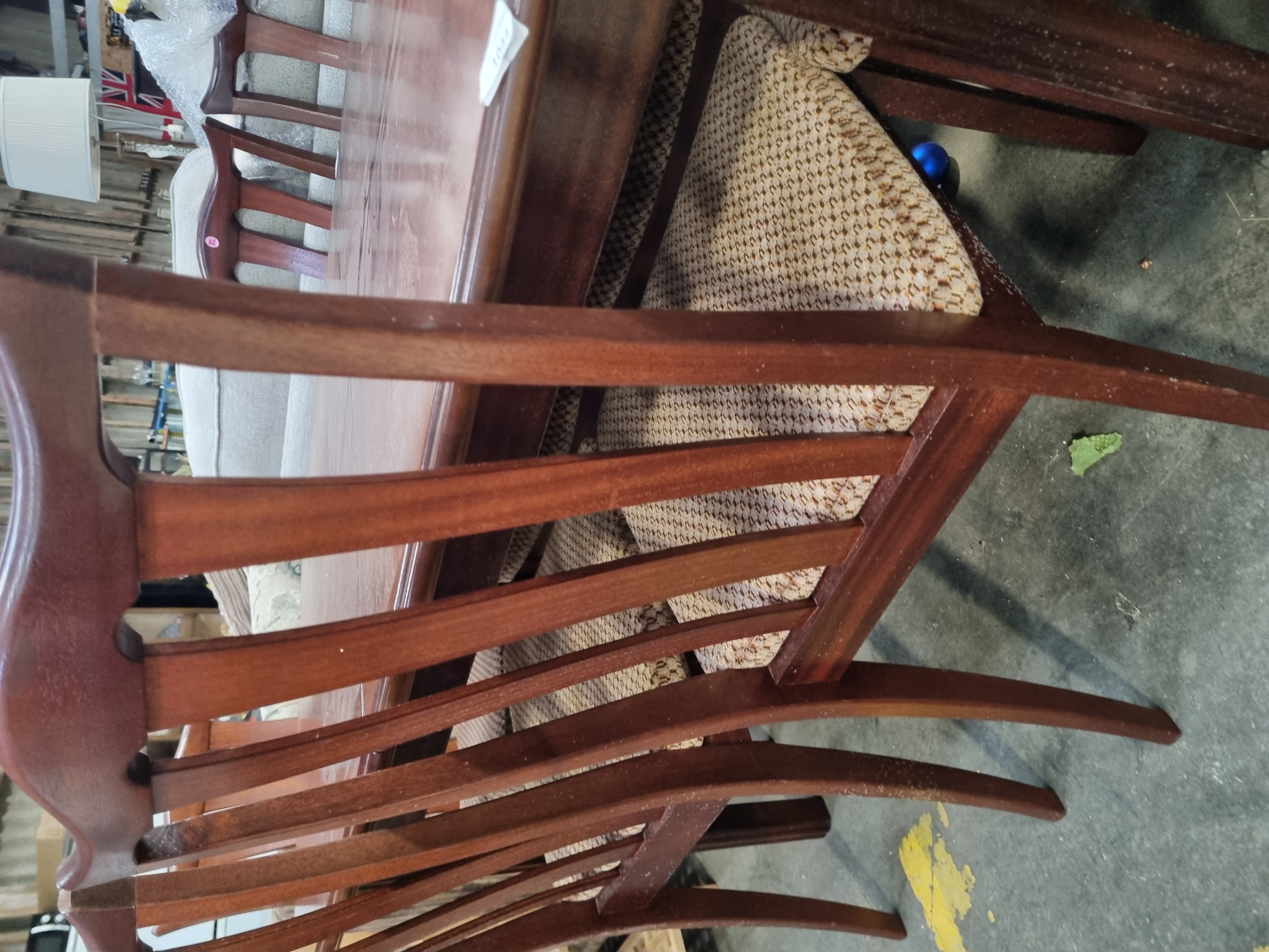 A G Plan mid-20th-century dining suite comprising an extending dining table and six matching chairs, including four side chairs and two carver armchairs. The table is constructed with a rectangular top featuring rounded corners and a book-matched veneer surface, supported on tapered faceted legs. The tabletop has a central seam for an extension mechanism. Each chair features a curved backrest with four vertical slats and a padded seat upholstered in a neutral-coloured, patterned fabric, matching the table legs with a tapered and faceted design. No manufacturer marks are visible; the item bears auction identification labels including Lot 1044 from Liskeard Auction Rooms.