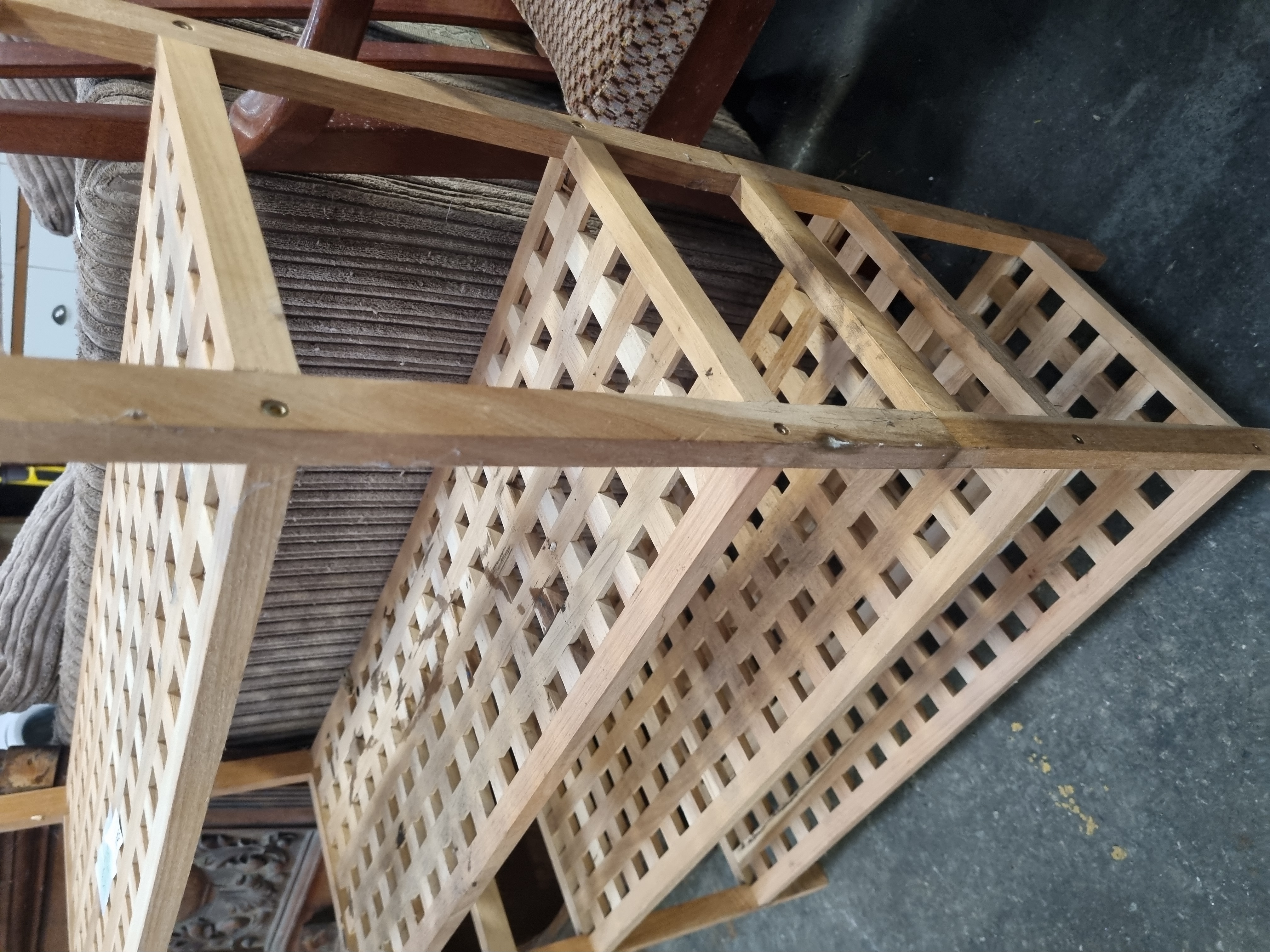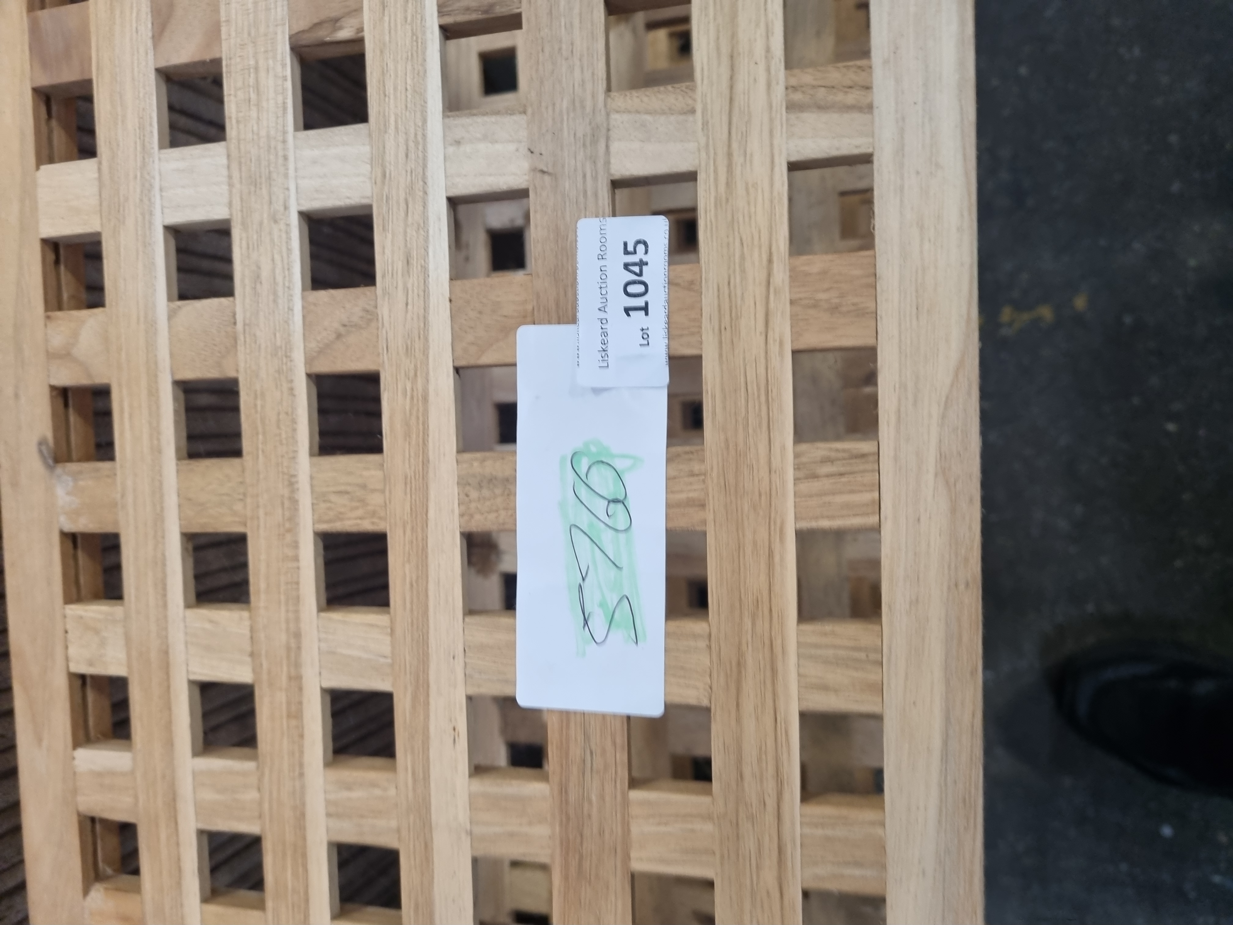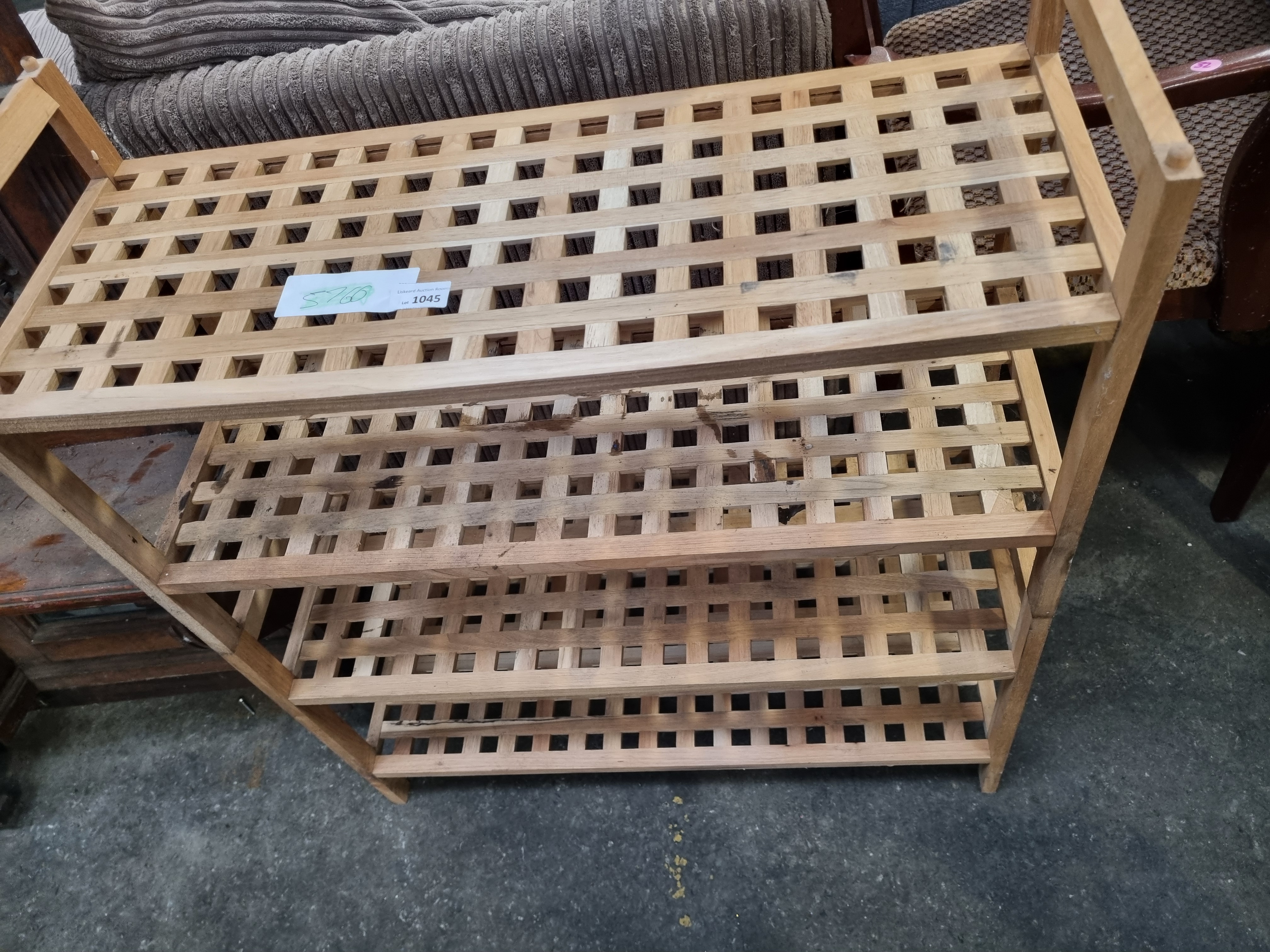 This contemporary four-tier open shelving unit is a vidaXL solid walnut wood shoe rack. The piece is constructed from solid walnut with a natural finish, featuring a functional, minimalist aesthetic. The design consists of four fixed tiers, each comprising an open square-lattice shelf set within a square-profile frame. The side supports are joined with visible screw fixings. The unit is of fixed construction and is not designed to be sectional or adjustable. Two paper auction tags are present on the top shelf, including one from Liskeard Auction Rooms marked as Lot 1045.