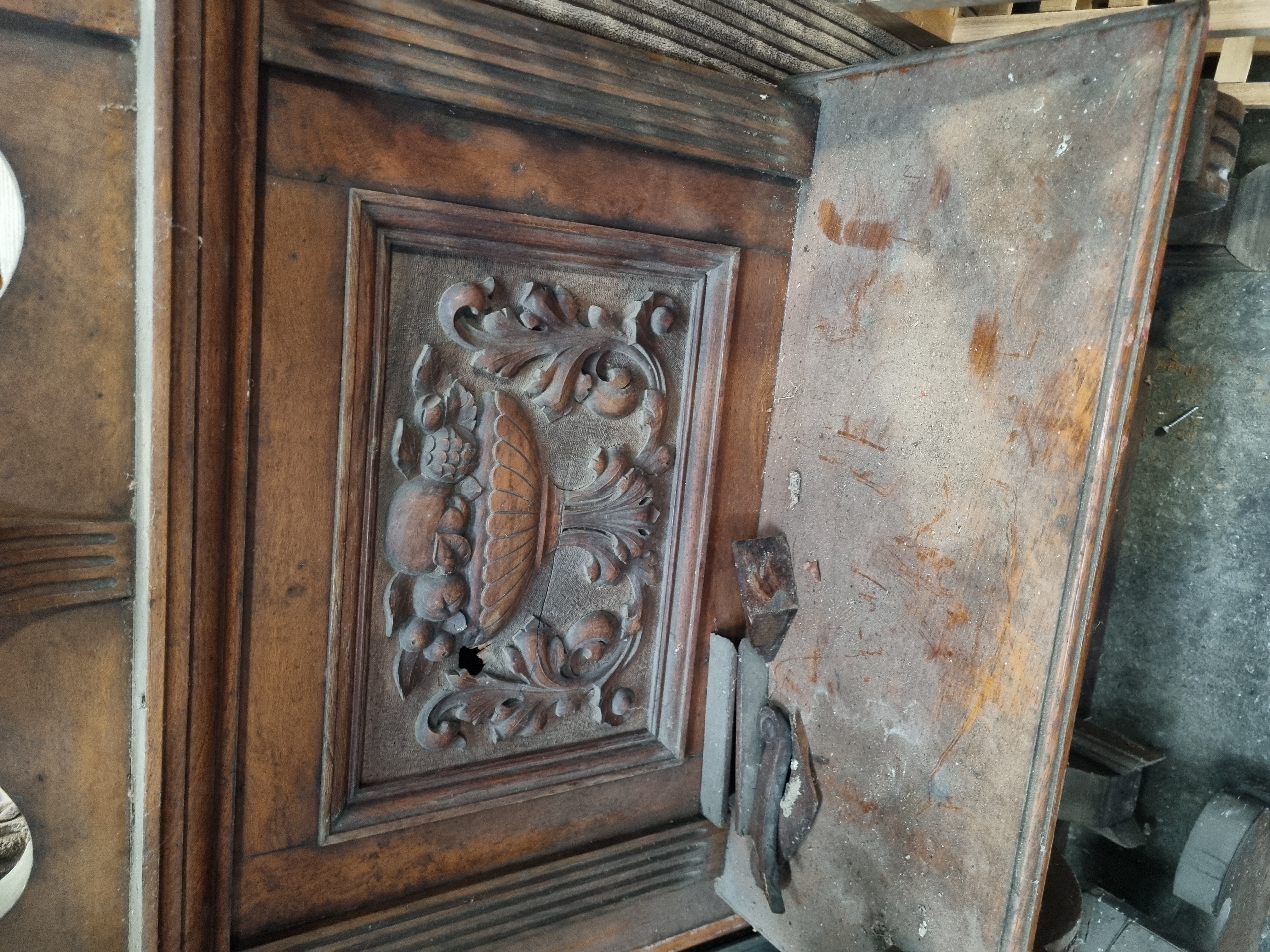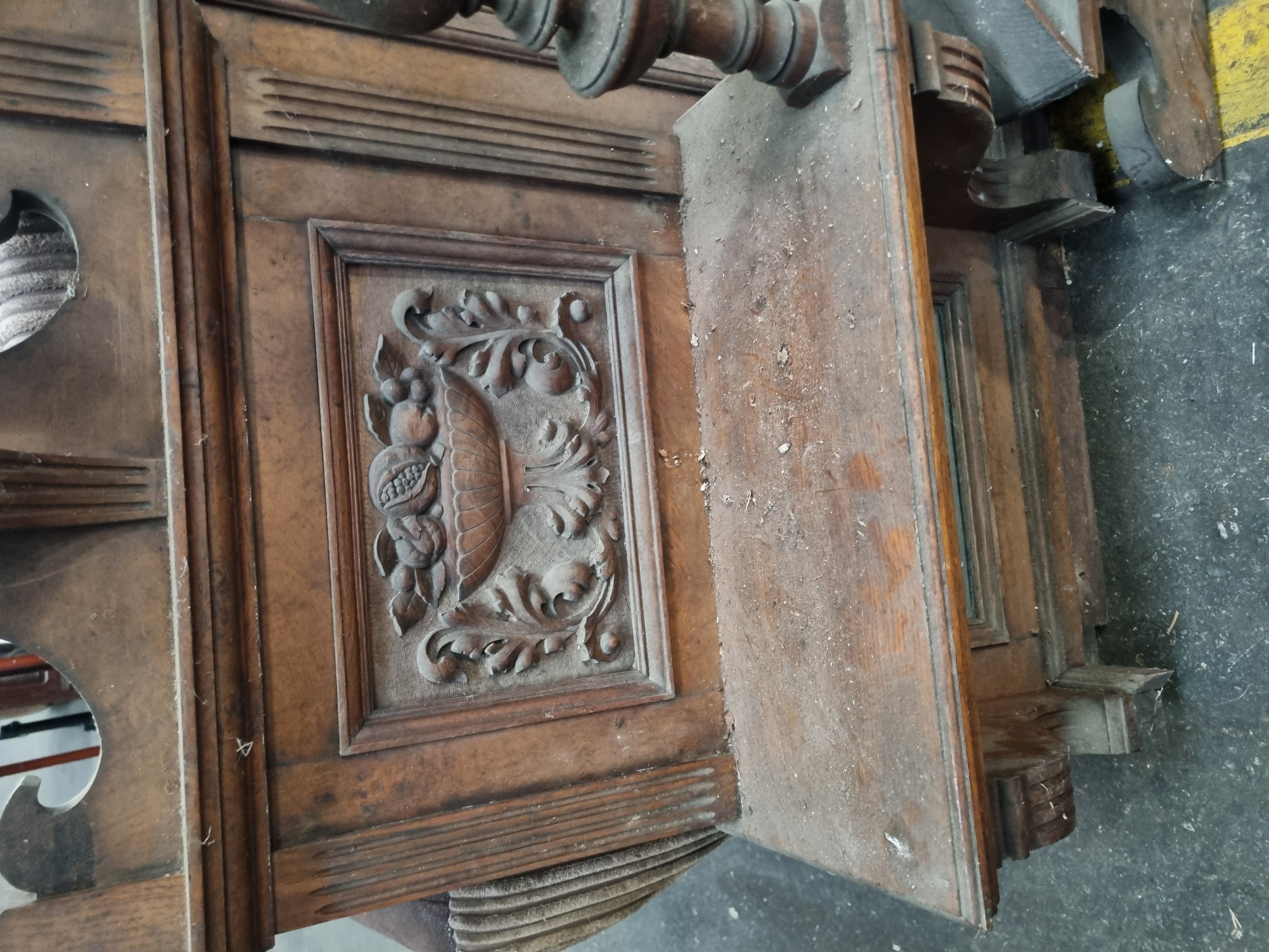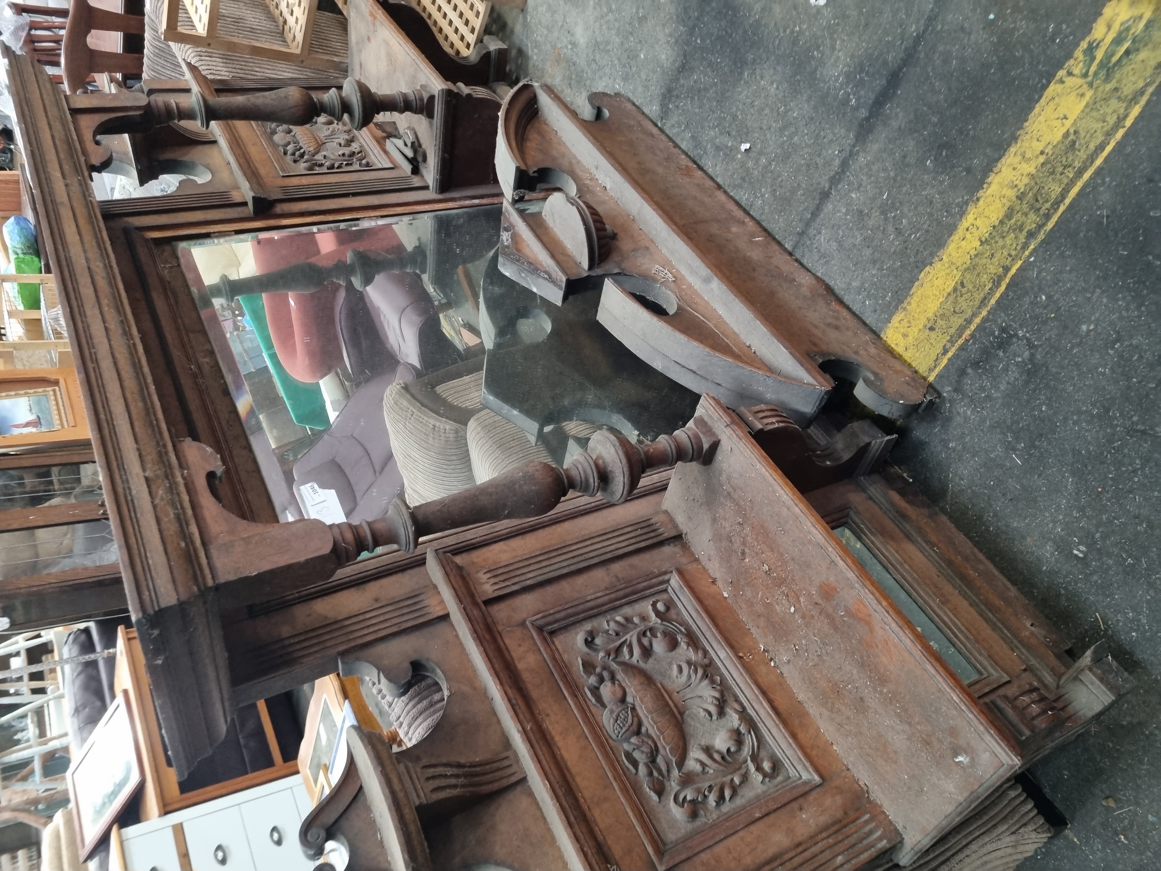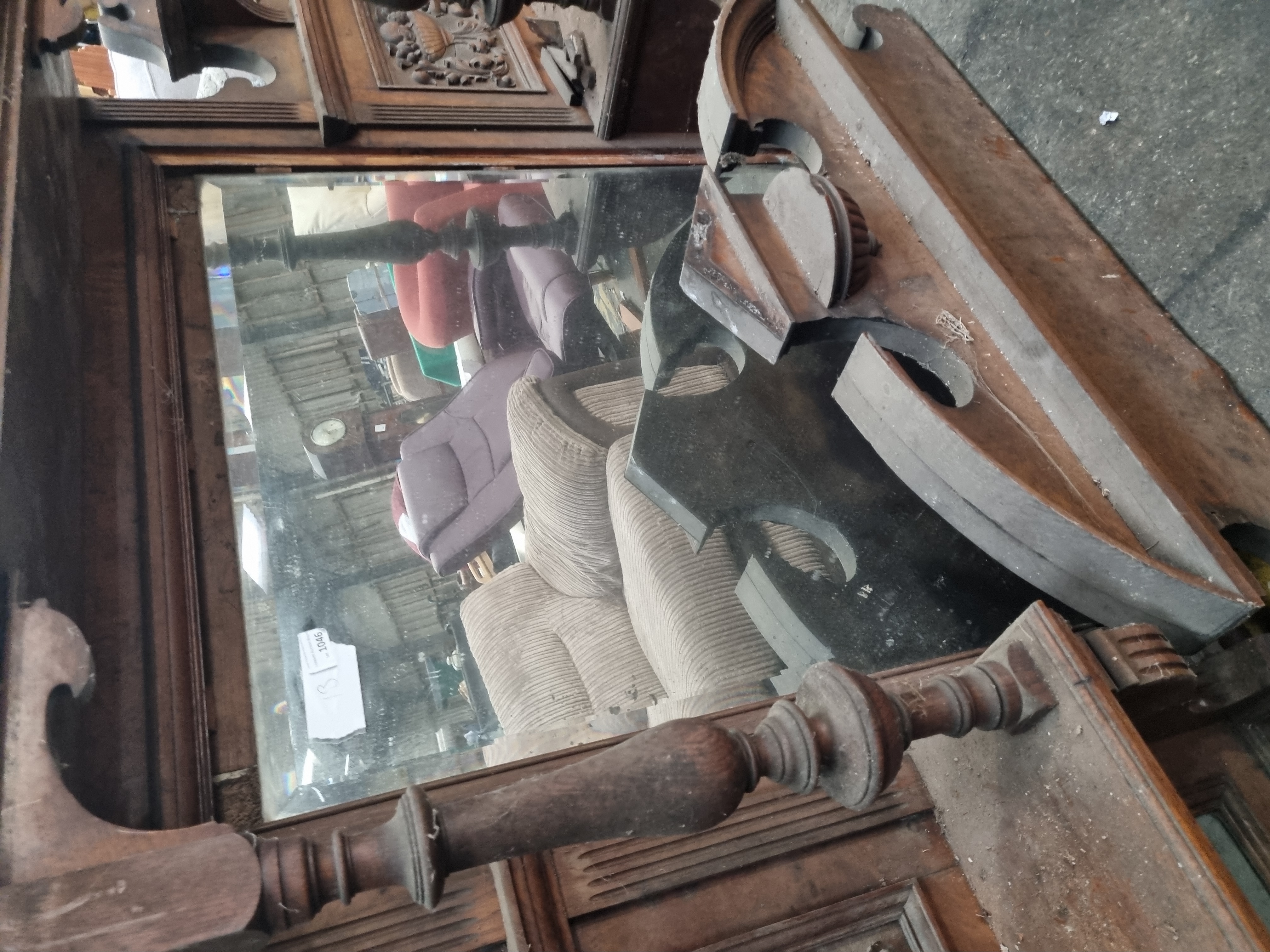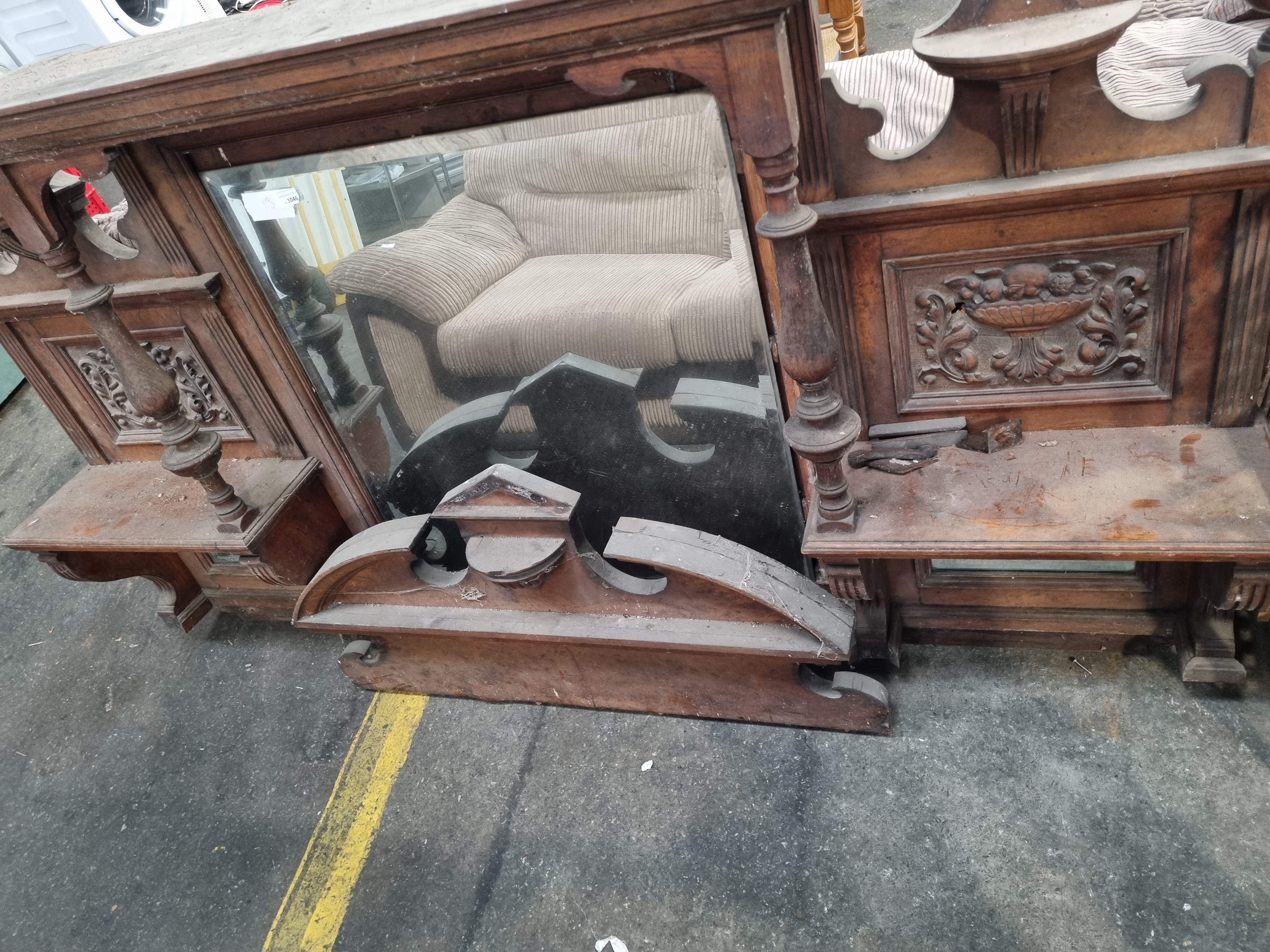 A Victorian walnut mirrored-back sideboard superstructure, currently in a disassembled state. The piece features a central rectangular mirror plate flanked by two small display shelves supported by turned baluster-form columns. The structure is decorated with two deeply carved panels depicting fruit baskets and cornucopia motifs within moulded frames. The construction consists of solid walnut panels with applied decorative elements. A scrolled, arched pediment is present but detached and broken into multiple components. The mirror plate is set within a simple moulded frame. An auction label is affixed to the mirror glass, printed with Liskeard Auction Room, Lot 1046, and a handwritten number 13.
