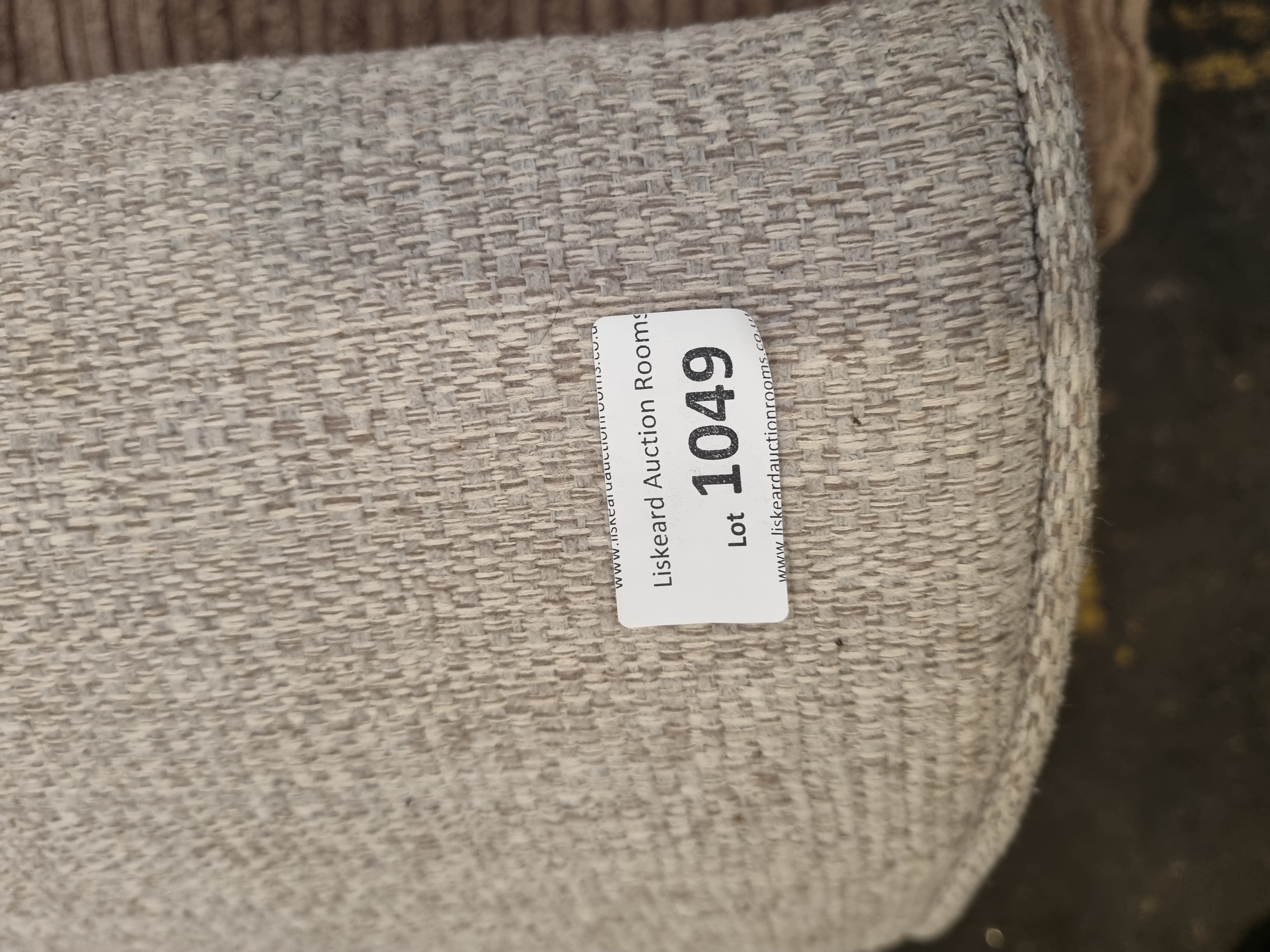 A contemporary two-seater sofa or loveseat upholstered in a light grey salt and pepper textured woven fabric. The piece features square track arms and a fully upholstered frame. It is configured with four loose cushions, consisting of two seat cushions and two back cushions. The back cushions are detailed with double button-tufting, and all cushions are finished with piped edges. A white adhesive auction label from Liskeard Auction Rooms is present on the right arm, marked as Lot 1049.