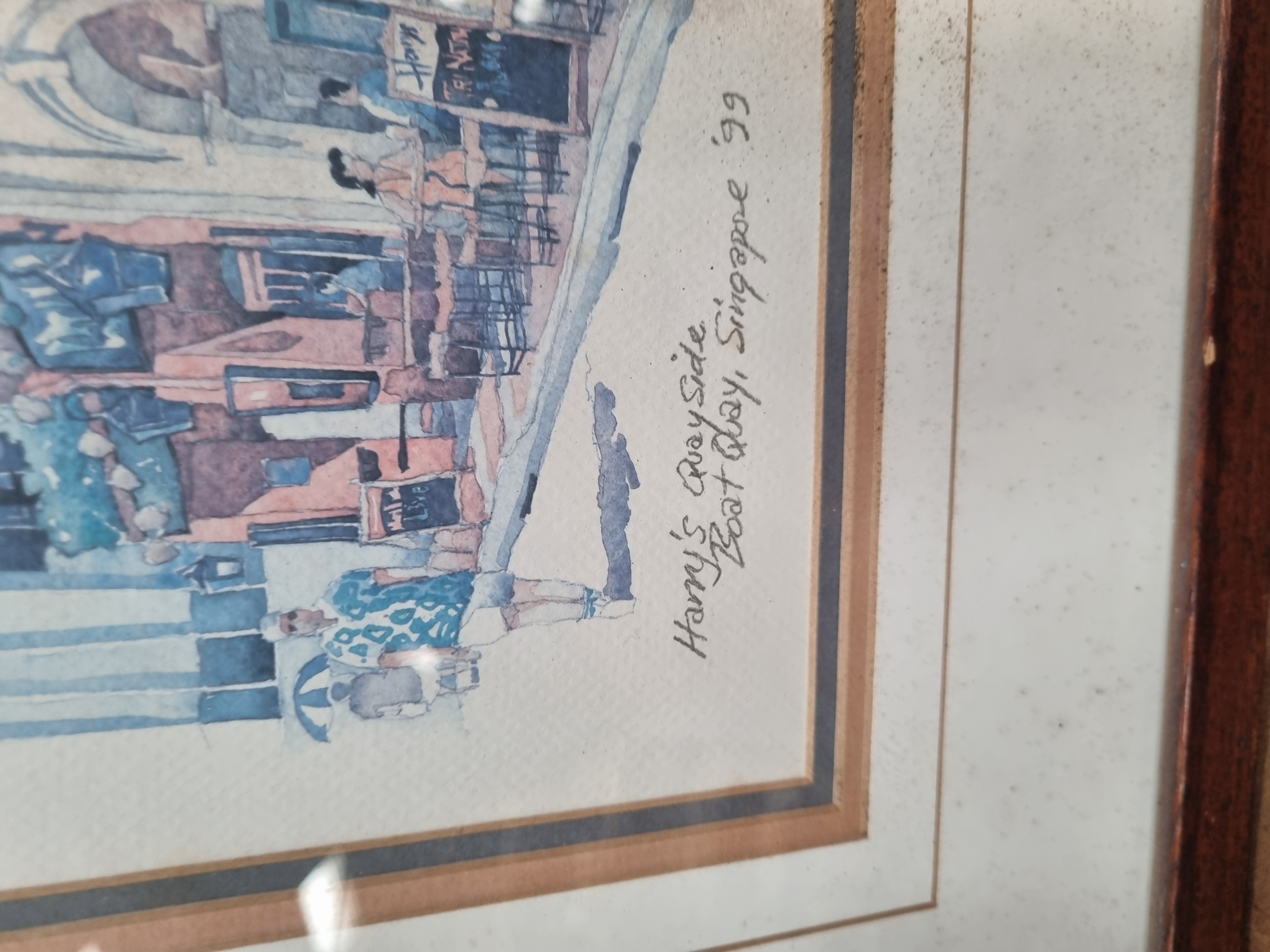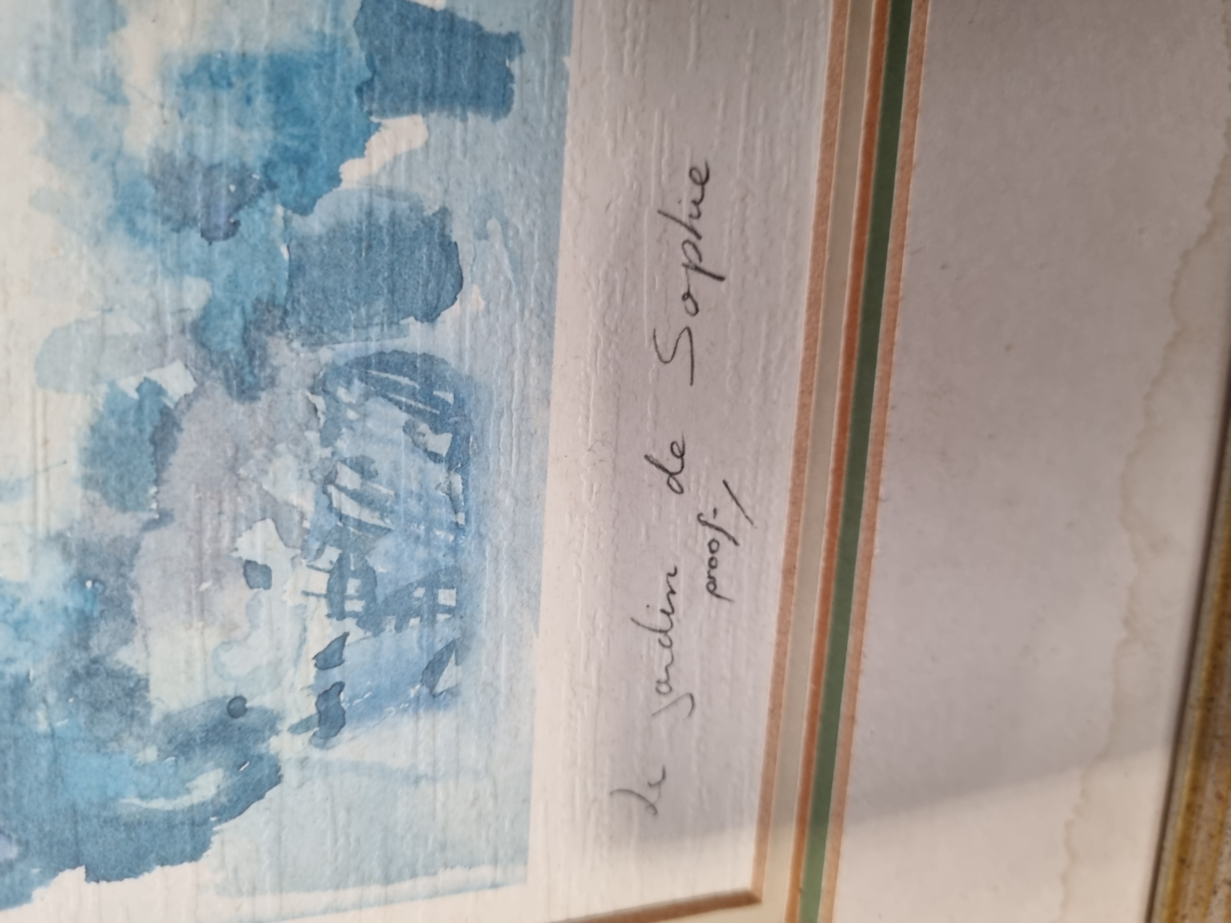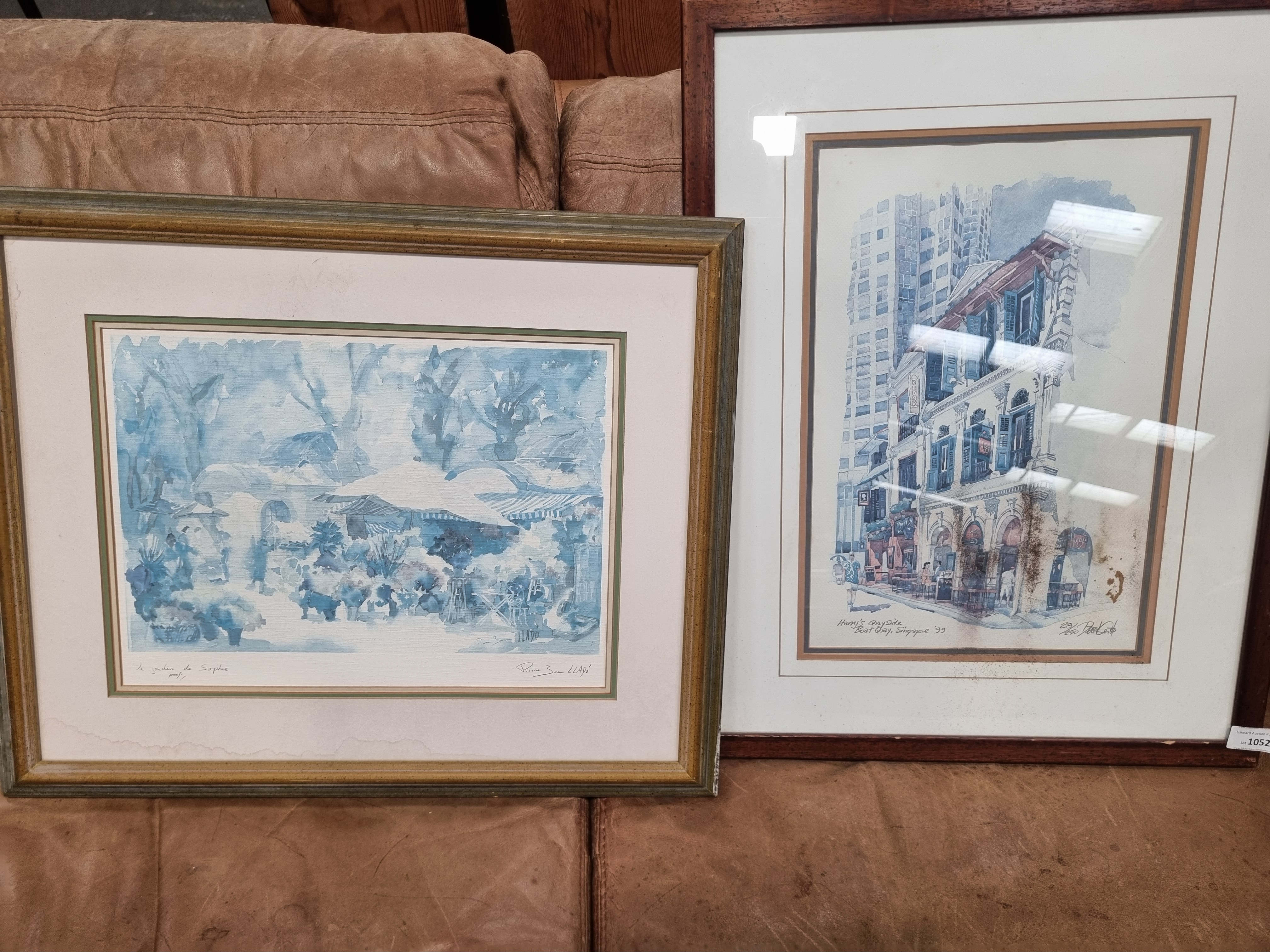 This lot features two framed prints based on original watercolour paintings. The first work, by David Purkess, depicts a bustling street scene in Singapore and is inscribed Harry’s Quayside, Boat Quay, Singapore ’99 and 28/250. The second work, by Pierre Jean Llado, is a monochromatic blue composition of a garden scene inscribed le jardin de Sophie and marked proof/. Both pieces are executed on wove paper and are set behind glass within multi-layered mounts and wooden frames. The Purkess print is a limited edition, while the Llado print is designated as a proof.