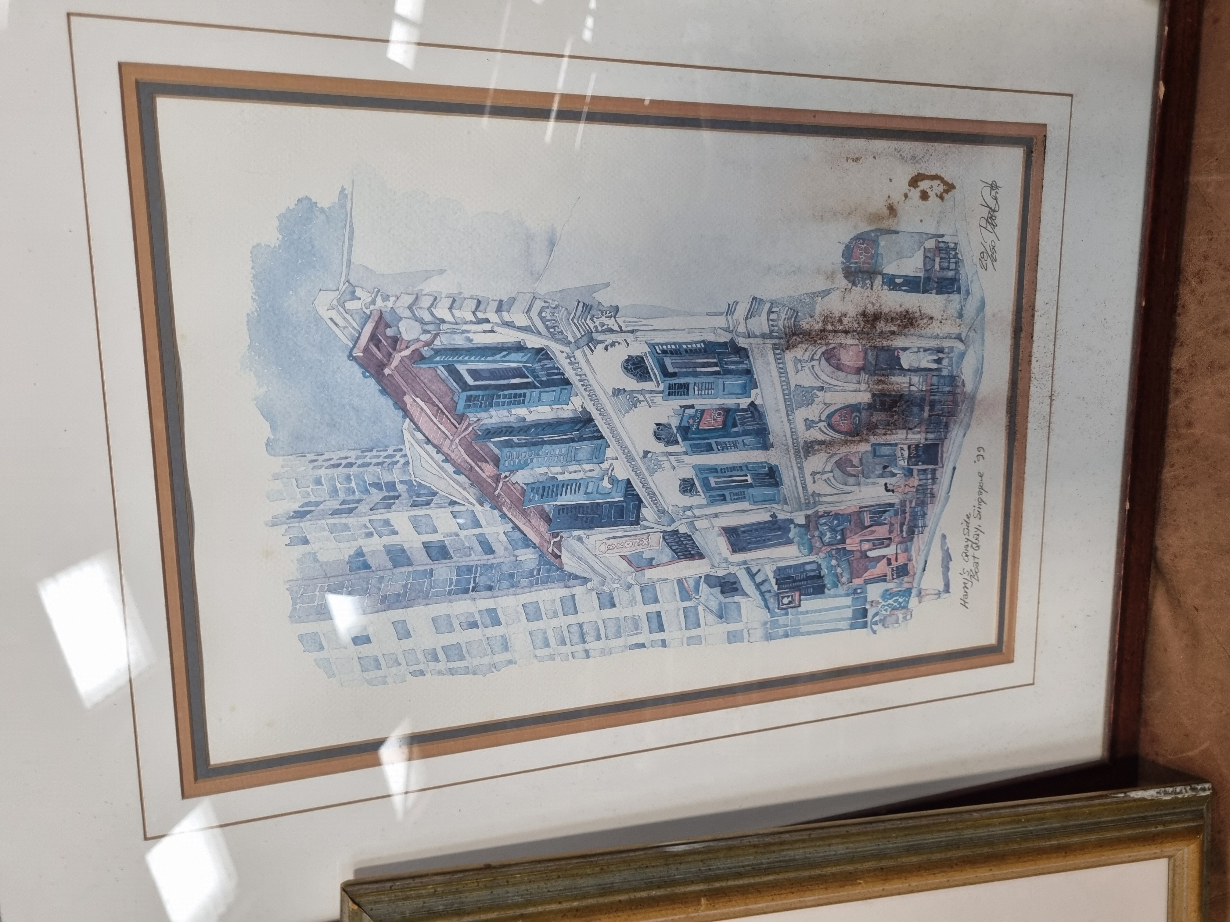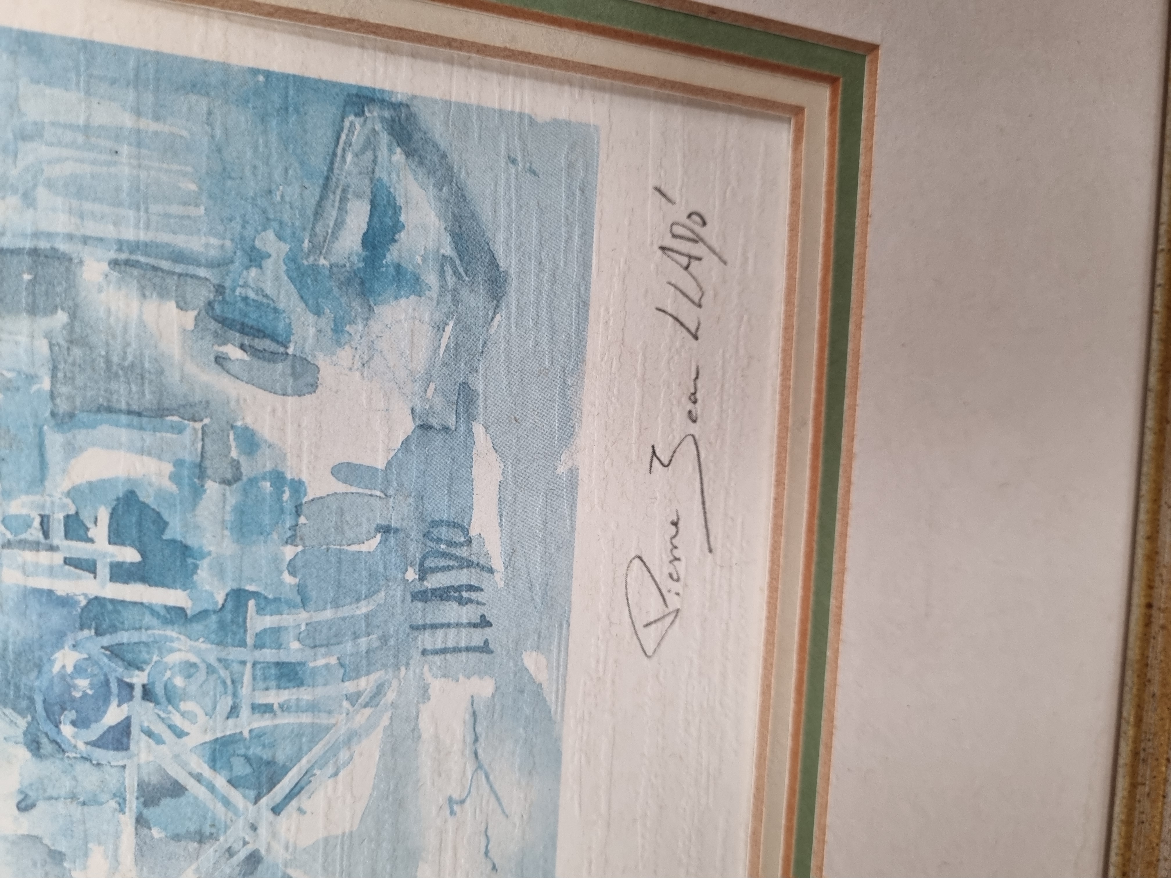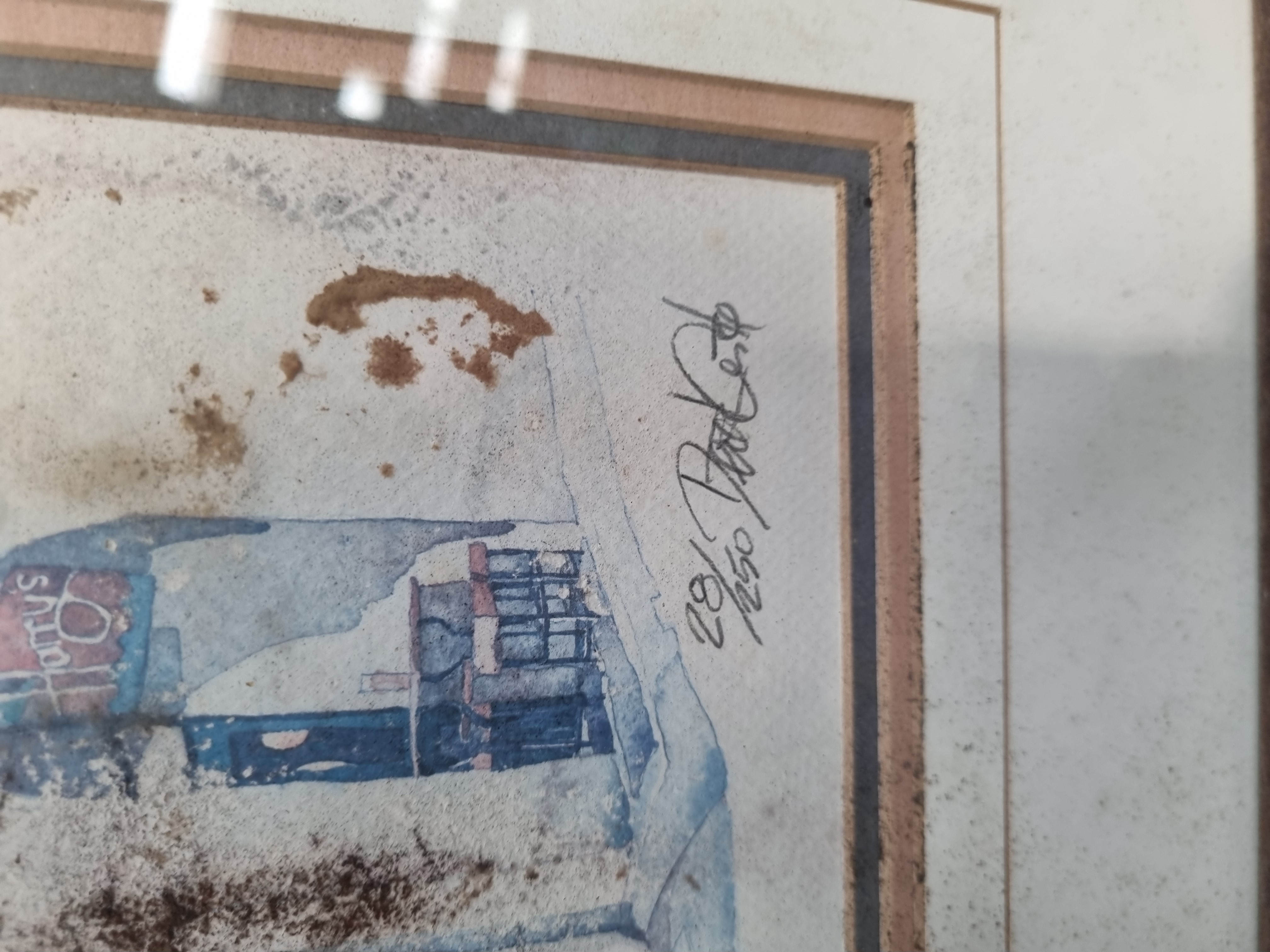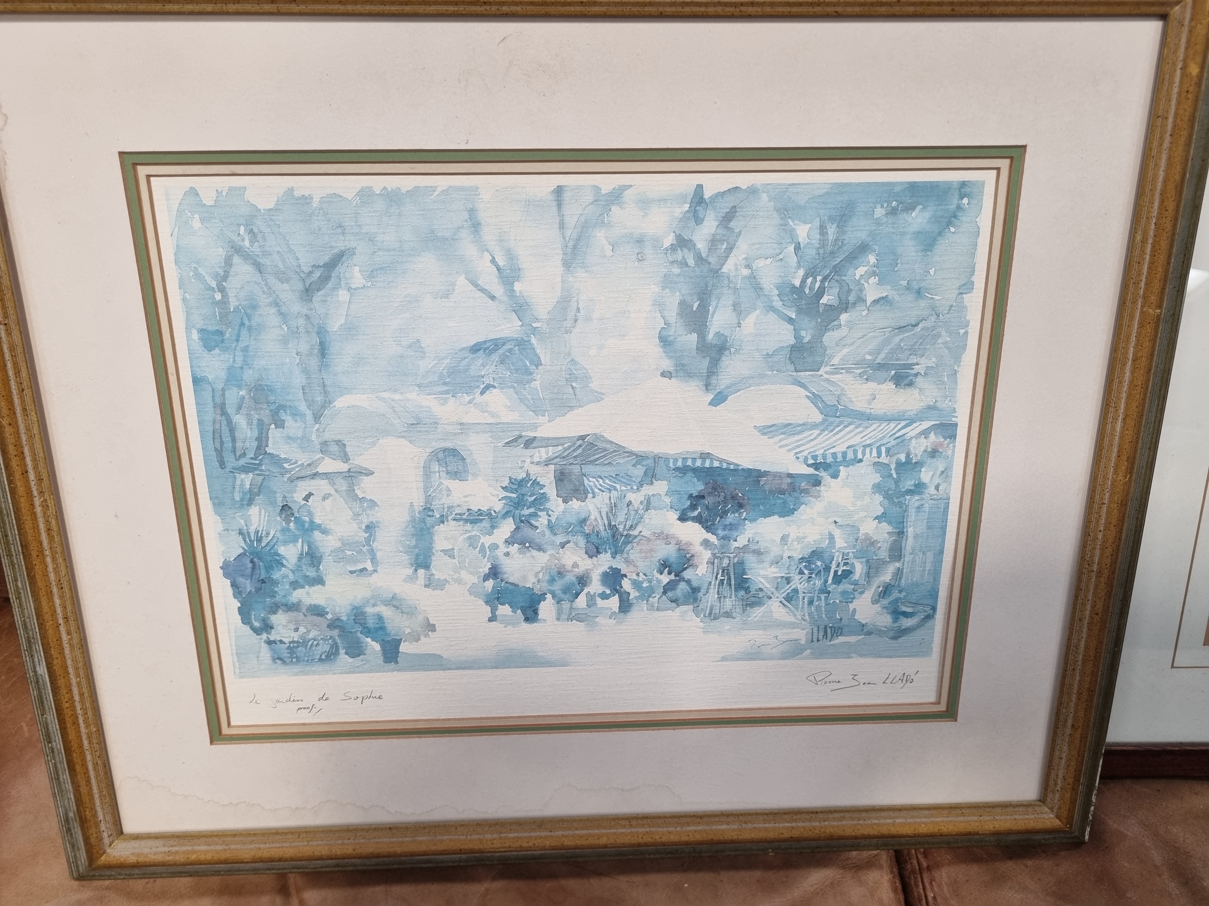 This lot features two framed prints based on original watercolour paintings. The first work, by David Purkess, depicts a bustling street scene in Singapore and is inscribed Harry’s Quayside, Boat Quay, Singapore ’99 and 28/250. The second work, by Pierre Jean Llado, is a monochromatic blue composition of a garden scene inscribed le jardin de Sophie and marked proof/. Both pieces are executed on wove paper and are set behind glass within multi-layered mounts and wooden frames. The Purkess print is a limited edition, while the Llado print is designated as a proof.