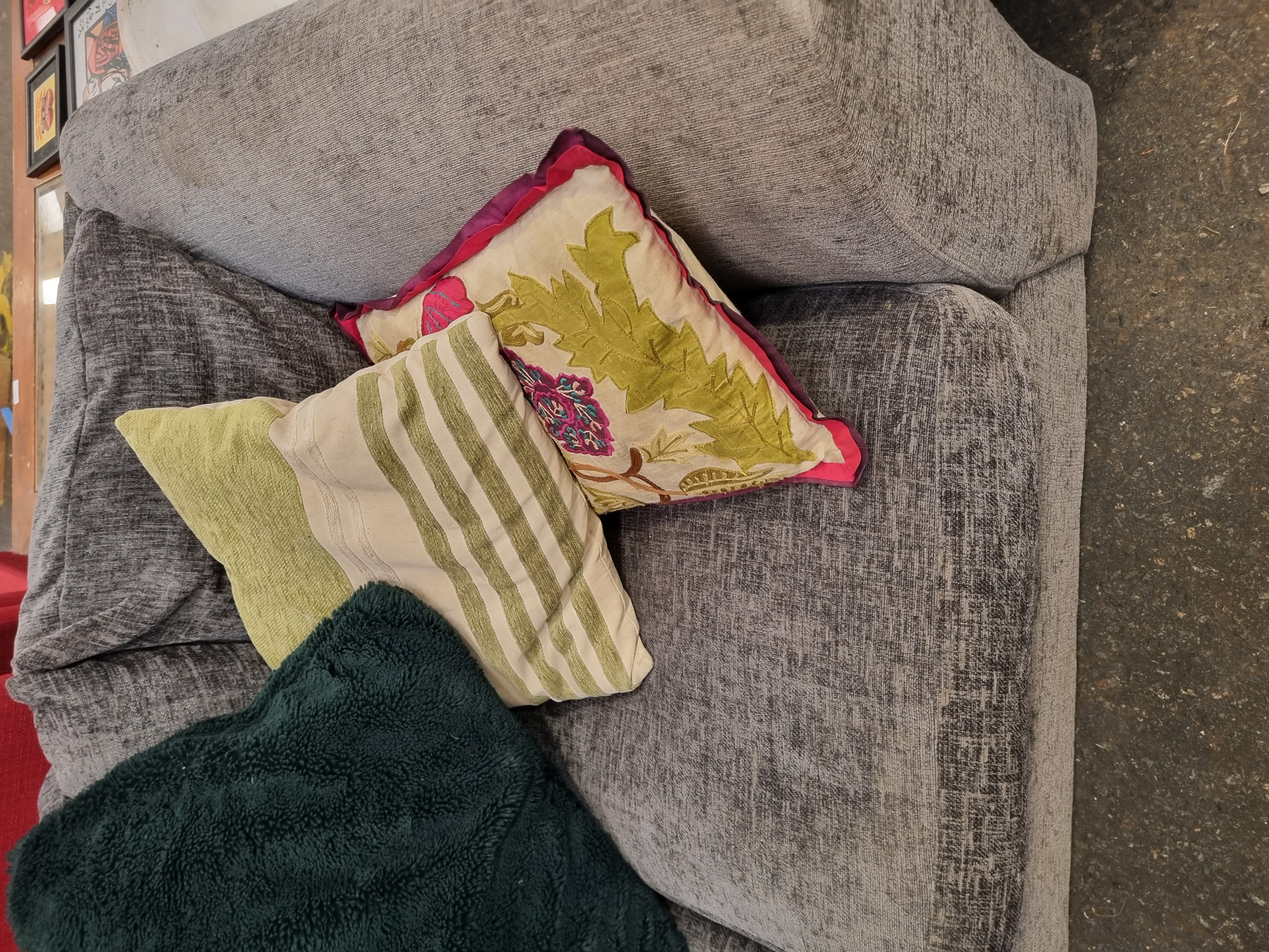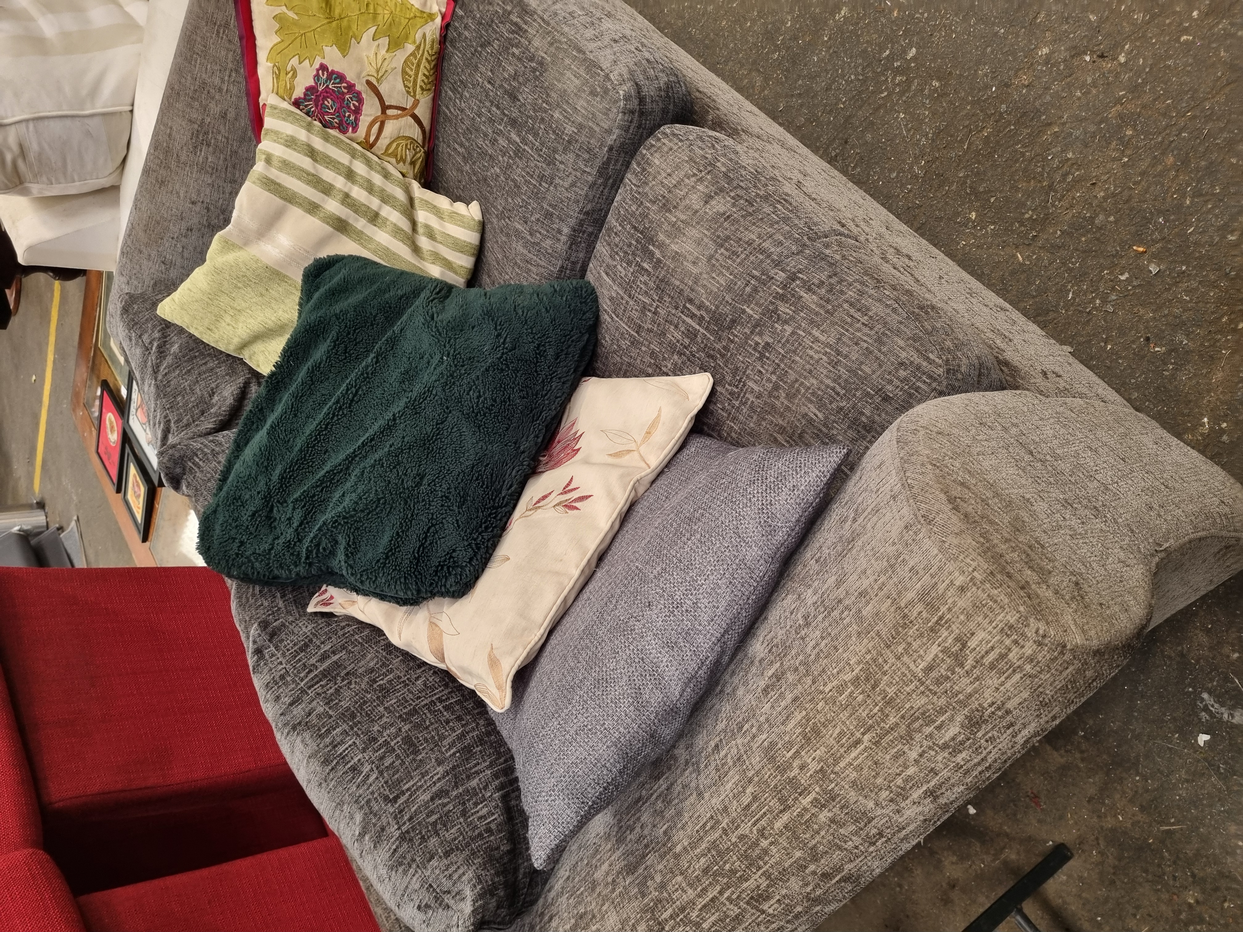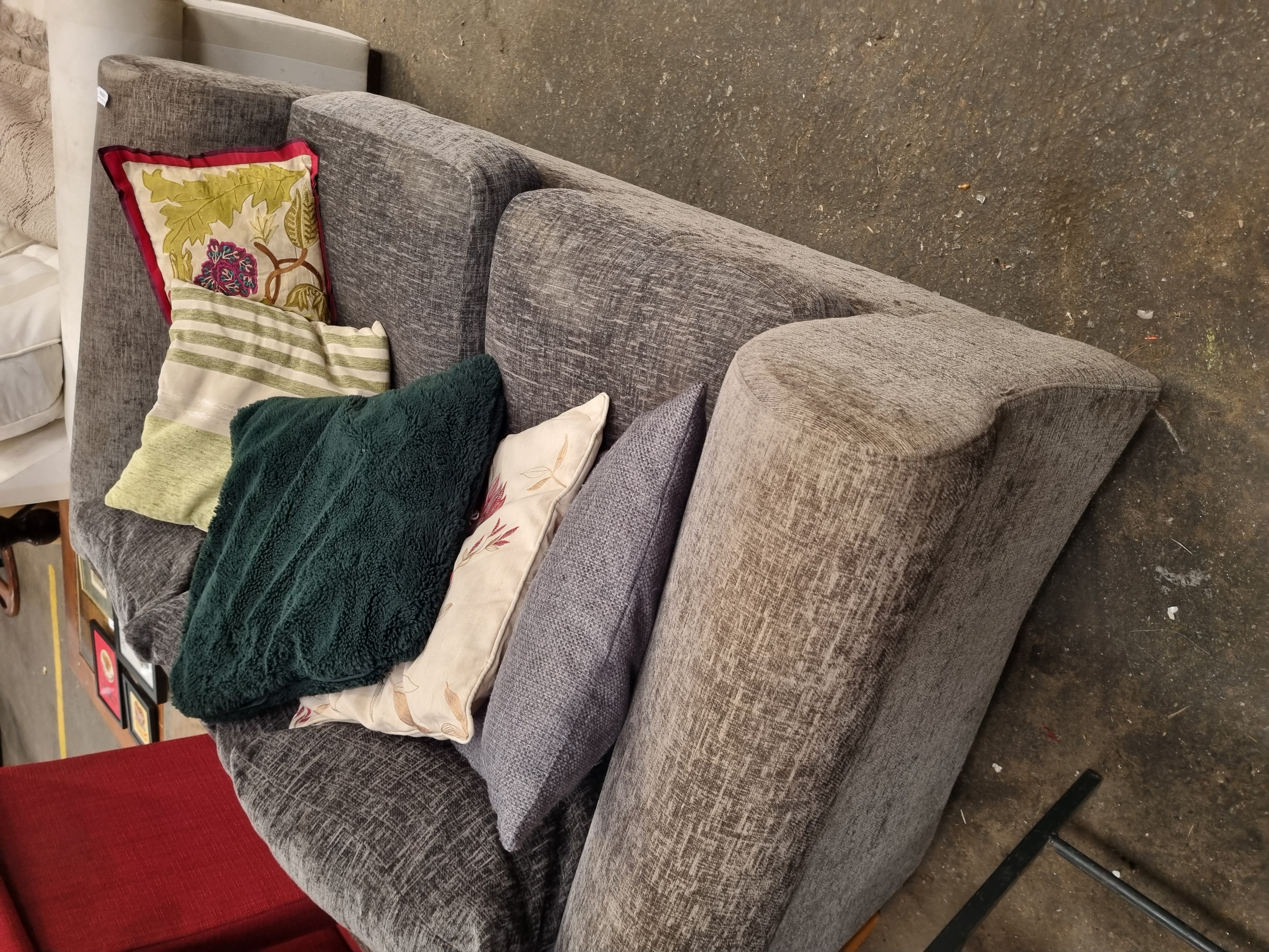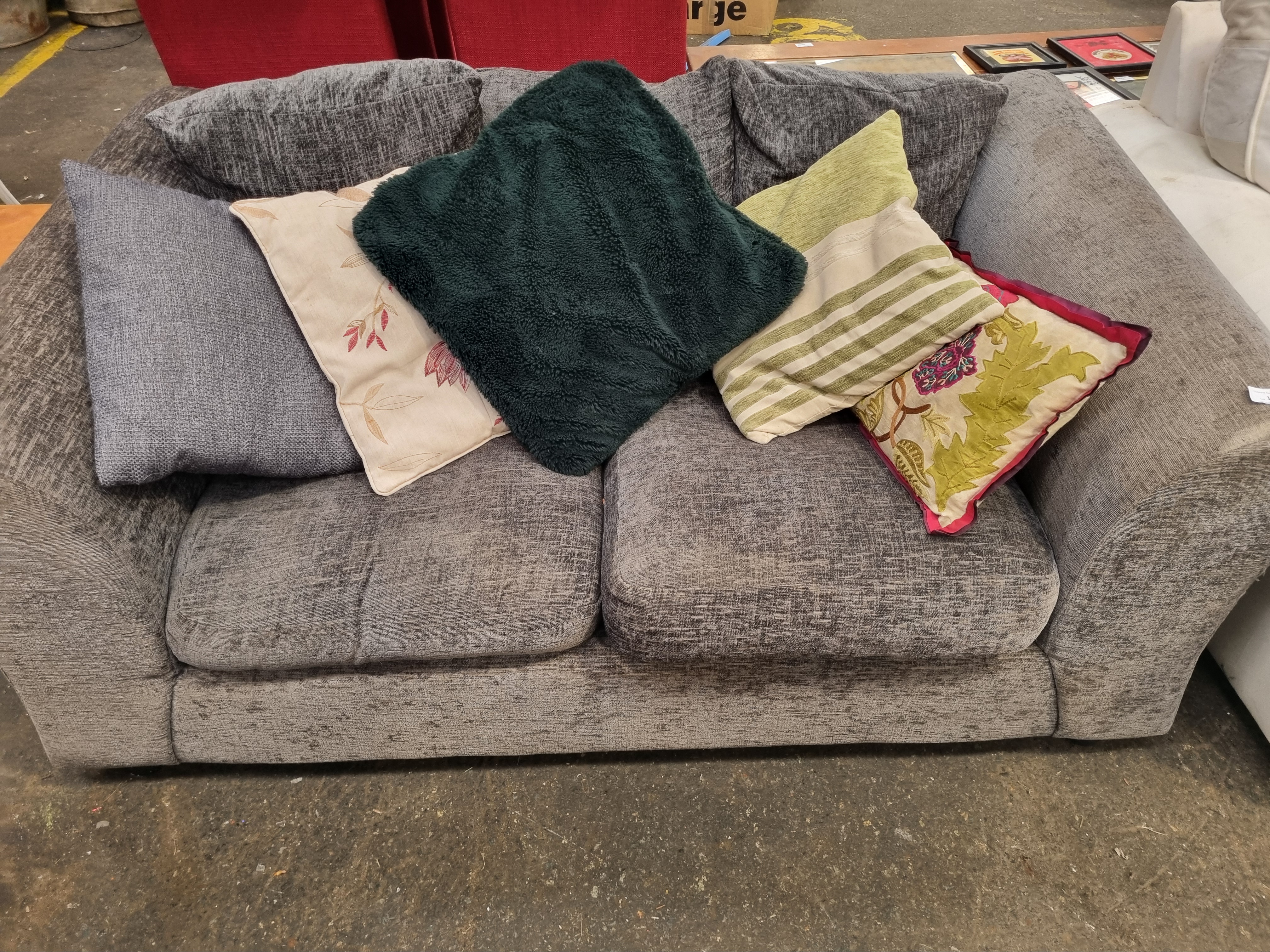 Lot 1053: Contemporary Grey Textured Fabric Two-Seater Loveseat with Assorted Scatter Cushions