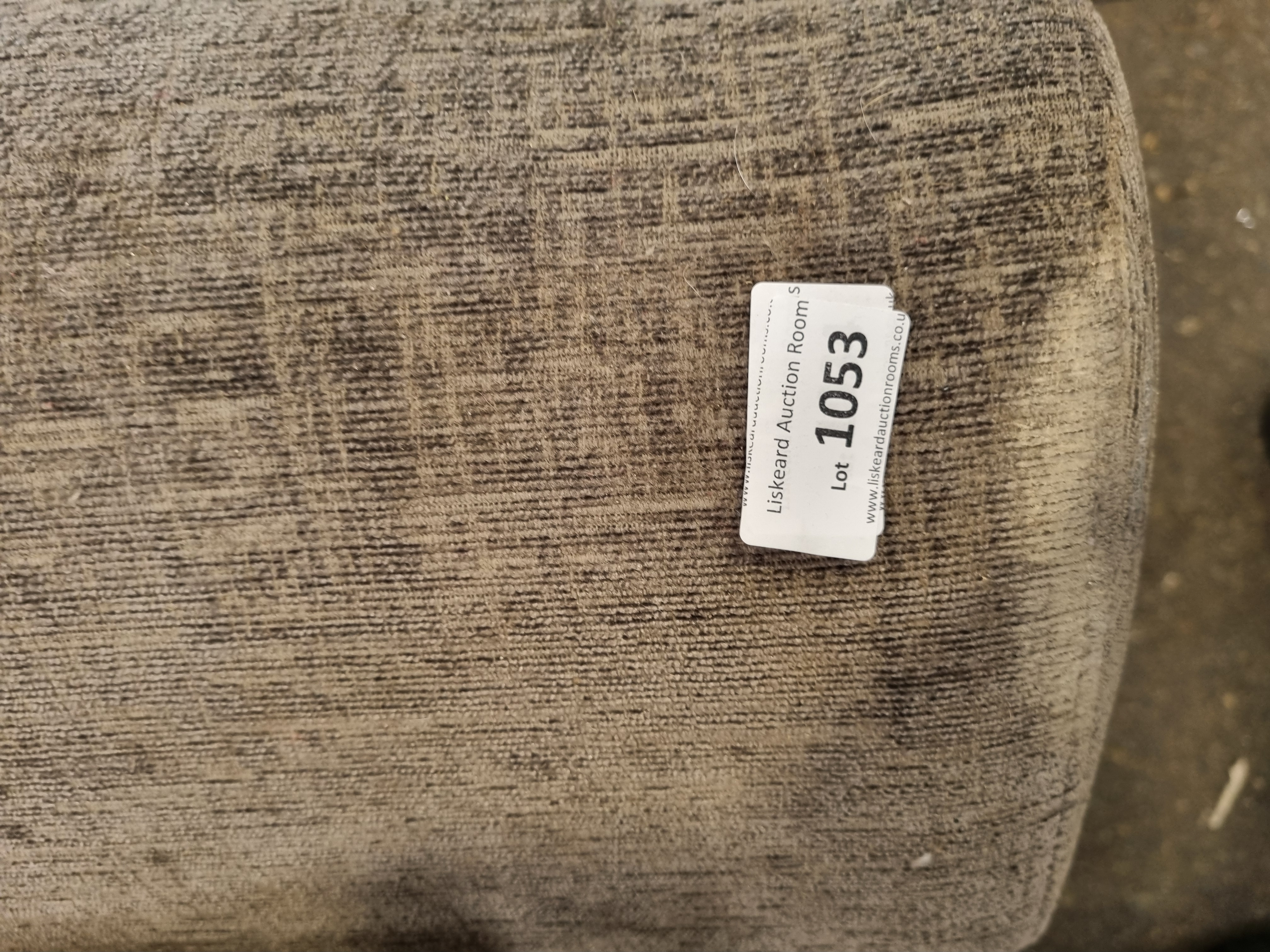 A contemporary two-seater loveseat upholstered in a grey textured marl fabric, likely a synthetic blend. The sofa features a low-profile design with wide, flared arms. It is constructed with two large integrated back cushions and two rectangular seat cushions. Included with the sofa is an assortment of five scatter cushions consisting of one matching grey fabric cushion, one cream cushion with a red floral print, one dark green shaggy faux-fur cushion, one green and cream striped cushion, and one cream cushion with embroidered leaf motifs and red piping. A white adhesive lot sticker from Liskeard Auction Rooms, identifying the piece as Lot 1053, is present on the right arm.