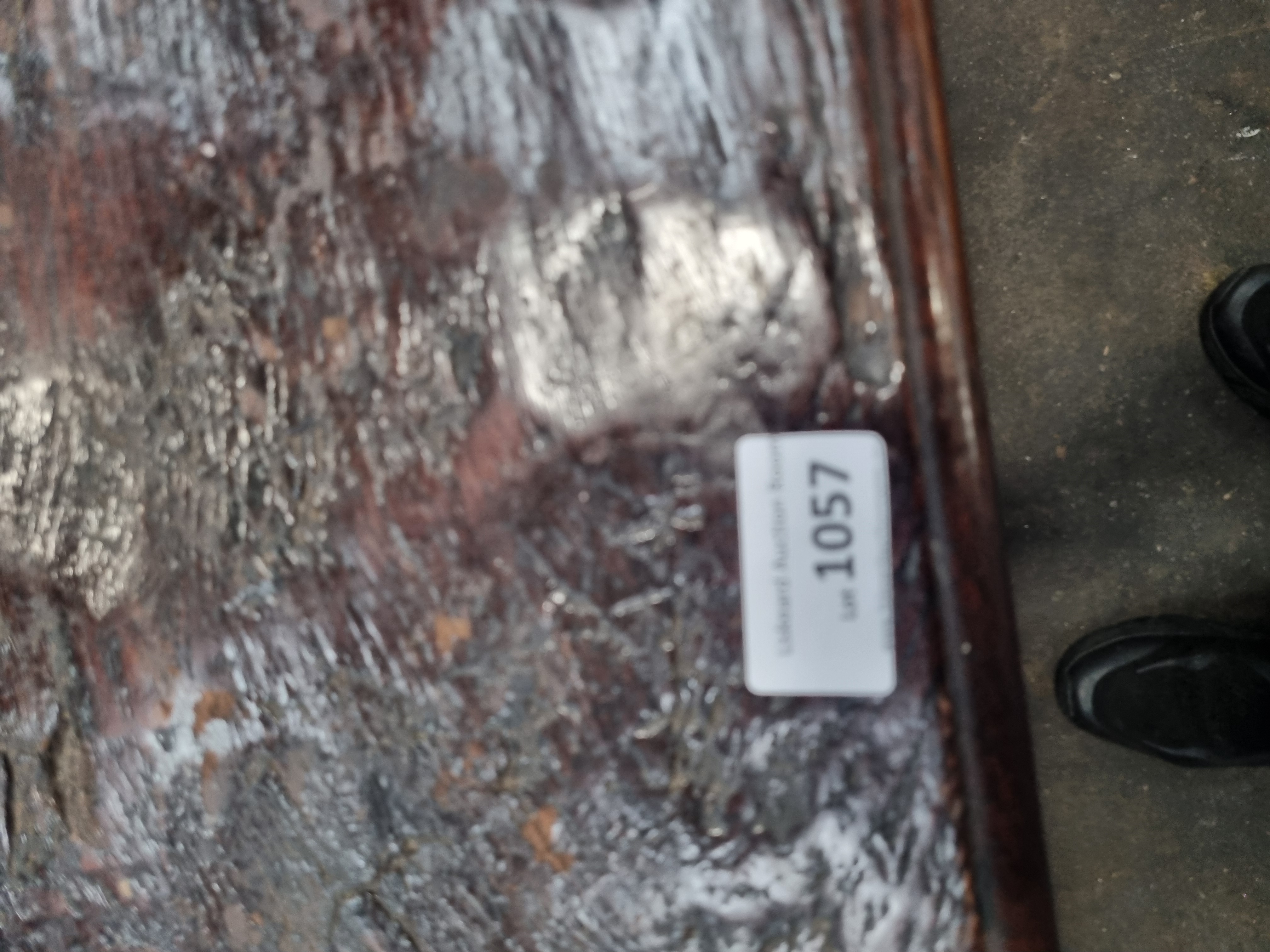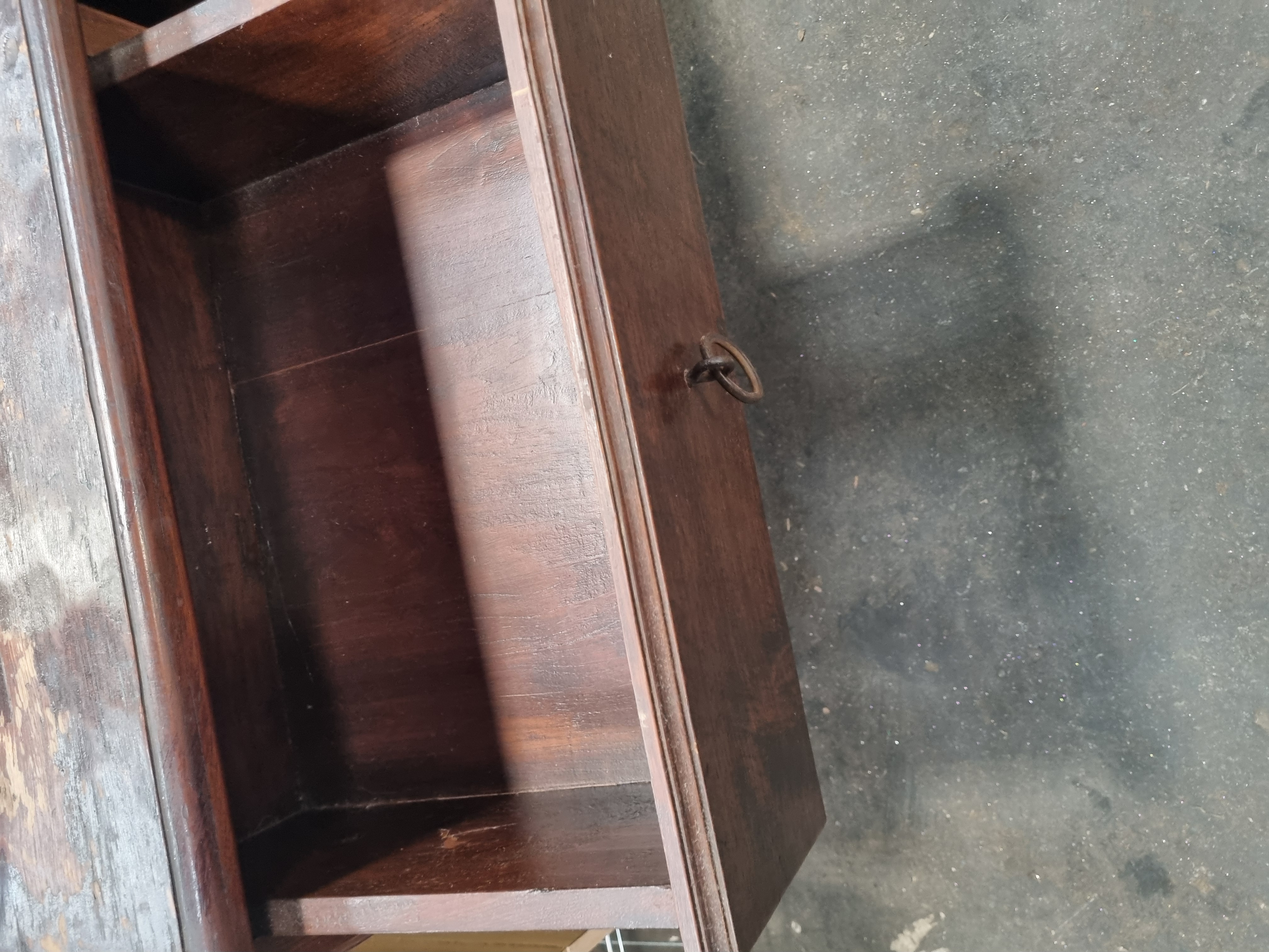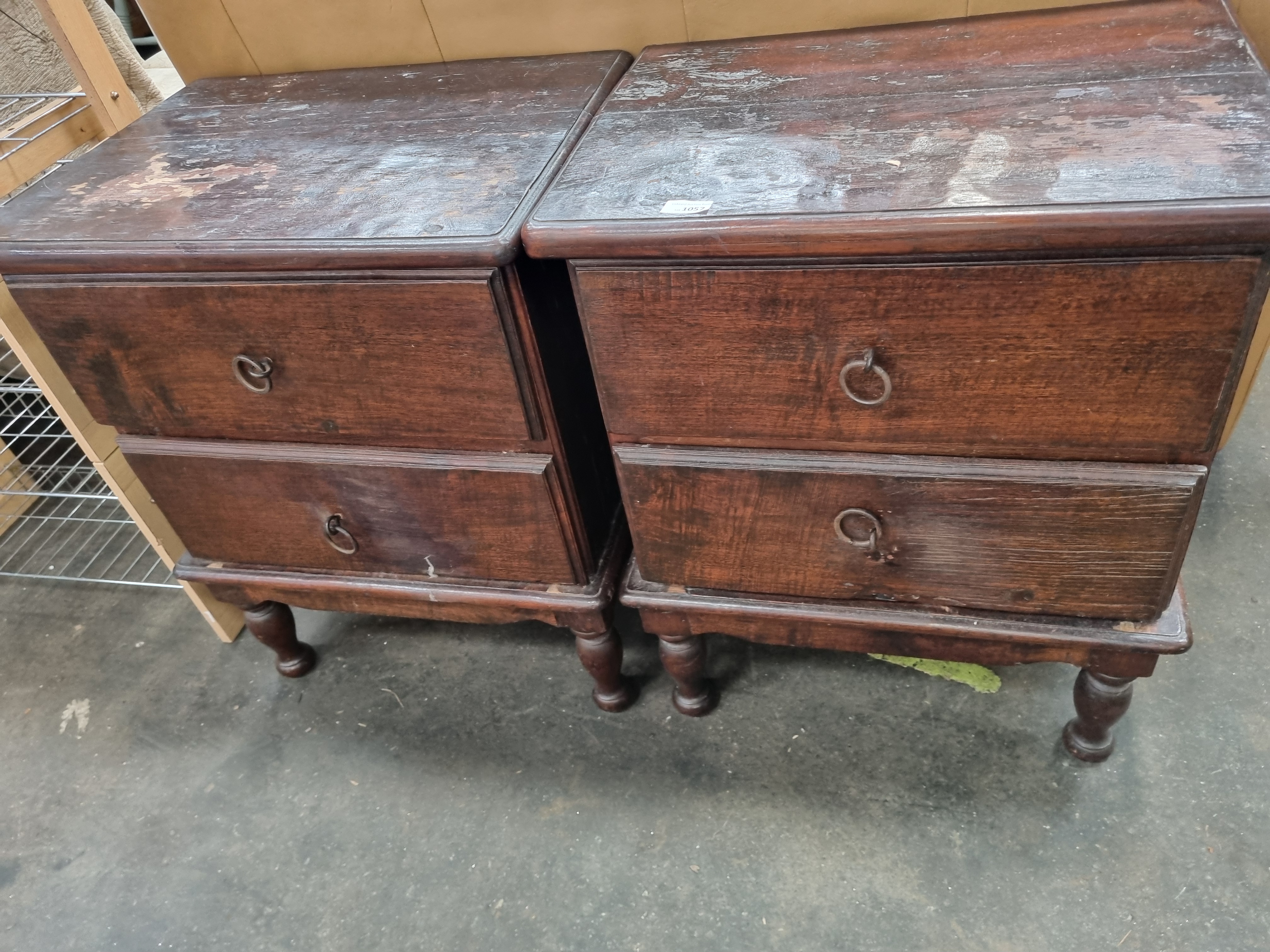 A pair of small two-drawer chests in the Jacobean style, constructed from solid oak with a dark-stained finish. Each chest features two full-width drawers with thick plank-style fronts. The hardware consists of a single centrally-mounted iron ring pull on each drawer. The units are supported on four stout, turned baluster-form feet. The drawer interiors are constructed of solid secondary timber, stained to match the primary wood. The tops are formed from heavy planks with a moulded edge. The design is characteristic of provincial or country-made furniture. No maker marks or stamps are visible; however, an auction lot sticker numbered 1057 is present on the top surface.