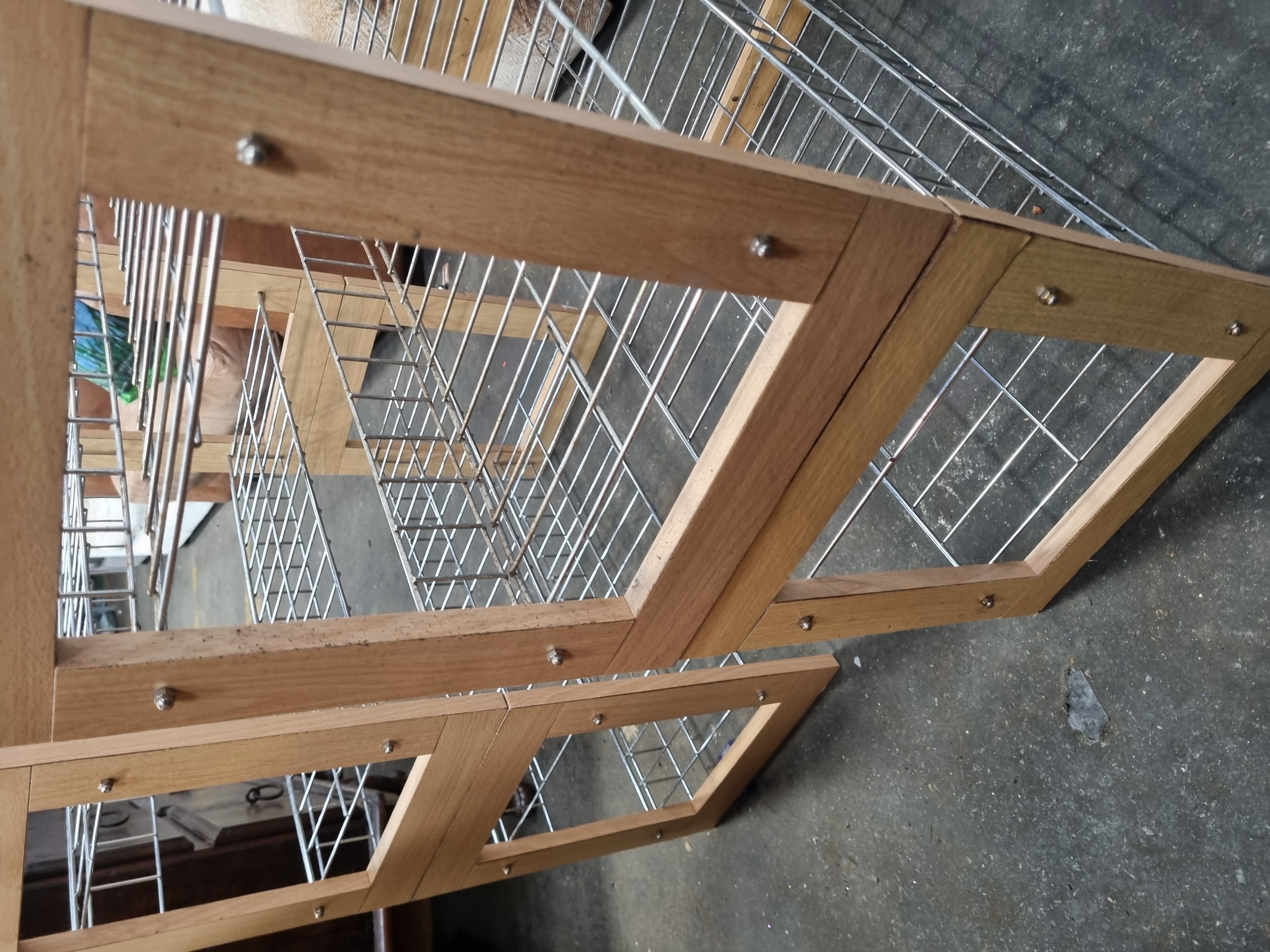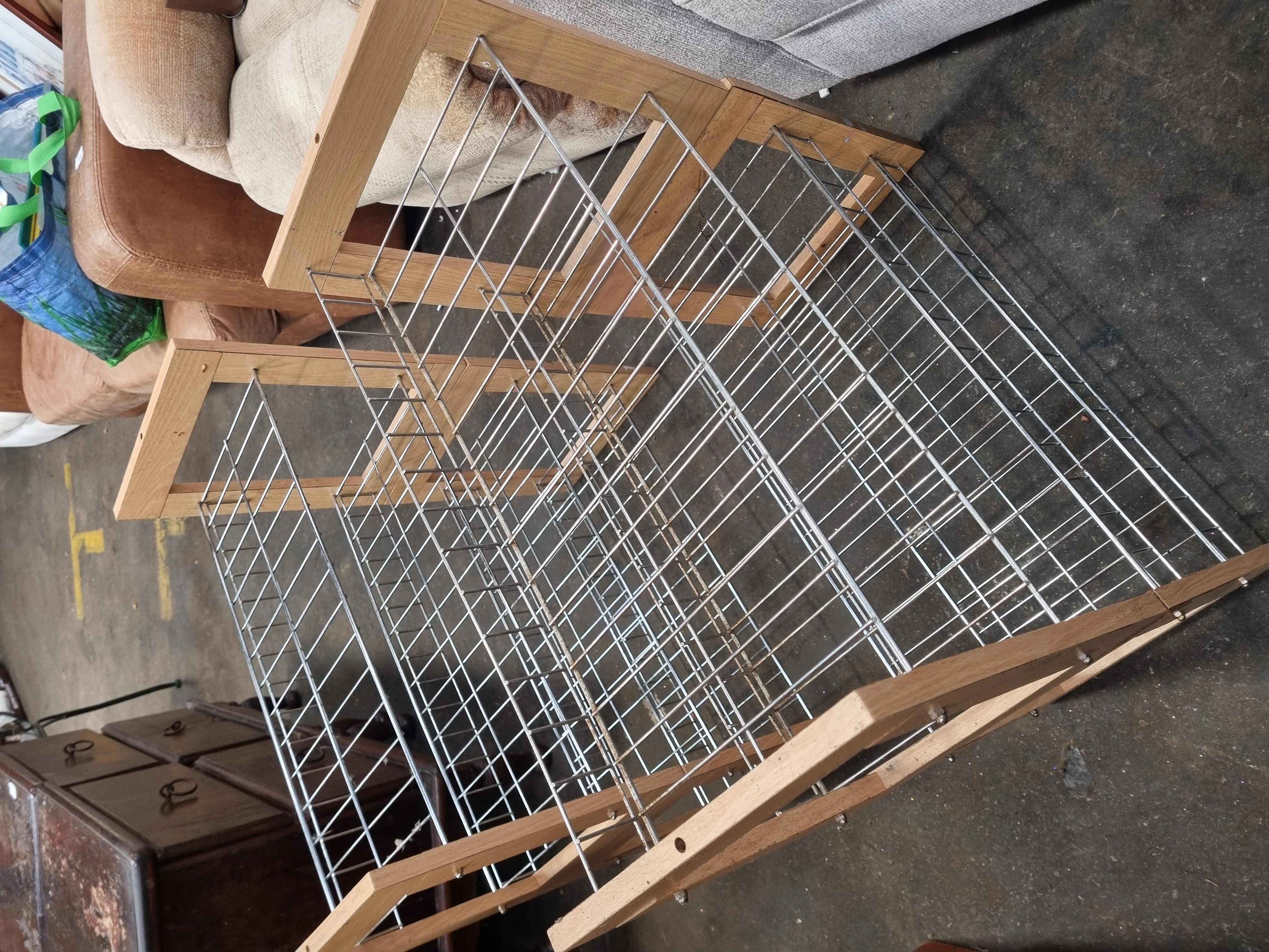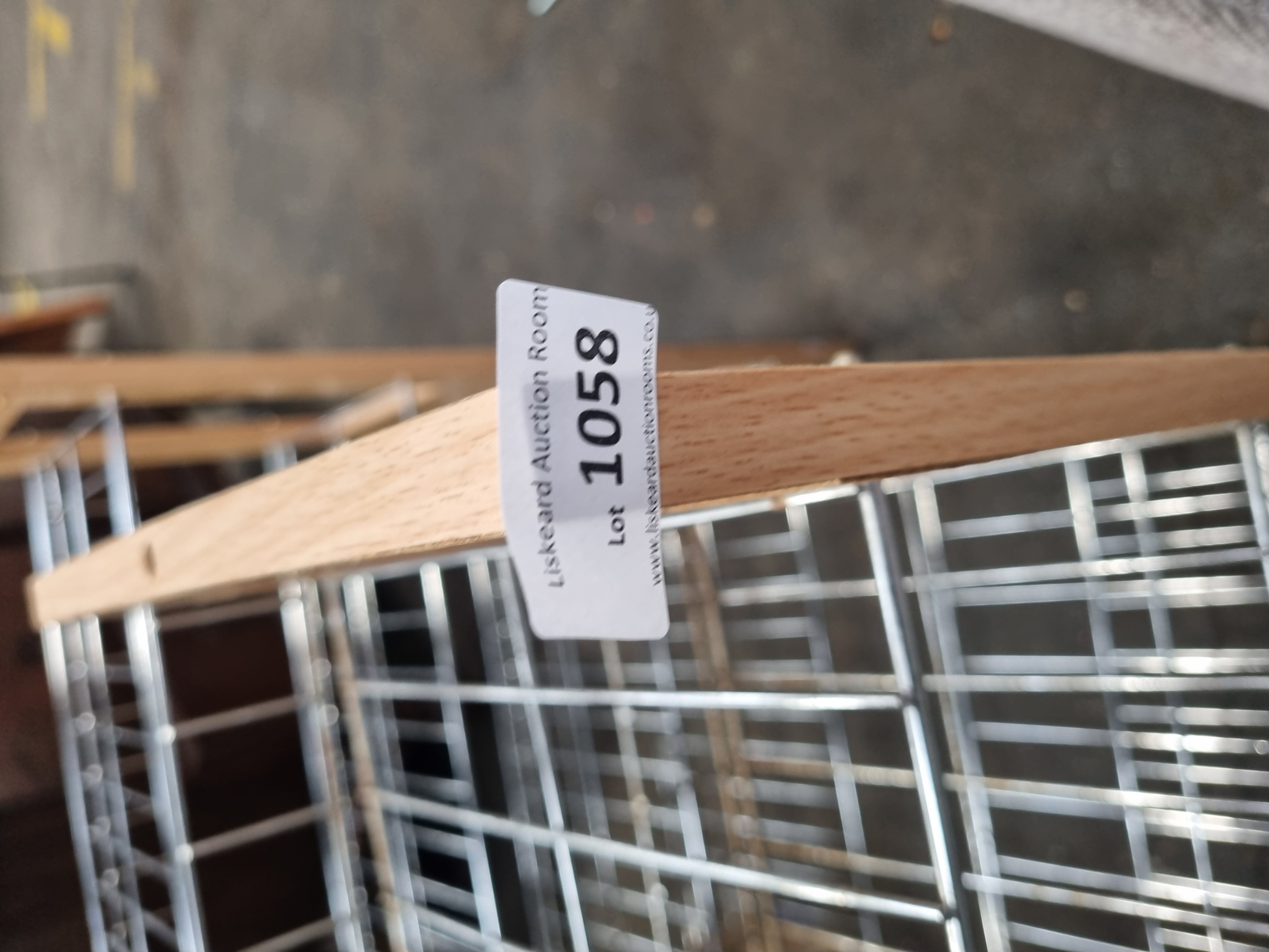 A contemporary tall storage rack of open-frame construction. The unit features two tall side panels crafted from a light wood, possibly beech, supporting five tiers of chrome-plated wire shelving. Each shelf is secured to the wooden frames with visible metal bolts. The design is functional and minimalist, suitable for utility, kitchen, or shoe storage. There are no visible manufacturer’s marks. The item currently bears an auction identification label for Liskeard Auction Room, Lot 1058.