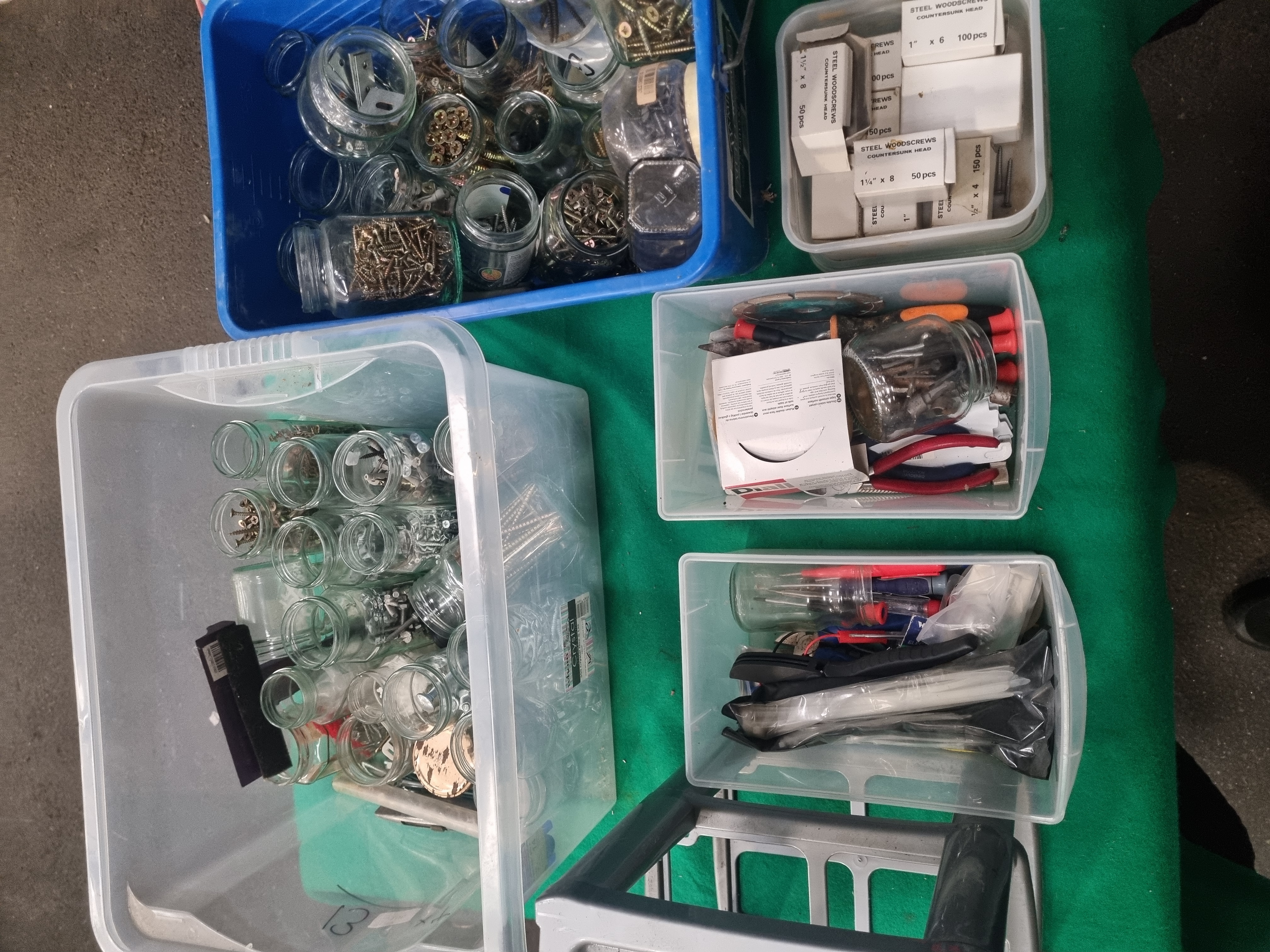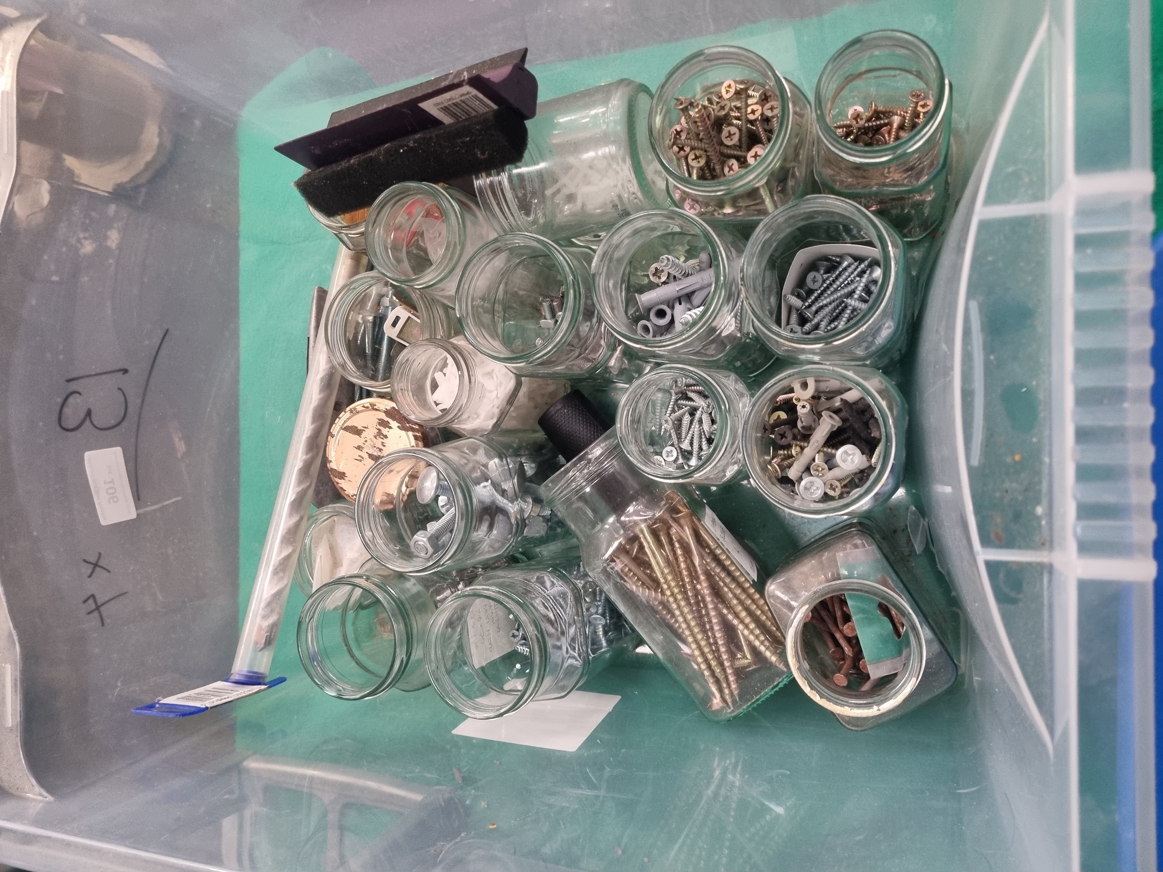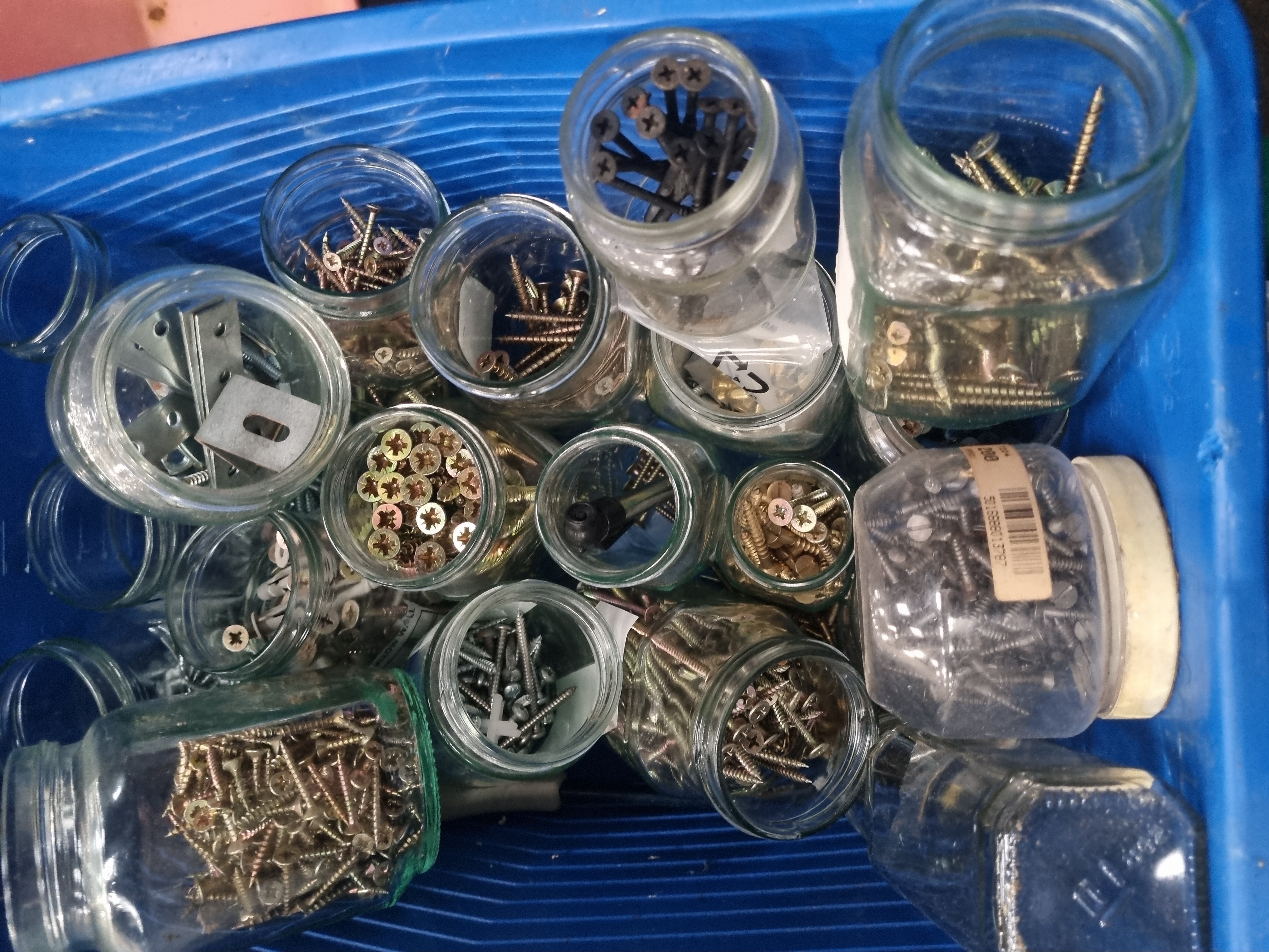 A collection of workshop hardware, fasteners, and hand tools. The lot includes a quantity of steel woodscrews, masonry wall plugs, and metal brackets. Included are several cardboard boxes of steel countersunk head woodscrews with branding for B&Q plc and Castorama France, in sizes 1 1/2 inch x 8 (50 pieces), 1 1/4 inch x 8 (50 pieces), 1 inch x 6 (100 pieces), and 1/2 inch x 4 (150 pieces). Hand tools comprise a pair of combination pliers with red and blue grips, a set of precision screwdrivers with red and black handles, and a small diamond-rimmed circular cutting disc. Workshop consumables include a pack of Diall brand double-sided carpet tape and a quantity of white nylon cable ties. The items are presented in one blue plastic crate, two large clear plastic storage bins, a grey plastic three-drawer desk organiser, and approximately thirty glass jars.