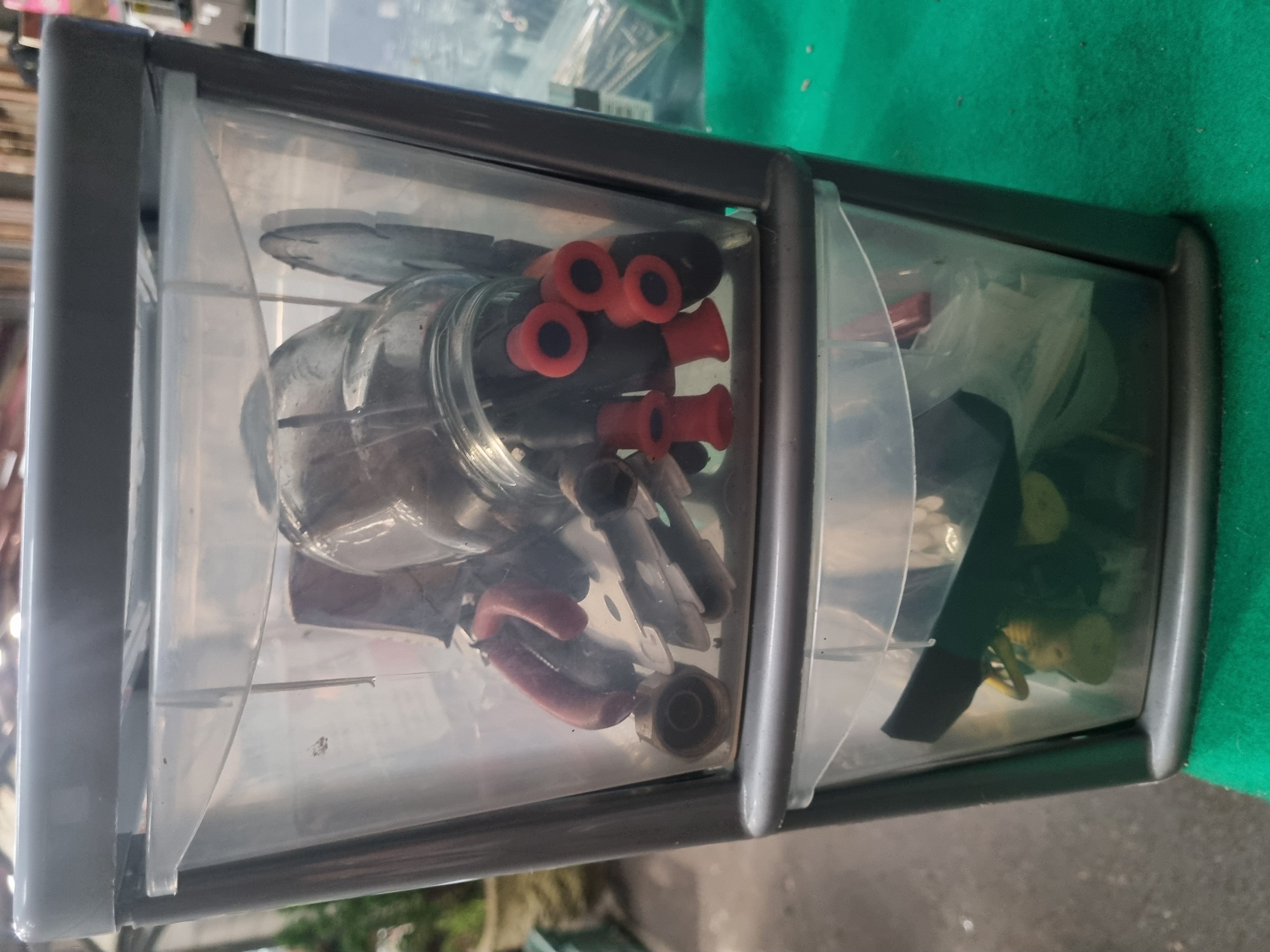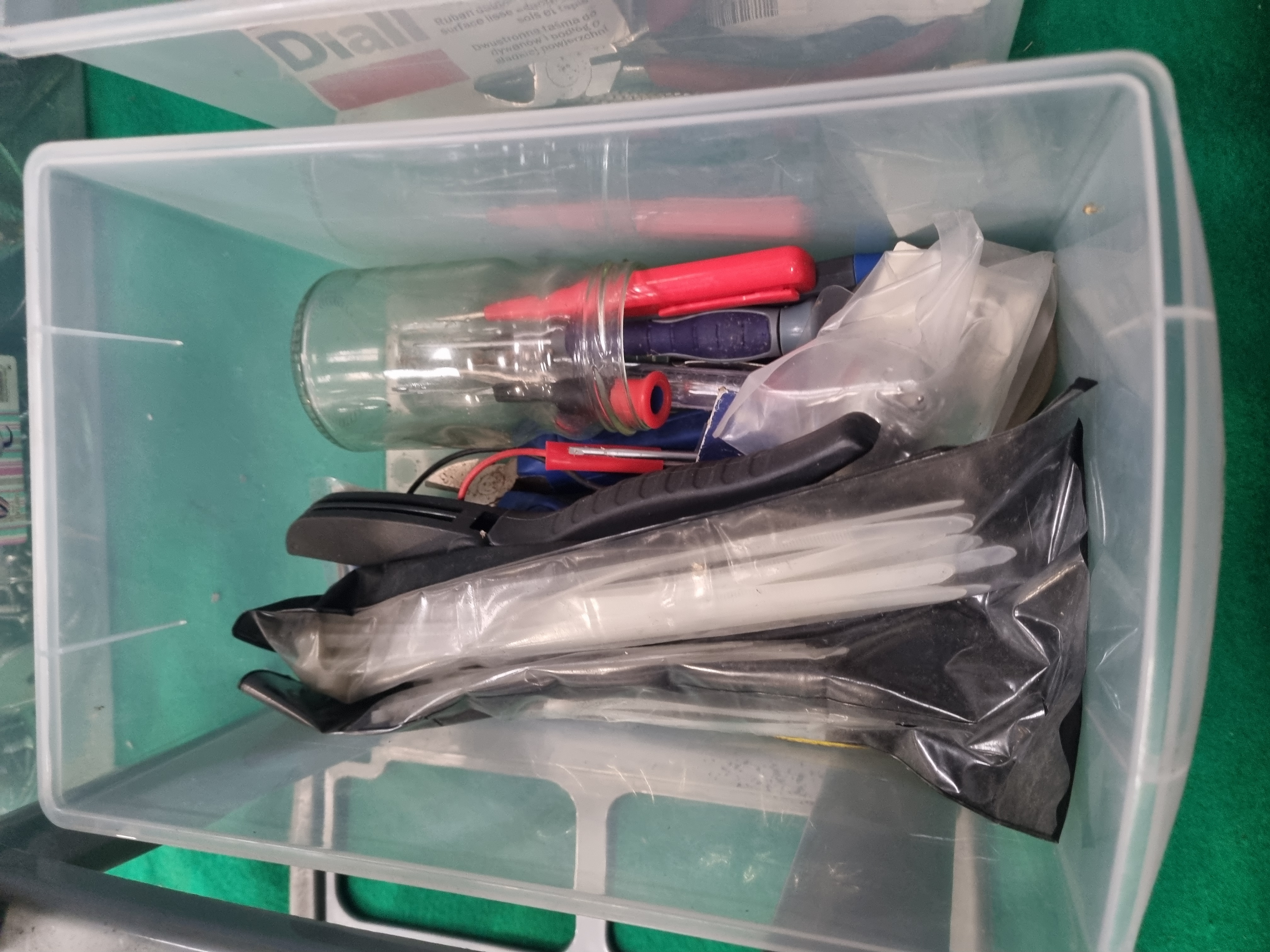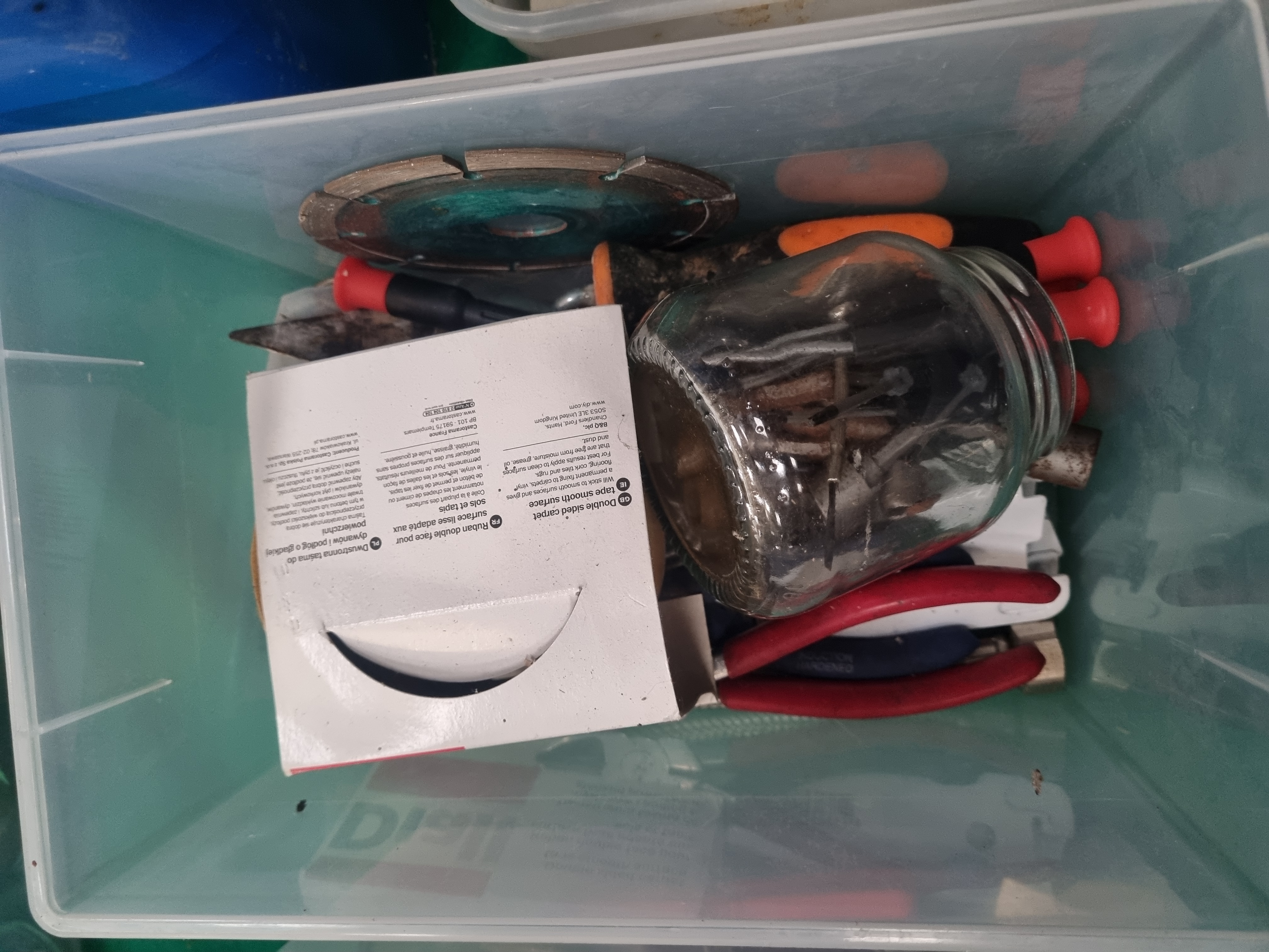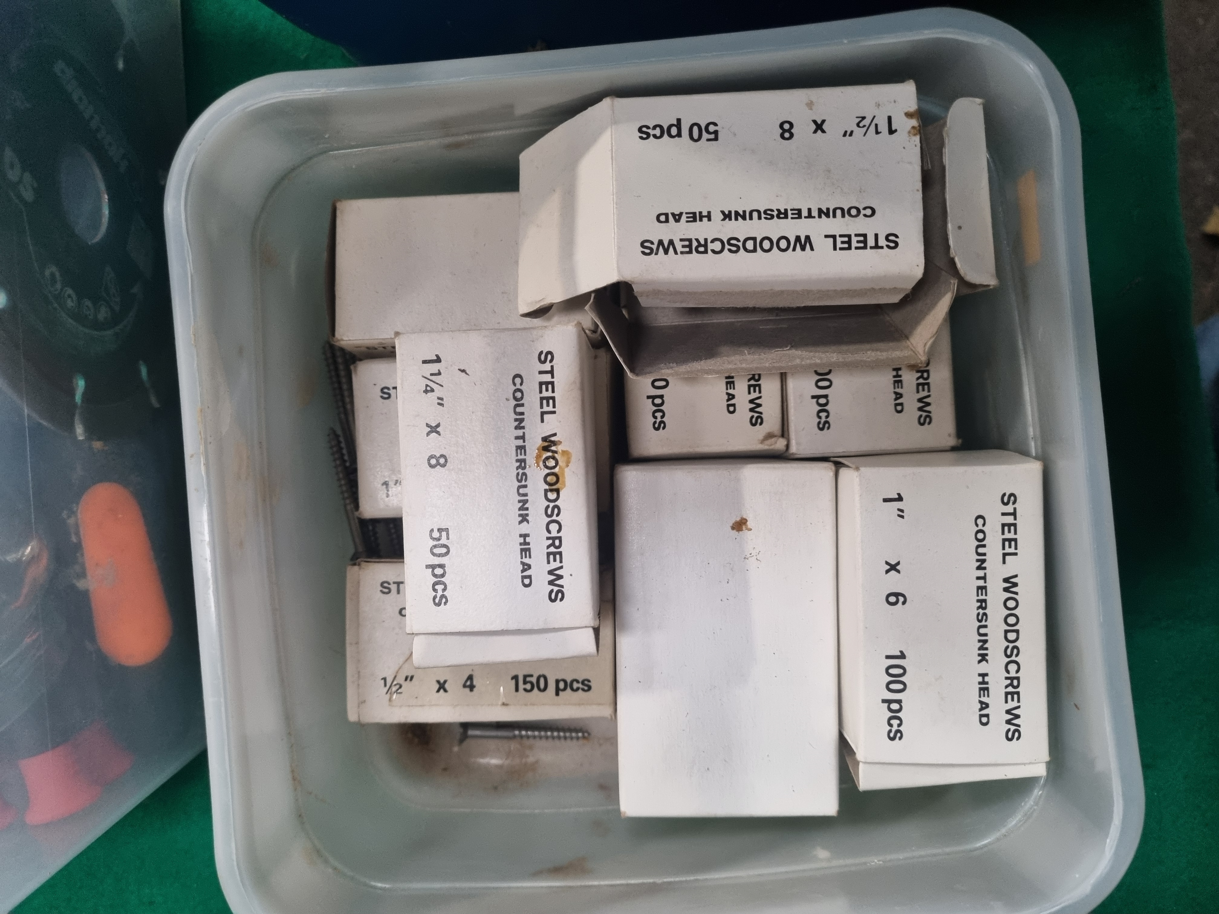 A collection of workshop hardware, fasteners, and hand tools. The lot includes a quantity of steel woodscrews, masonry wall plugs, and metal brackets. Included are several cardboard boxes of steel countersunk head woodscrews with branding for B&Q plc and Castorama France, in sizes 1 1/2 inch x 8 (50 pieces), 1 1/4 inch x 8 (50 pieces), 1 inch x 6 (100 pieces), and 1/2 inch x 4 (150 pieces). Hand tools comprise a pair of combination pliers with red and blue grips, a set of precision screwdrivers with red and black handles, and a small diamond-rimmed circular cutting disc. Workshop consumables include a pack of Diall brand double-sided carpet tape and a quantity of white nylon cable ties. The items are presented in one blue plastic crate, two large clear plastic storage bins, a grey plastic three-drawer desk organiser, and approximately thirty glass jars.