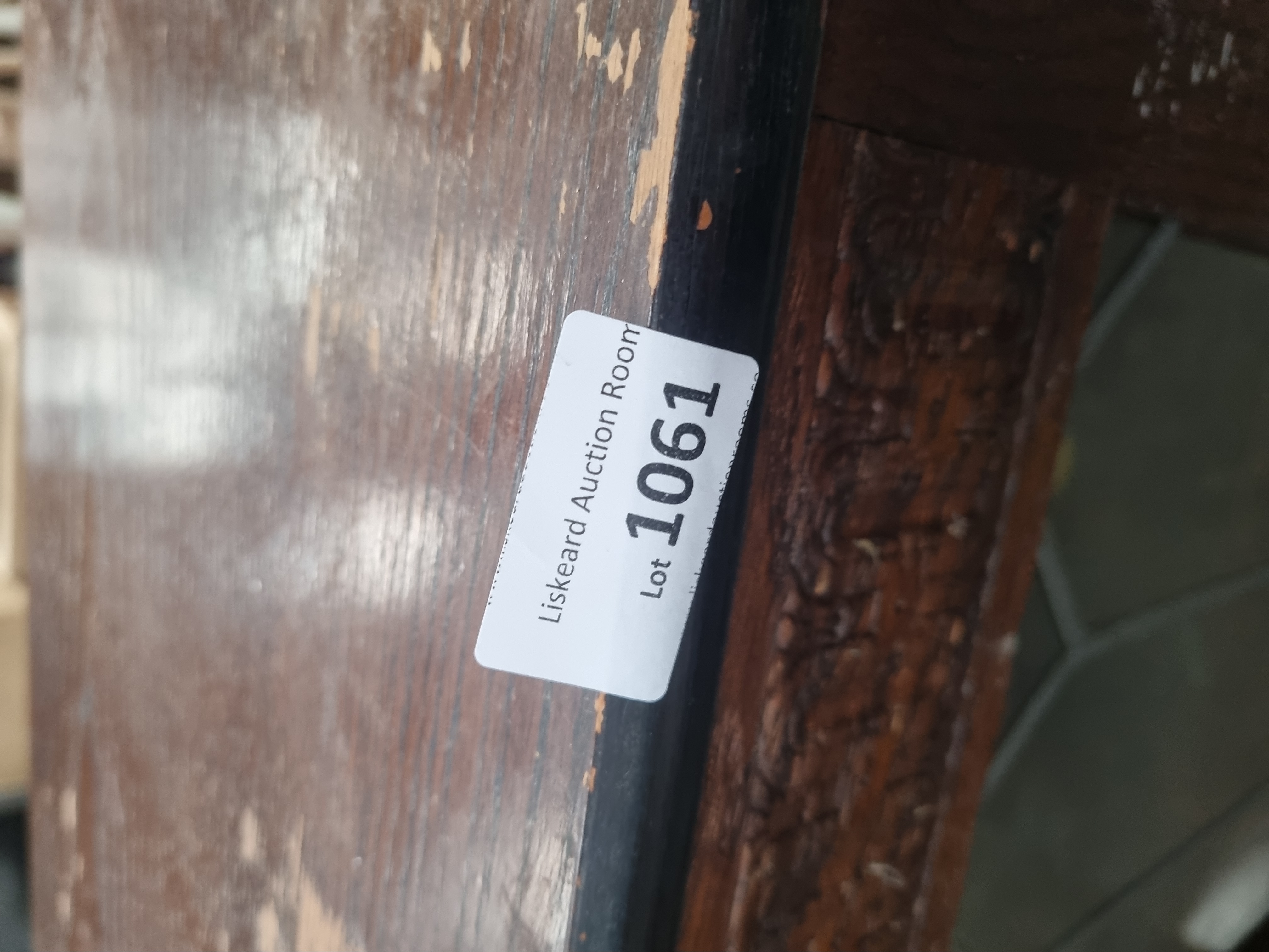 A mid-20th-century oak display cabinet or bookcase designed in the Tudor Revival style. The piece is of single-unit construction with a dark-stained finish and prominent wood grain. The upper frieze is decorated with a carved repeating guilloche motif. The two doors are fitted with leaded glass in a geometric pattern and feature two decorative brass-toned drop handles. The interior is fitted with shelving. The cabinet stands on a simple plinth base with a shaped apron. A white rectangular sticker on the top edge identifies the item as Lot 1061 from Liskeard Auction Room.