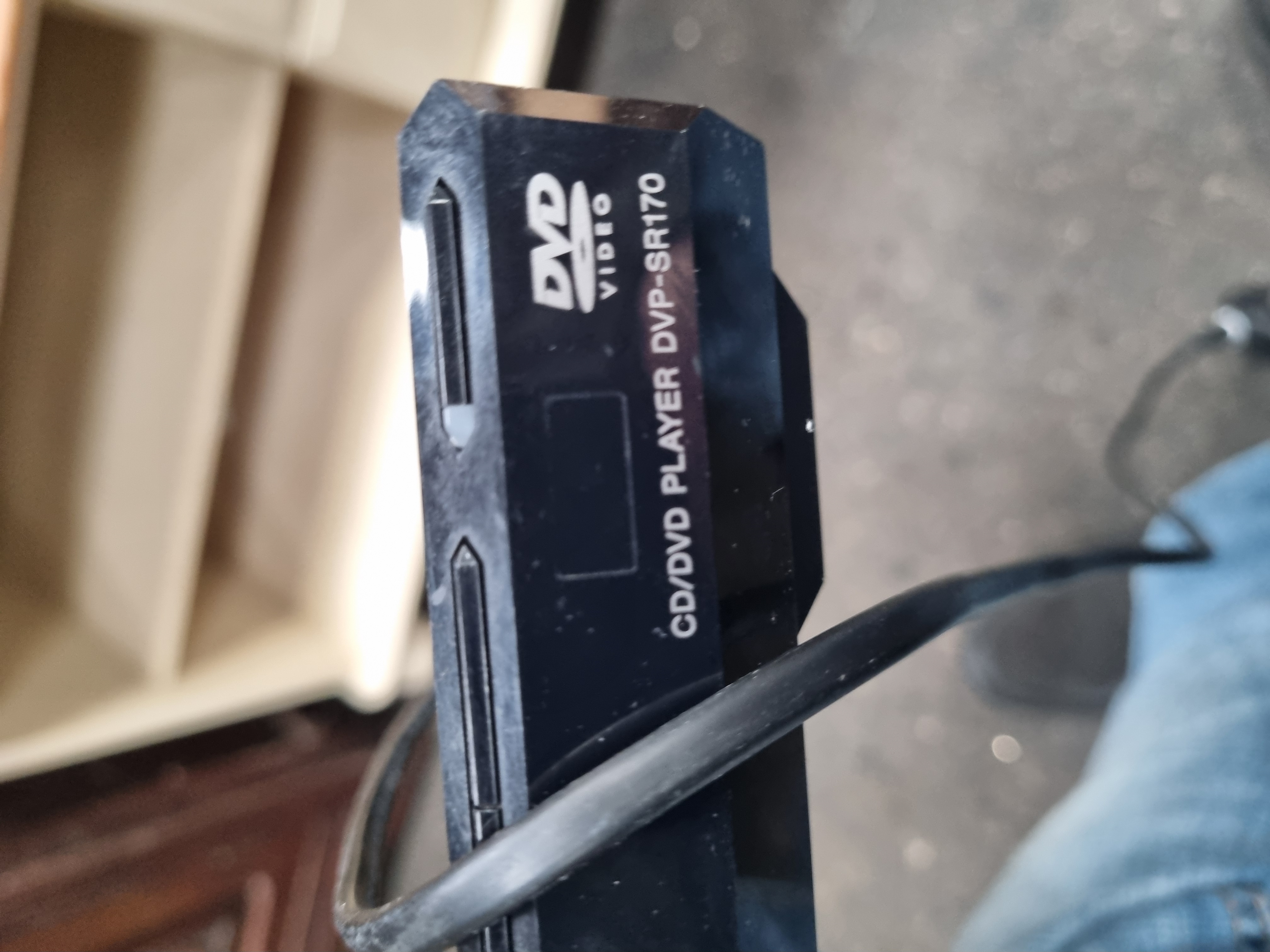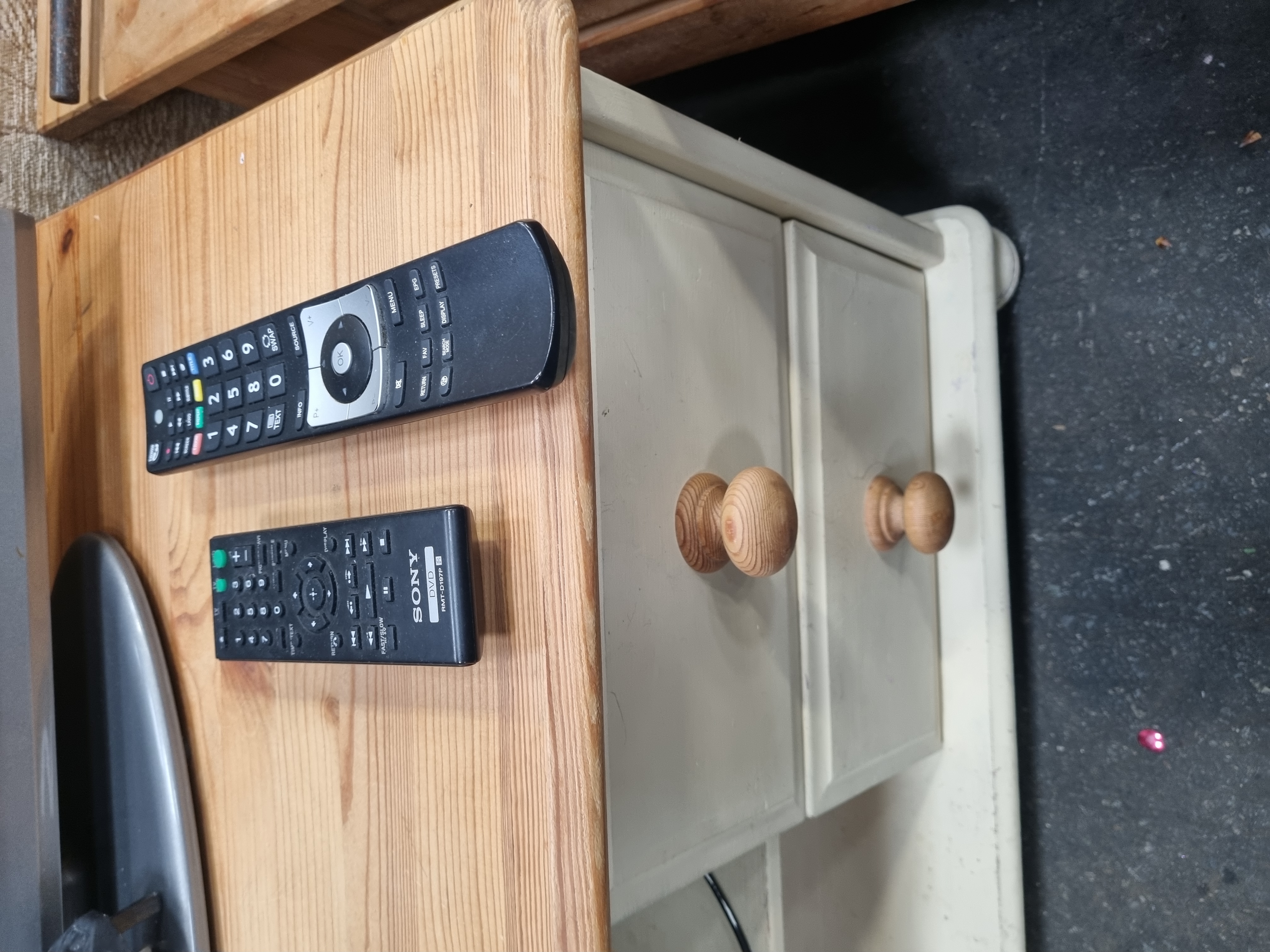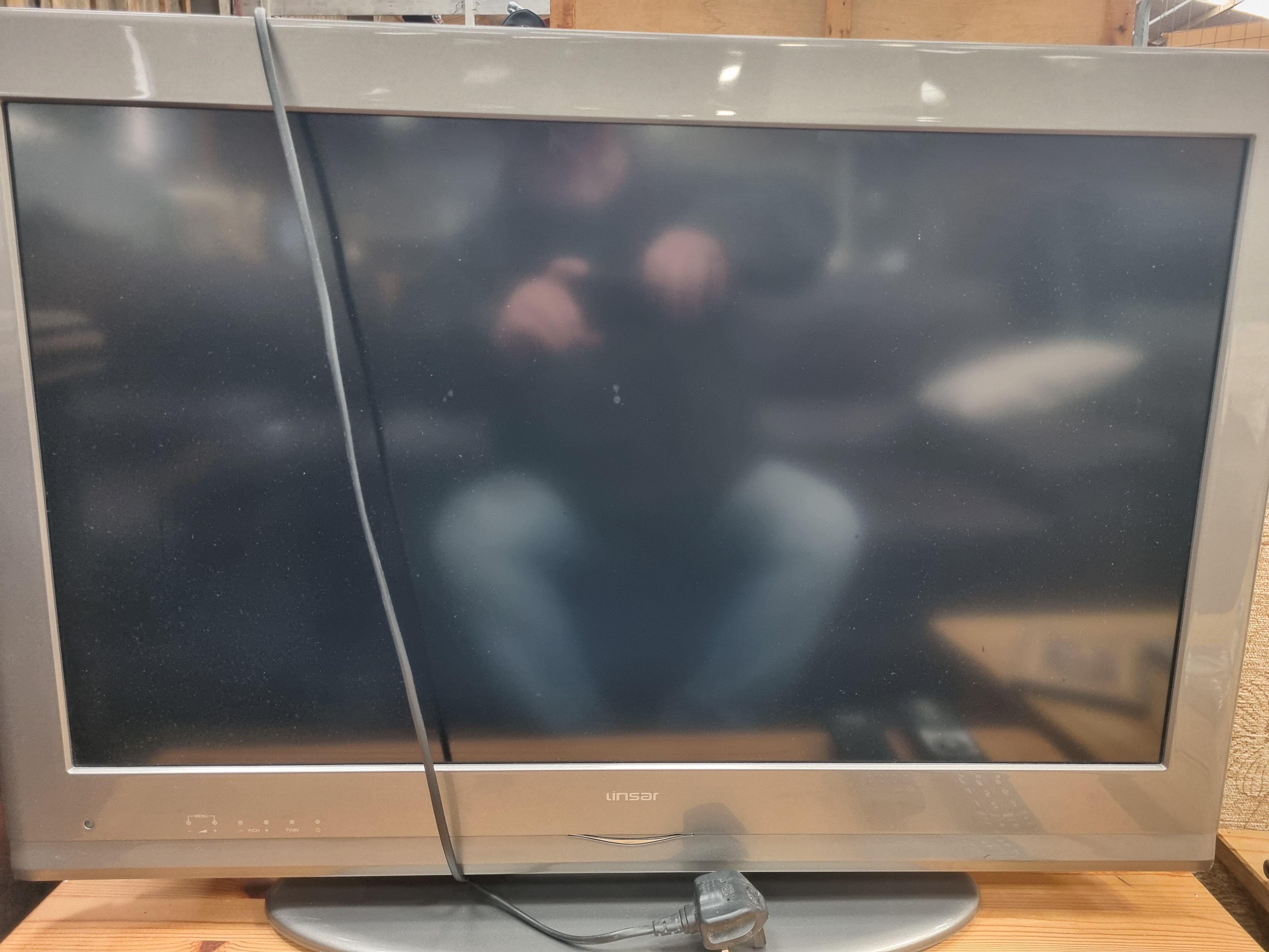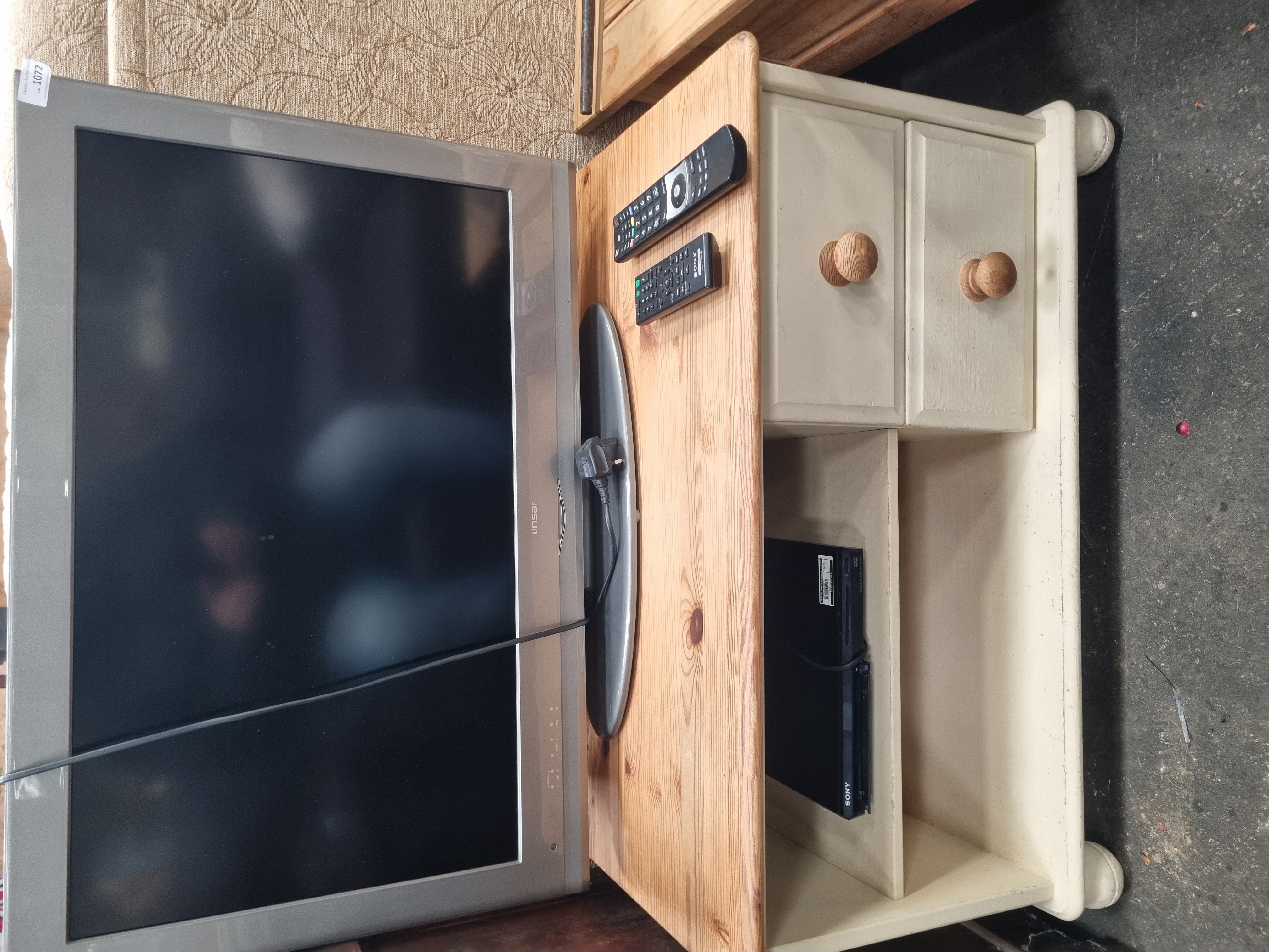 An assortment consisting of a Linsar flat-screen television, a Sony CD/DVD player, and a two-tier TV stand. The television is finished with a silver-toned bezel featuring the Linsar brand name on the front and is equipped with a fixed UK three-pin power cable and a compatible black remote control. The Sony DVD player is identified by model number DVP-SR170 and includes a Sony remote control, model RMT-D197P. These items are situated on a wooden TV stand constructed with a natural pine top and a cream-painted base. The furniture features two drawers with round wooden handles and an open storage shelf. A lot sticker numbered 1072 is adhered to the corner of the television bezel.