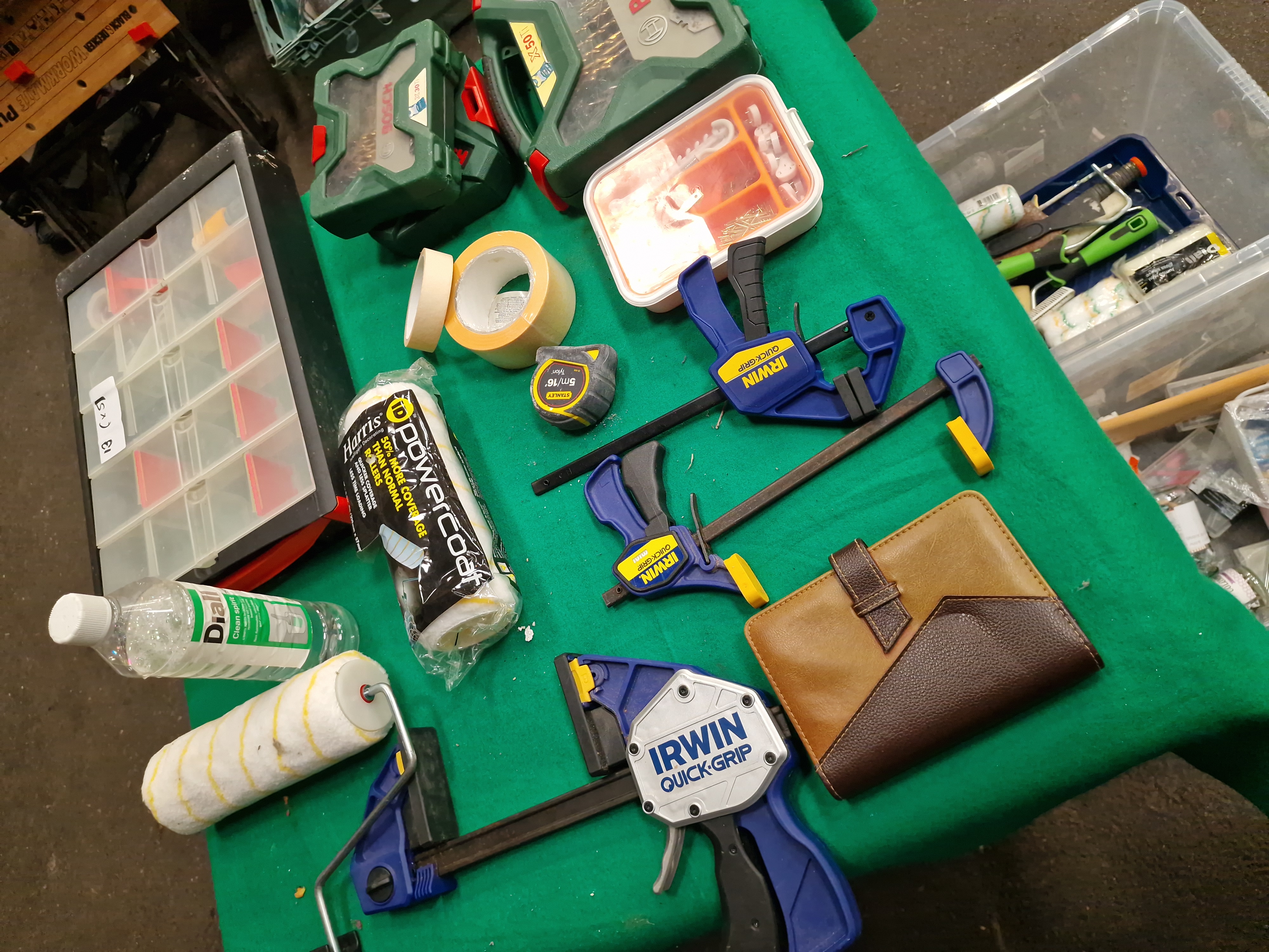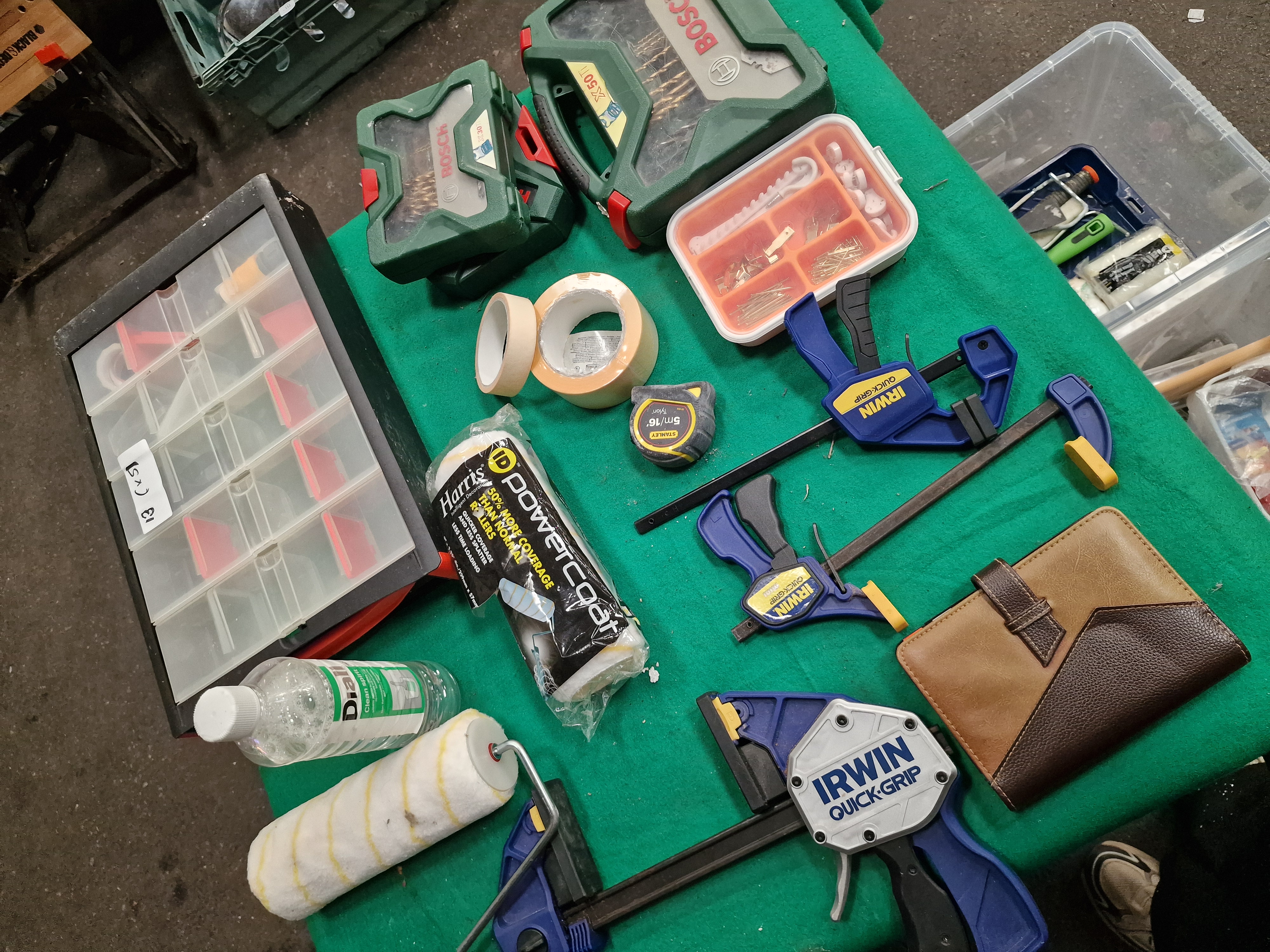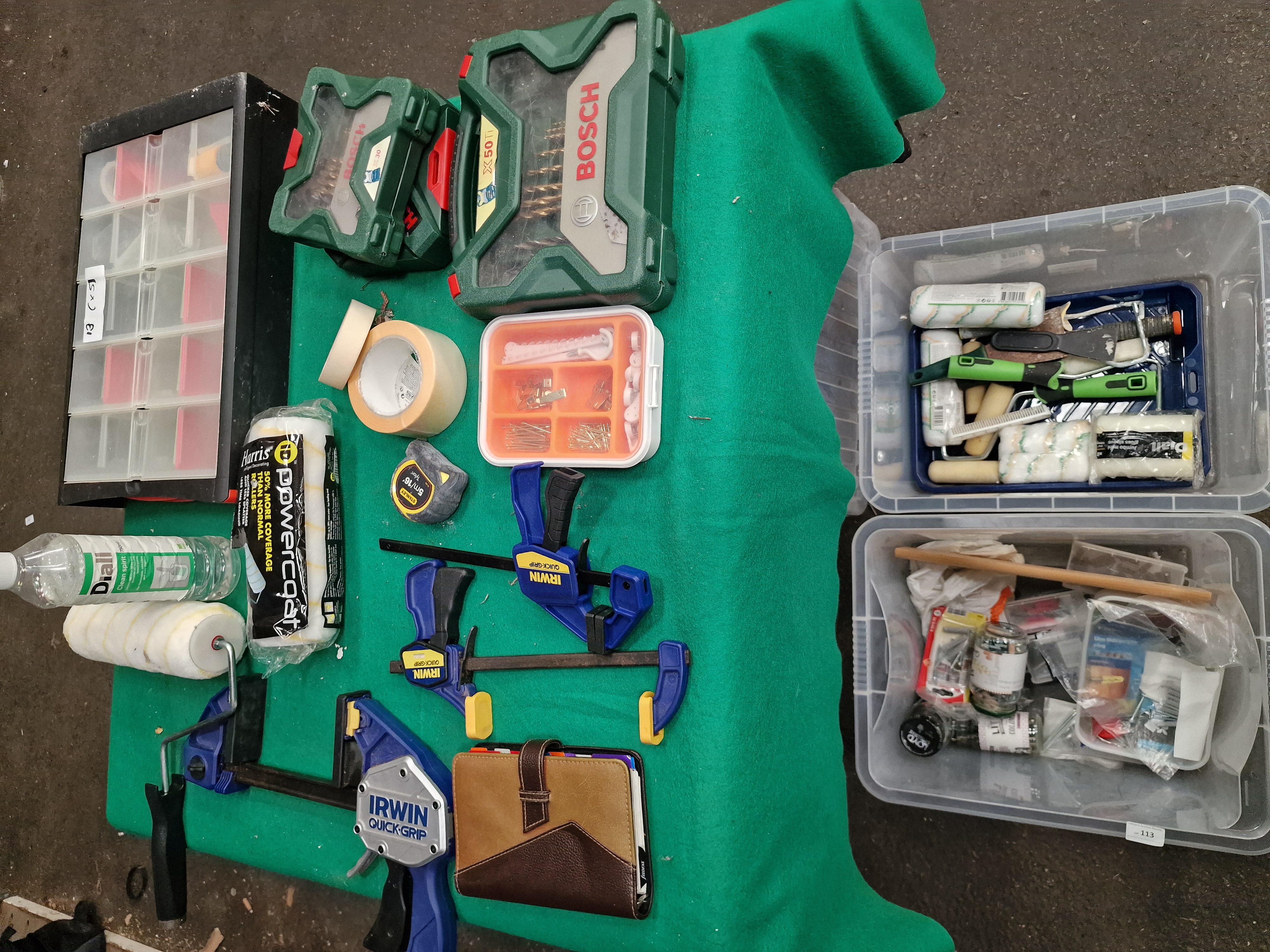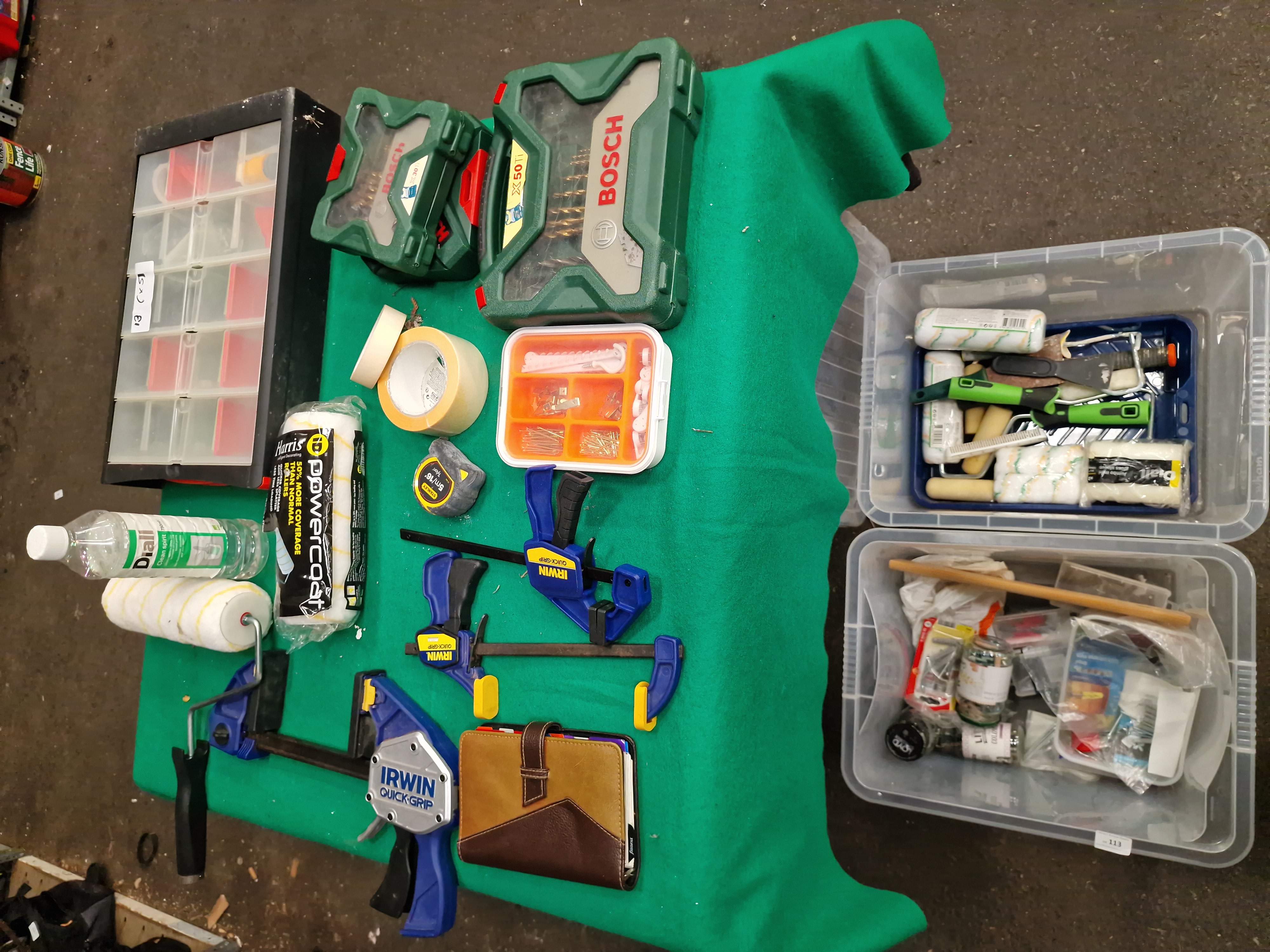 A collection of hand tools and parts storage equipment. The lot includes two Bosch drill and screwdriver bit sets, models X50Ti and X30, housed in green plastic carry cases. Clamping tools comprise one large Irwin Quick-Grip bar clamp and two Irwin Quick-Grip Mini bar clamps. Measuring equipment includes a Stanley Tylon 5m/16ft tape measure. The decorating section contains a Harris Powercoat large paint roller in original packaging, various Diall brand roller sleeves and frames, a handheld scraper with a green and black handle, and a bottle of Diall clean spirit. Storage solutions include a multi-drawer small parts organiser, two large Wham brand clear plastic bins containing assorted hardware such as wall plugs and screws, and a smaller orange hardware organiser. Additional items include a brown faux-leather zipped portfolio and lengths of wooden dowel.