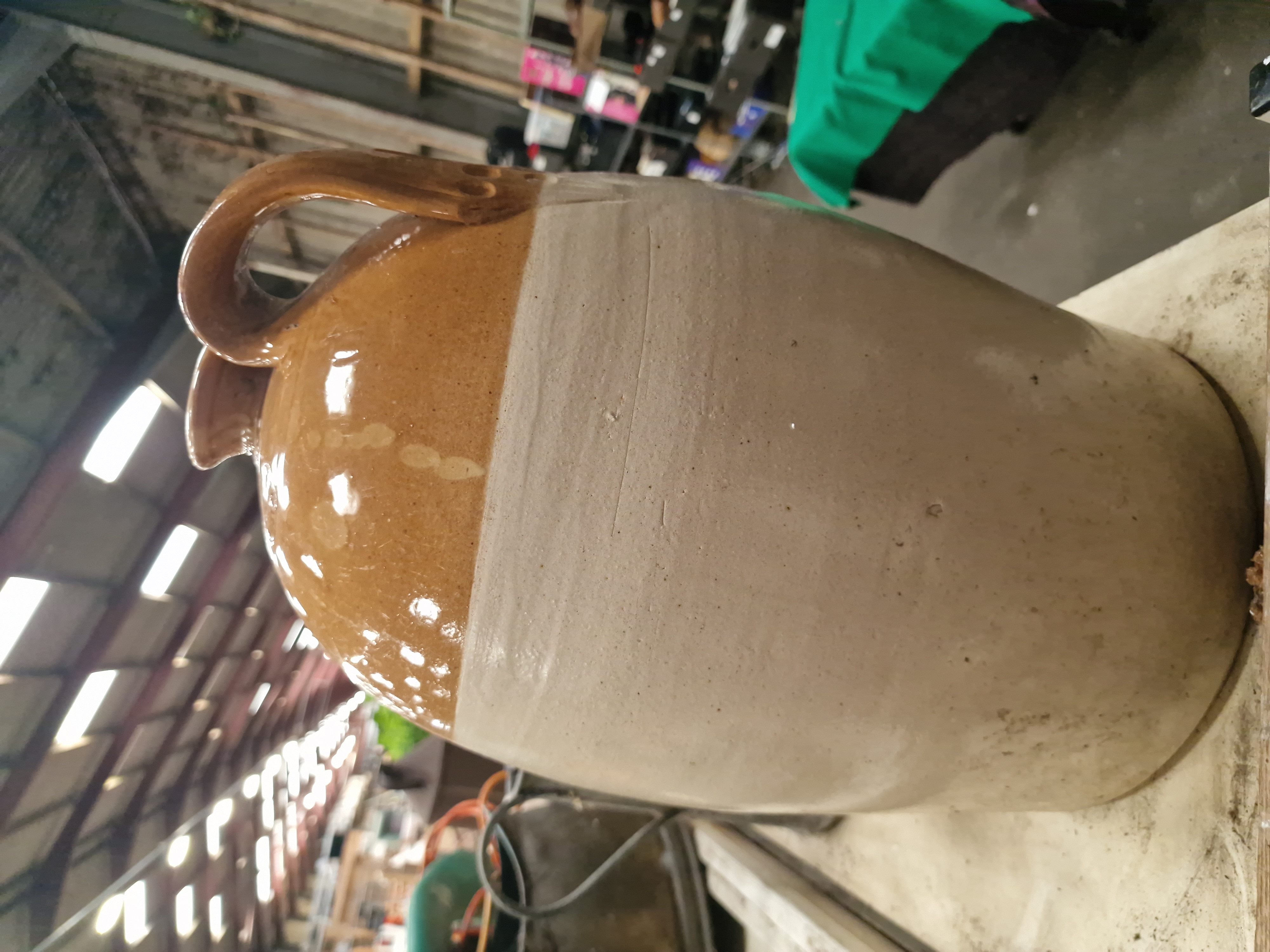 A large Victorian utilitarian stoneware flagon of bulbous form, featuring a narrow collared neck and two applied strap handles at the shoulders. The vessel displays a traditional two-tone finish, with the upper section finished in a glossy brown salt glaze, known as a Bristol glaze, over a buff-coloured stoneware body. The shoulder is clearly impressed with the maker’s mark, featuring the name POWELL in an upward arch above the word BRISTOL in a straight line. This mark identifies the piece as a product of the Powell pottery in Bristol, which is credited with the development of this specific durable and acid-resistant glaze technique. The body exhibits characteristic manufacturing features including minor pitting, kiln-stilt marks, and peppering within the glaze. The item currently bears a modern auction lot sticker and a handwritten dealer label.
