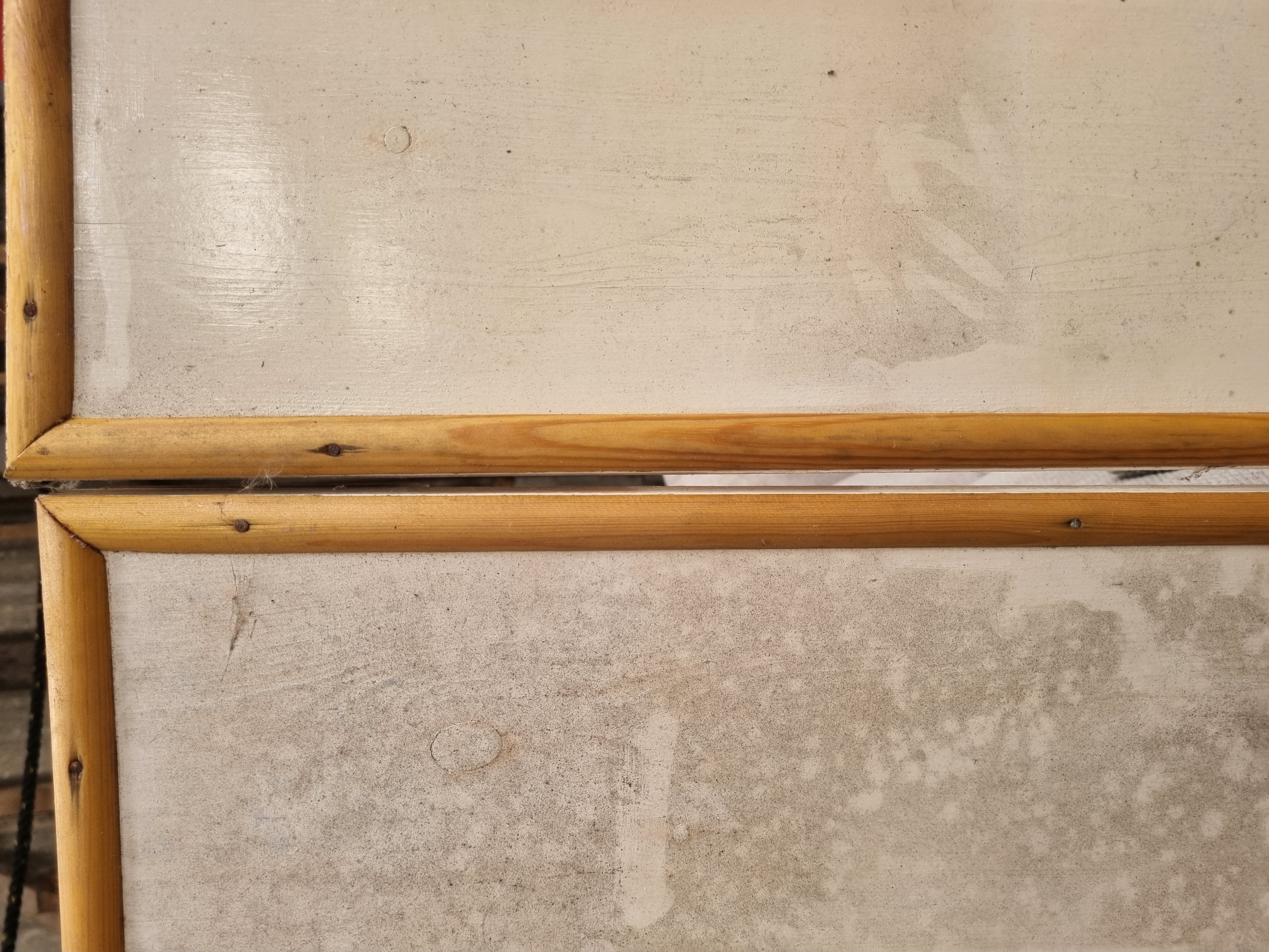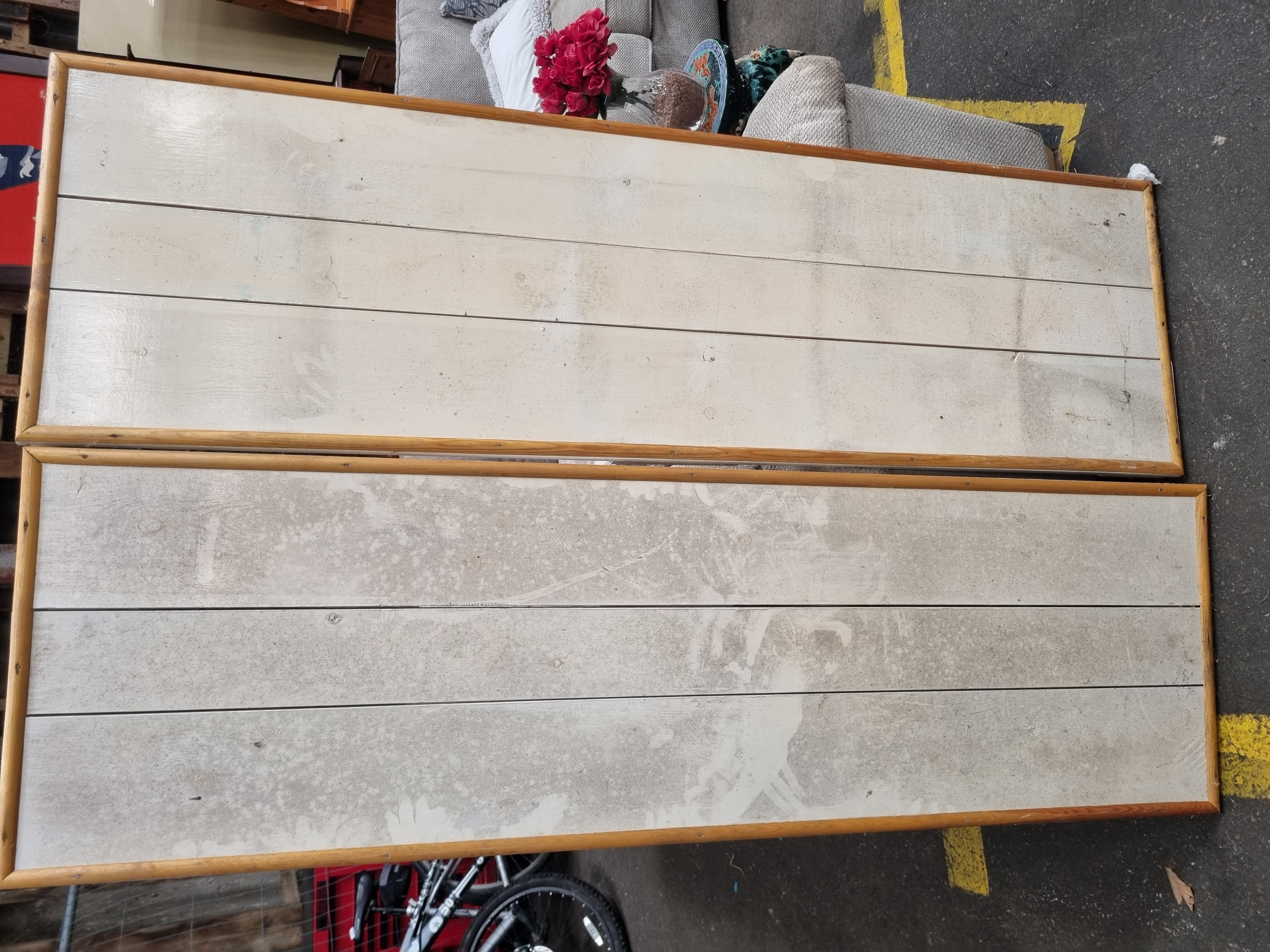A pair of large rectangular furniture panels of planked wood construction, likely intended for use as wardrobe or armoire doors, dating to the late 20th century or contemporary period. Each panel features an off-white painted finish and is framed with a natural-finished pine half-round moulding. The reverse of each door is fitted with three vertical painted wooden battens for structural support. These panels are sold as architectural salvage and do not include hinges, handles, locks, or internal fittings.
