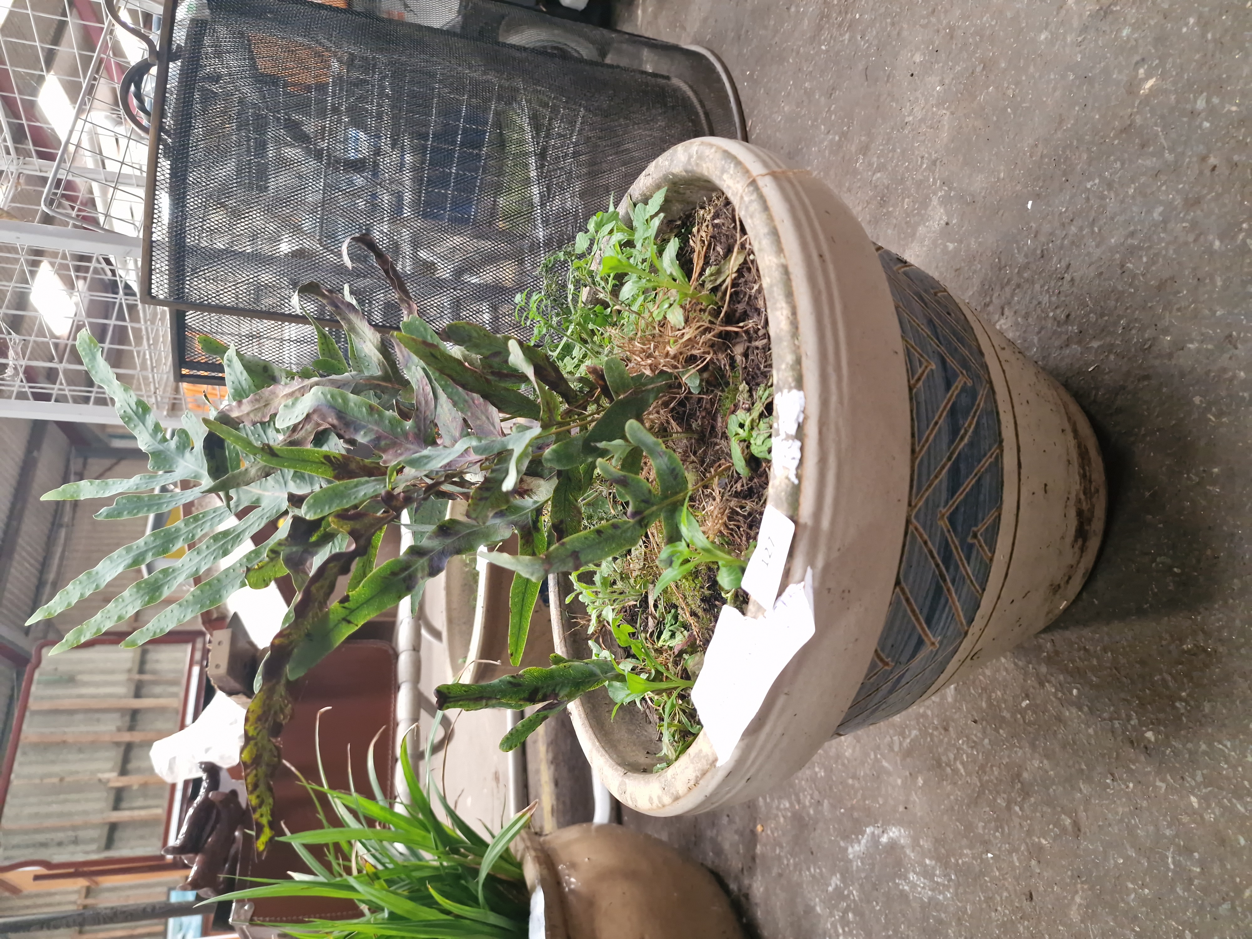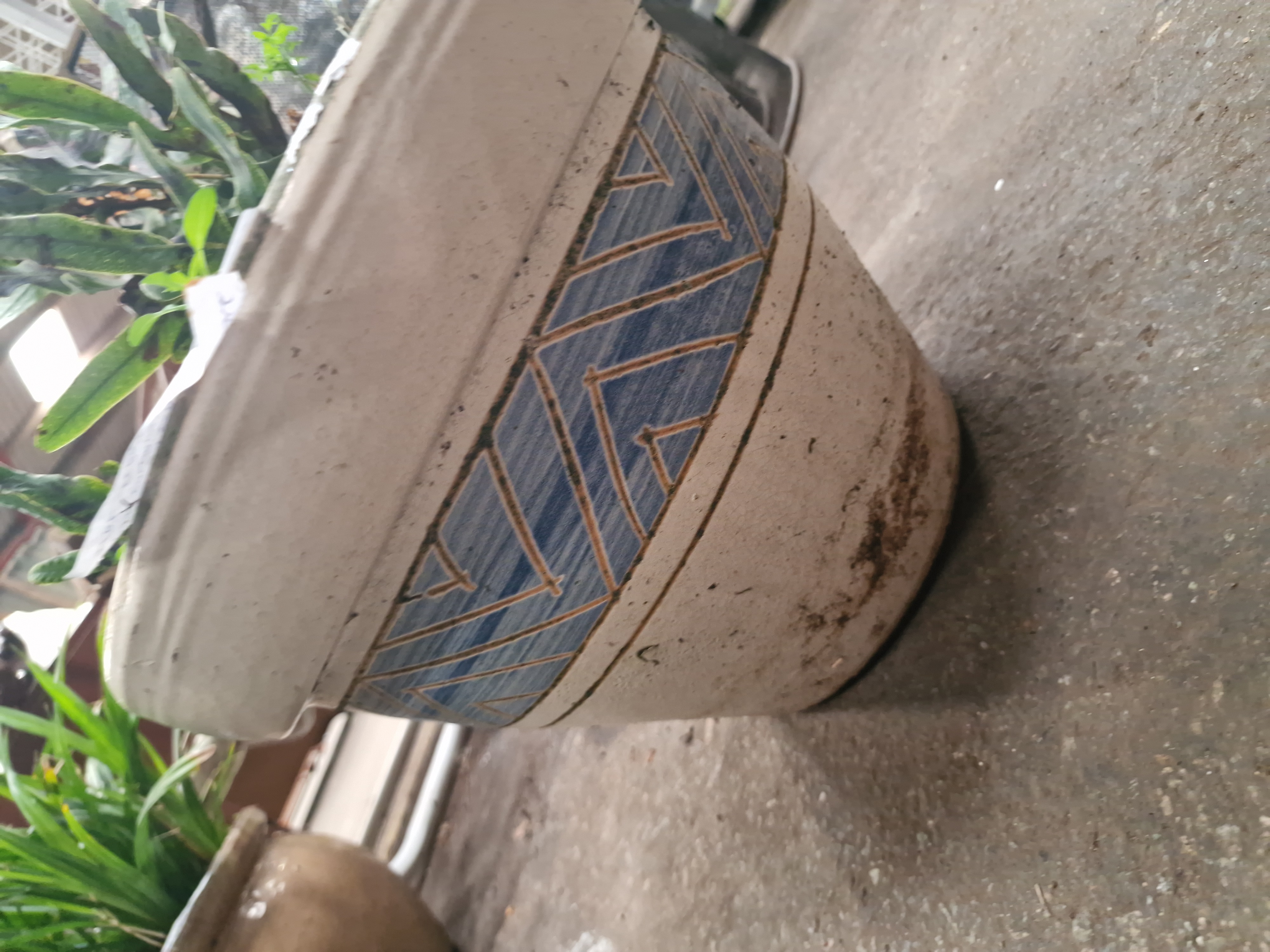 A large contemporary garden planter of tapered cylindrical form, likely constructed from heavy earthenware or stoneware. The vessel features a thick, rounded rim and is finished in a cream-toned glaze. The exterior is decorated with a broad central band of incised geometric patterns, consisting of nested triangles filled with a contrasting blue glaze. The planter is sold containing a live plant, identified as a Blue Star Fern (Phlebodium aureum). No maker’s marks or factory stamps are visible on the exterior of the piece.