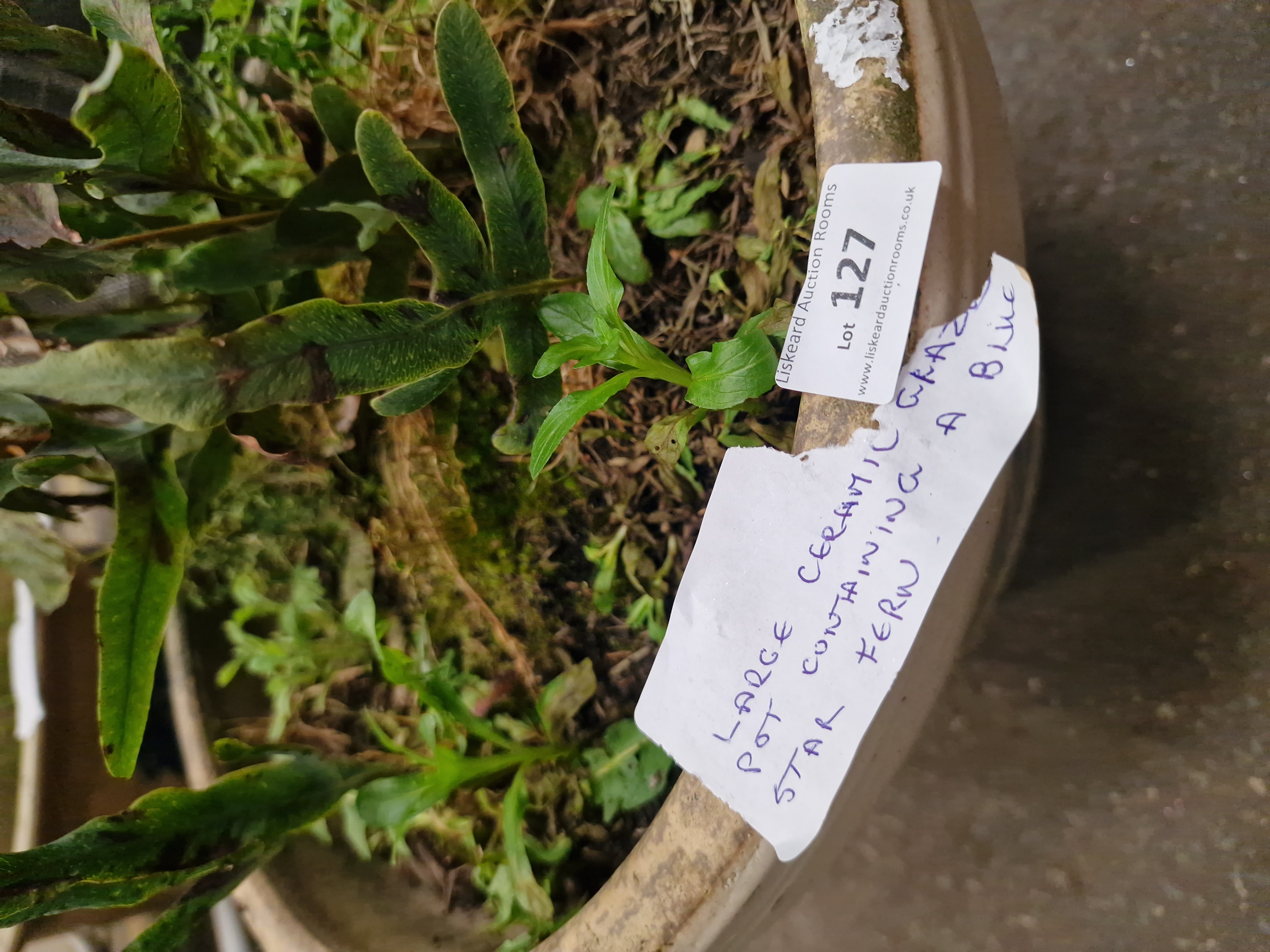Lot 127: A contemporary glazed ceramic garden planter with incised geometric decoration