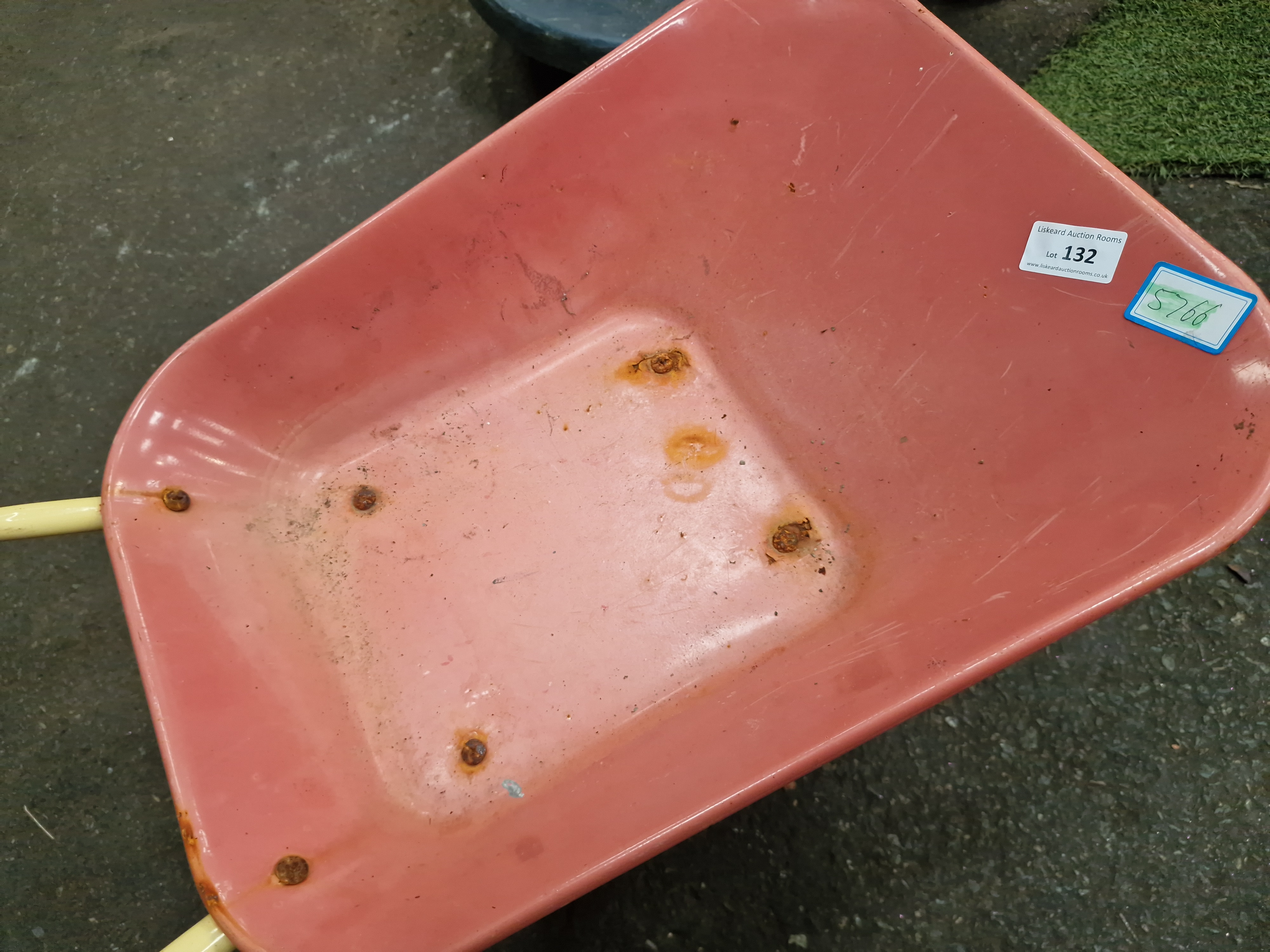A child’s garden toy wheelbarrow constructed with a pressed metal pan and a tubular metal frame. The pan is finished in coral pink paint and the frame is finished in pale yellow. The toy features a single front wheel with a yellow plastic hub and a solid black tyre. The handles are fitted with white ribbed plastic grips. The assembly is secured with metal bolts through the base of the pan. Two auction labels are adhered to the interior of the pan, one for Liskeard Auction Rooms Lot 132 and a blue-bordered label handwritten with the number 5766. This item is similar in design to children’s garden equipment produced by brands such as VIVOHOME and Miracle-Gro.