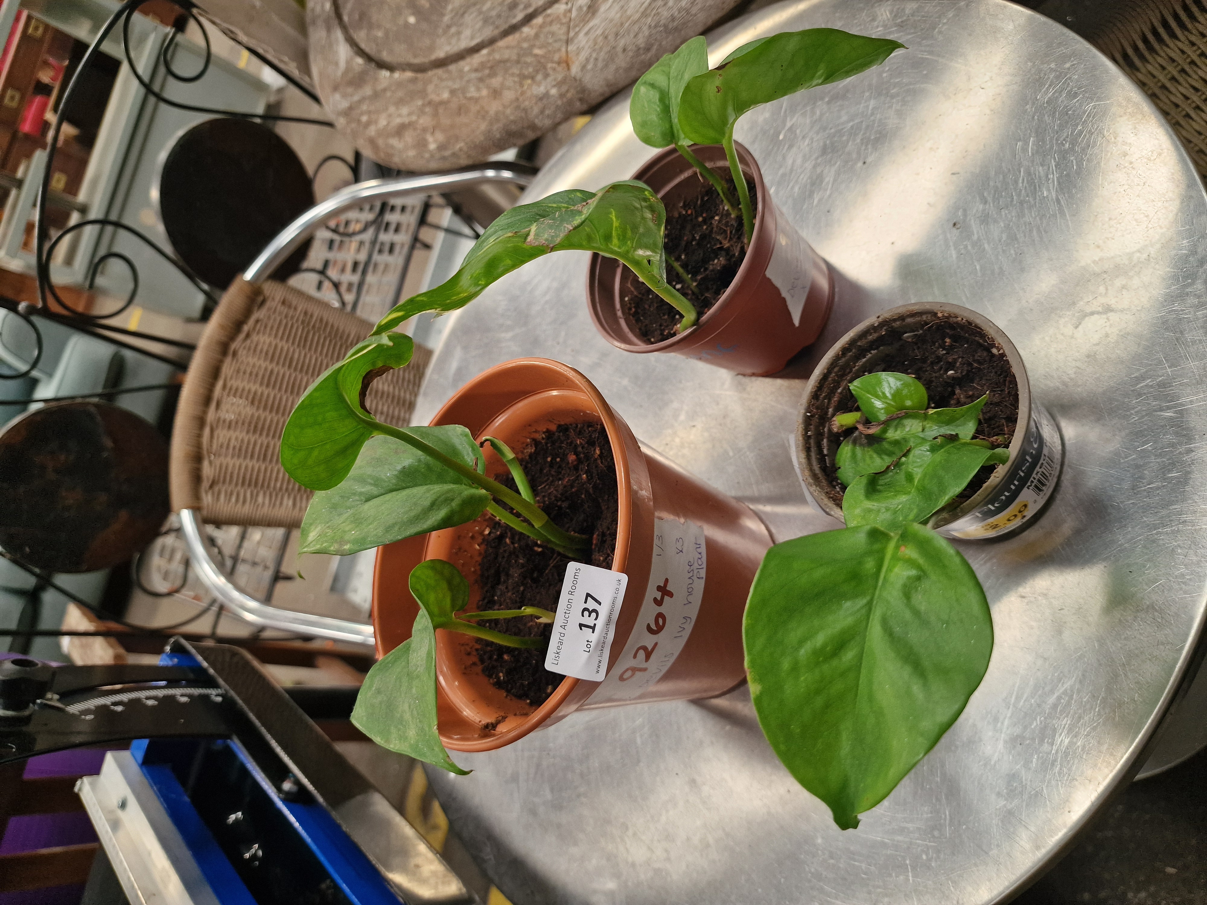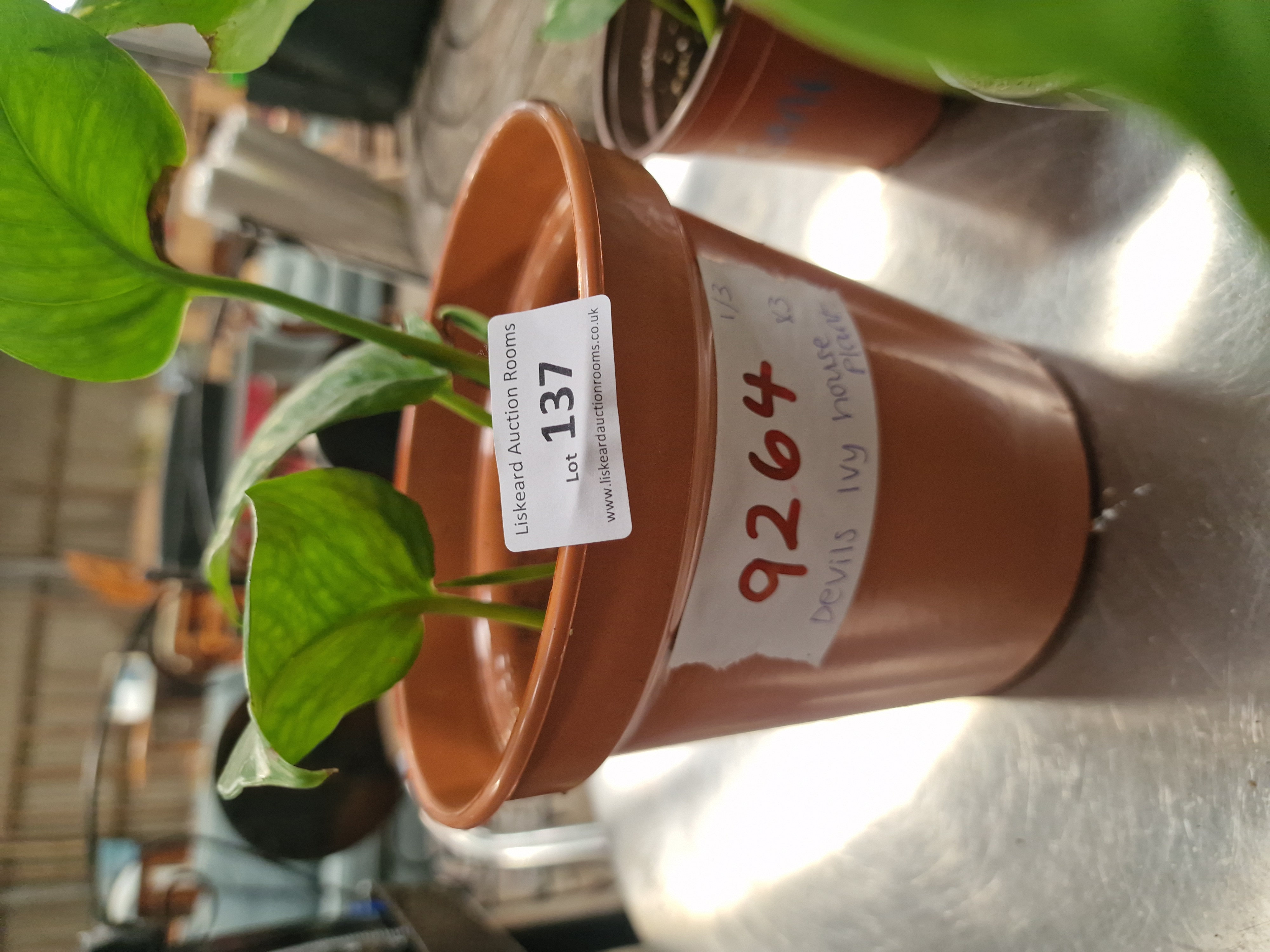 A trio of Devil’s Ivy (Epipremnum aureum) house plants, also known as Pothos, presented in three plastic nursery pots. The collection includes two terracotta-coloured pots and one grey pot. The plants feature heart-shaped foliage with green-on-green variegation, resembling the Global Green or Emerald cultivars. One pot bears a handwritten adhesive label identifying the contents as Devils Ivy house plant and 9264, and is further identified by a Liskeard Auction Rooms sticker for Lot 137.