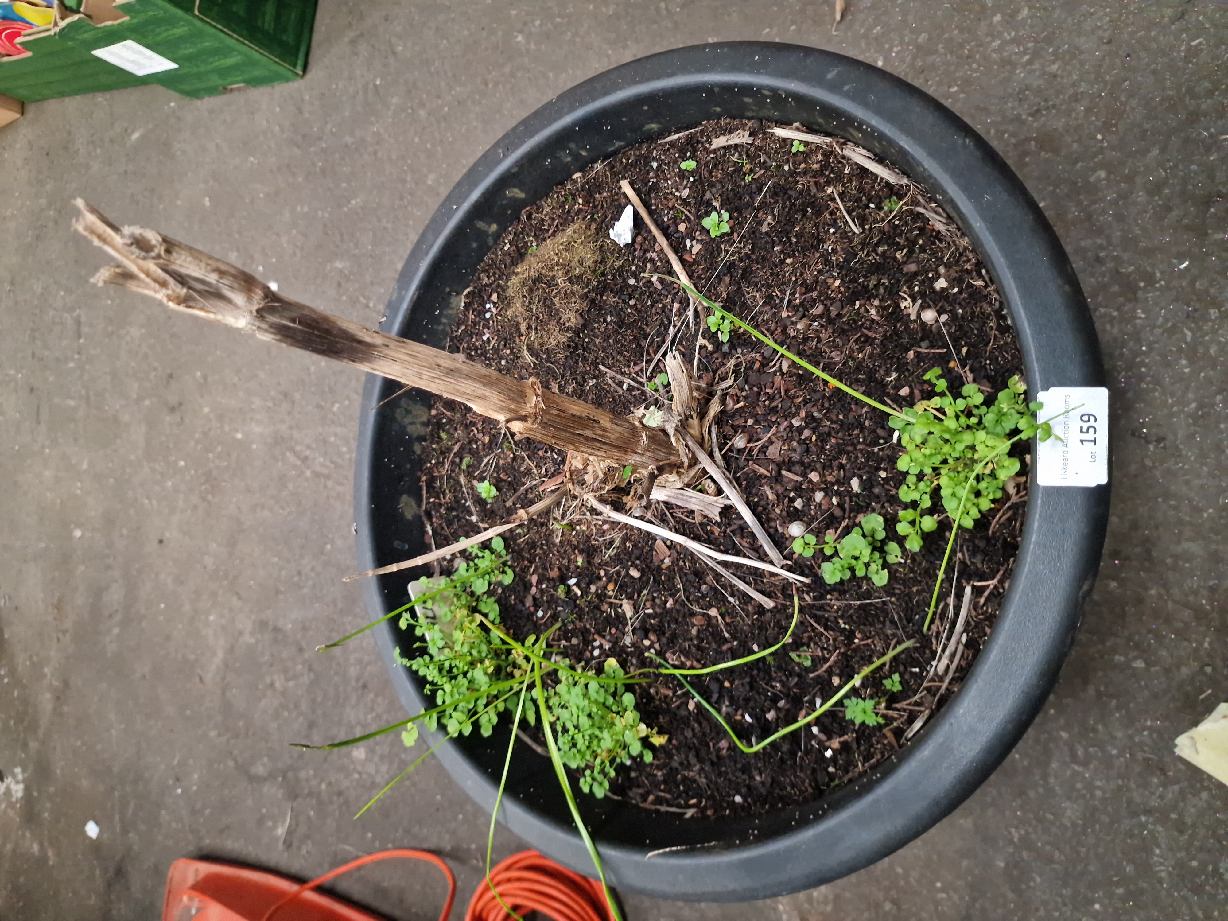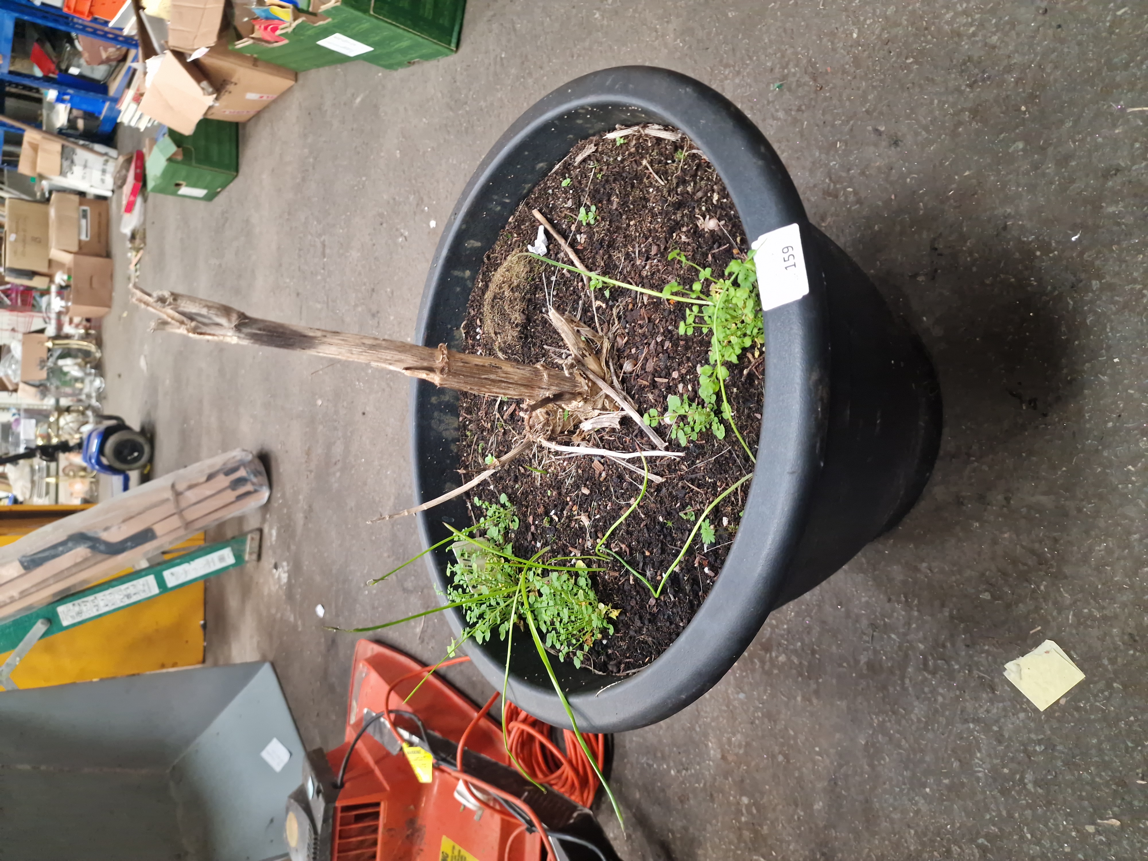 A large circular garden planter of tapered form, constructed from black moulded plastic. The vessel features a wide rolled rim and contains a potting medium with a single upright woody stem, resembling a Cordyline australis. Small weeds and grasses are present within the soil. No manufacturer marks are present. An auction label for Liskeard Auction Rooms, Lot 159, is adhered to the rim.