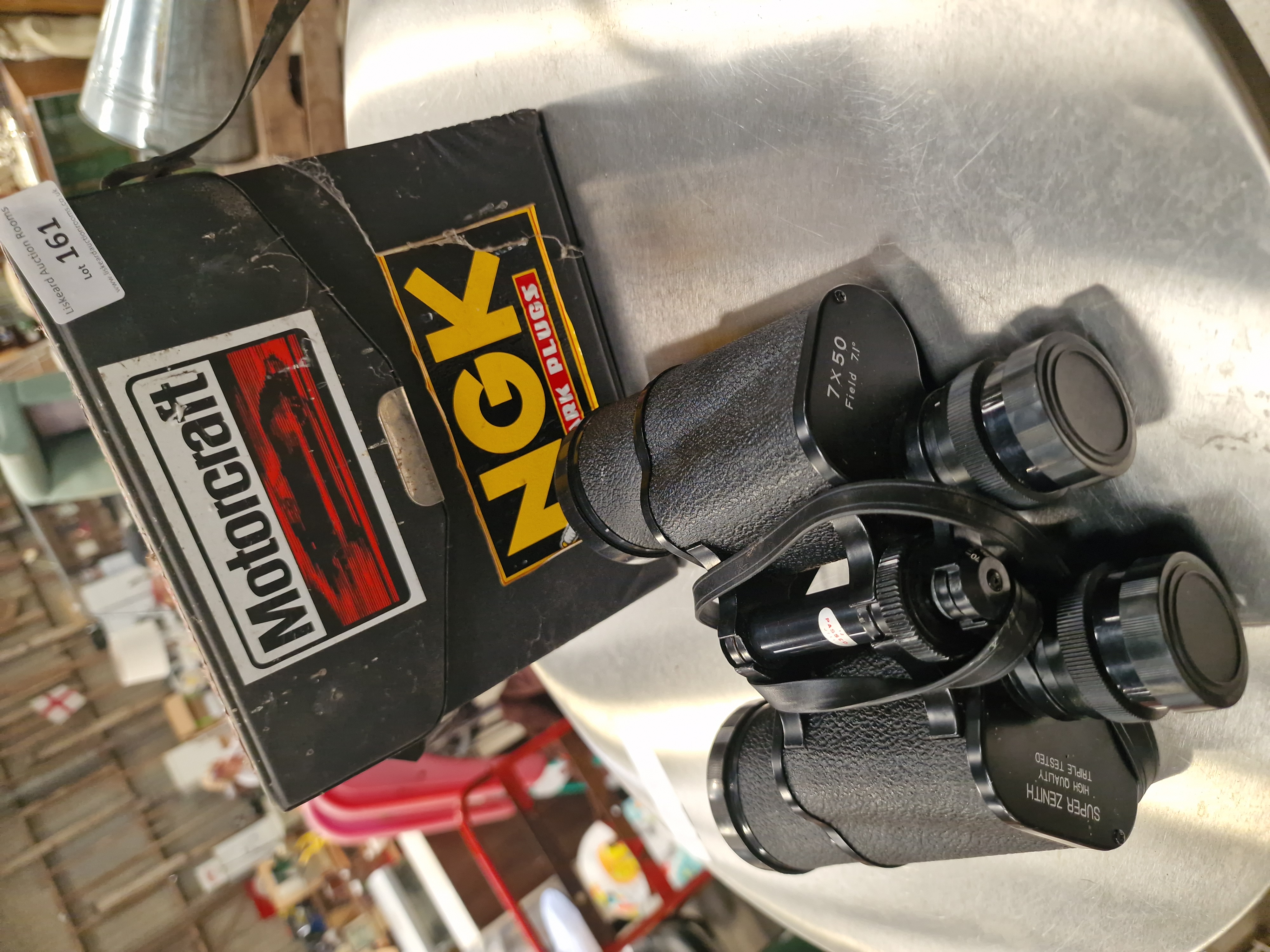 A pair of Super Zenith 7×50 prism binoculars featuring a metal body with textured black synthetic grips. The left prism cover is marked SUPER ZENITH, HIGH QUALITY, and TRIPLE TESTED. The right prism cover is marked 7 X 50 and Field 7.1 degrees. A small oval sticker reading PASSED is located on the central hinge. The instrument is equipped with a central focusing wheel and an adjustable right dioptre. It includes an attached black neck strap and two black plastic eyepiece lens caps. The binoculars are housed in a black leatherette carrying case with a shoulder strap. The exterior of the case is decorated with several automotive-related adhesive stickers, including Motorcraft and NGK SPARK PLUGS. The case also bears a lot tag for Liskeard Auction Rooms (Lot 161).