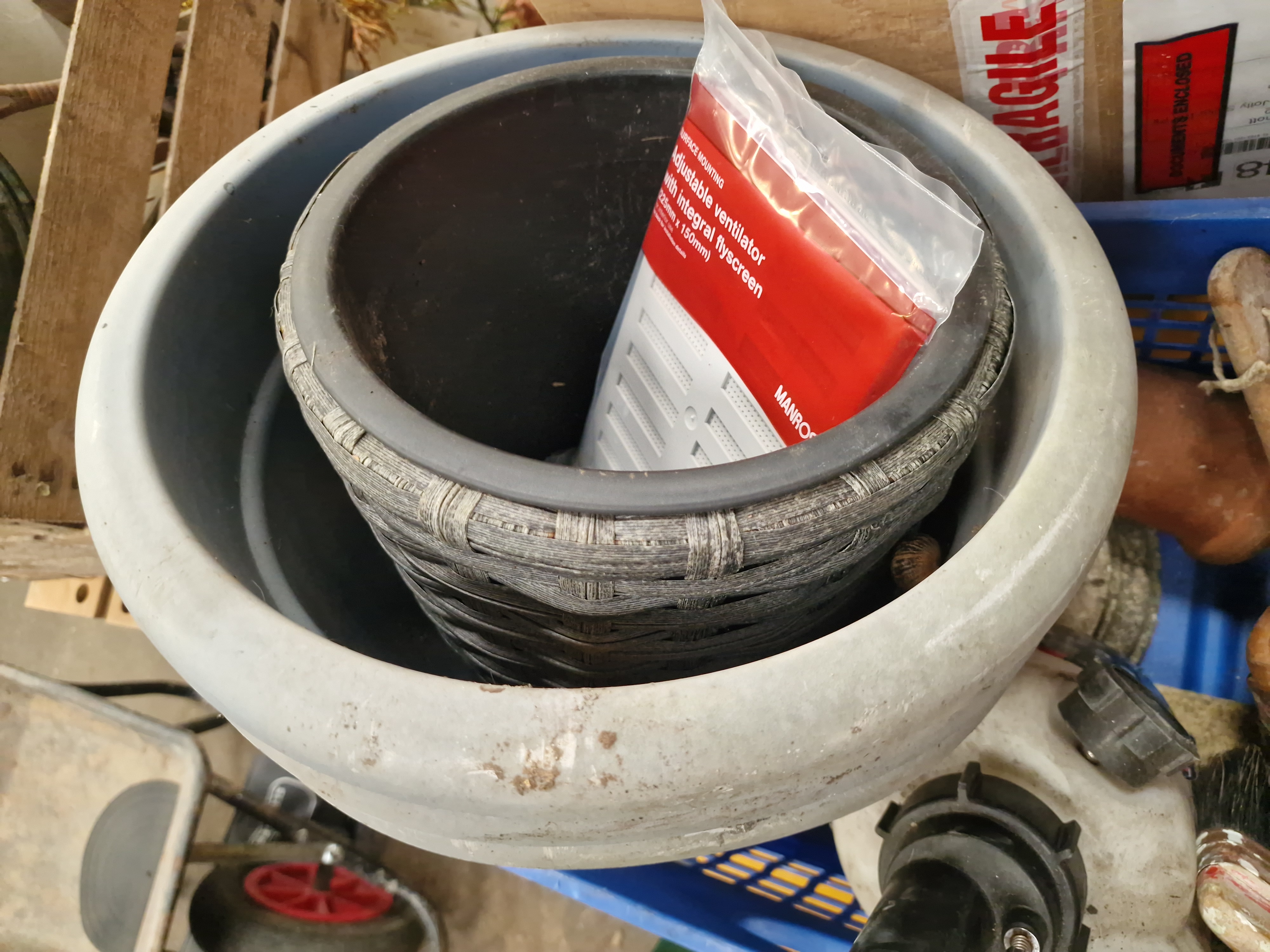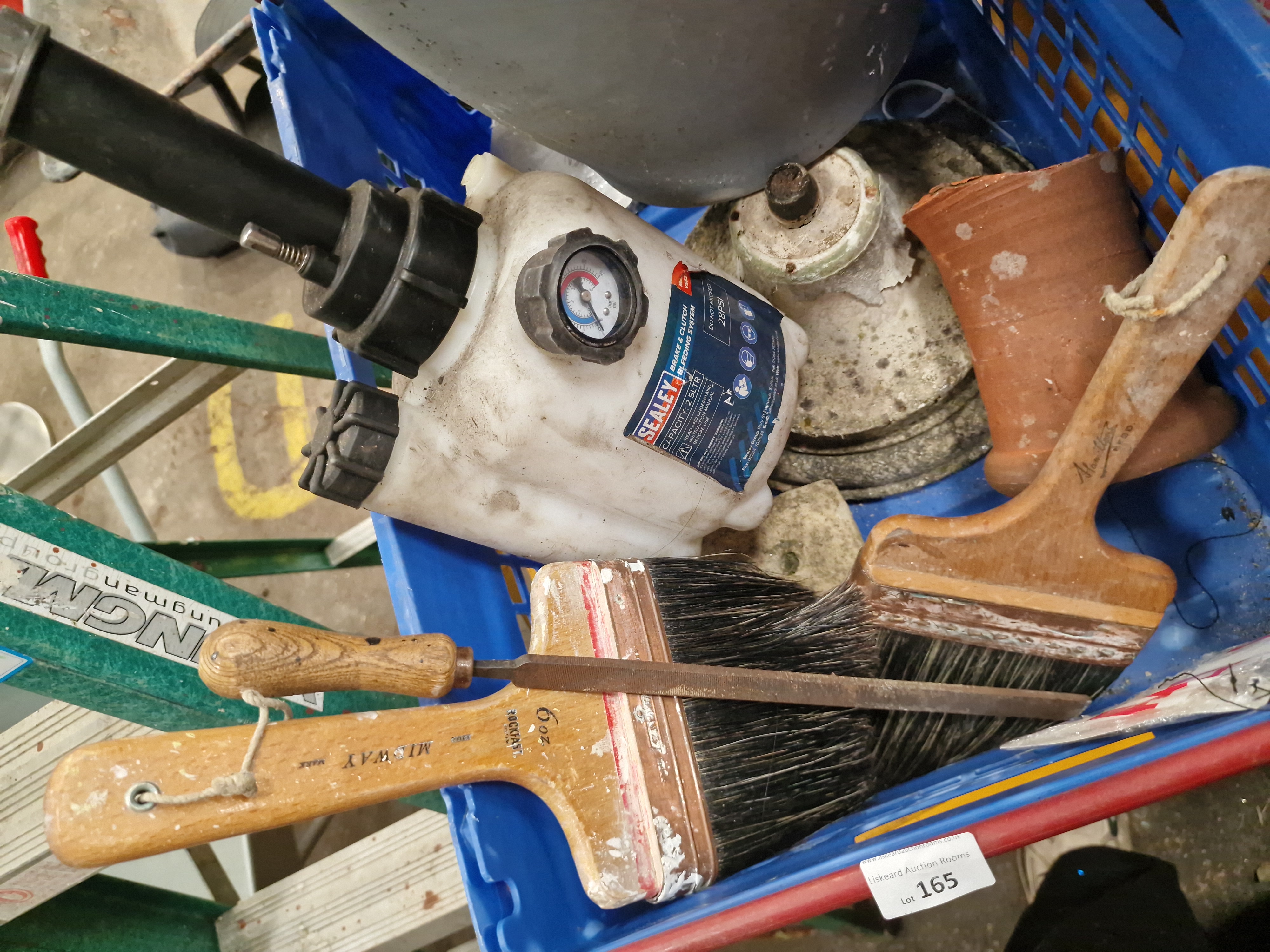 A mixed lot of workshop and garden items contained within a blue plastic crate. The automotive equipment consists of a Sealey brake and clutch bleeding system with a 2.5-litre capacity, featuring a white plastic reservoir, integrated hand pump, and pressure gauge. The building supplies include a Manrose surface-mounting adjustable ventilator with an integral flyscreen, housed in its original plastic packaging. The garden selection comprises a collection of planters, including two large grey composite-style pots, one smaller grey woven-effect plastic pot, and a small terracotta-coloured plastic pot, alongside a reconstituted stone decorative block with a bas-relief floral scroll pattern. The tools include two wooden-handled block brushes and a metal file with a wooden handle. One brush handle is stamped with the marks Midway, Rockfast, and 6oz.