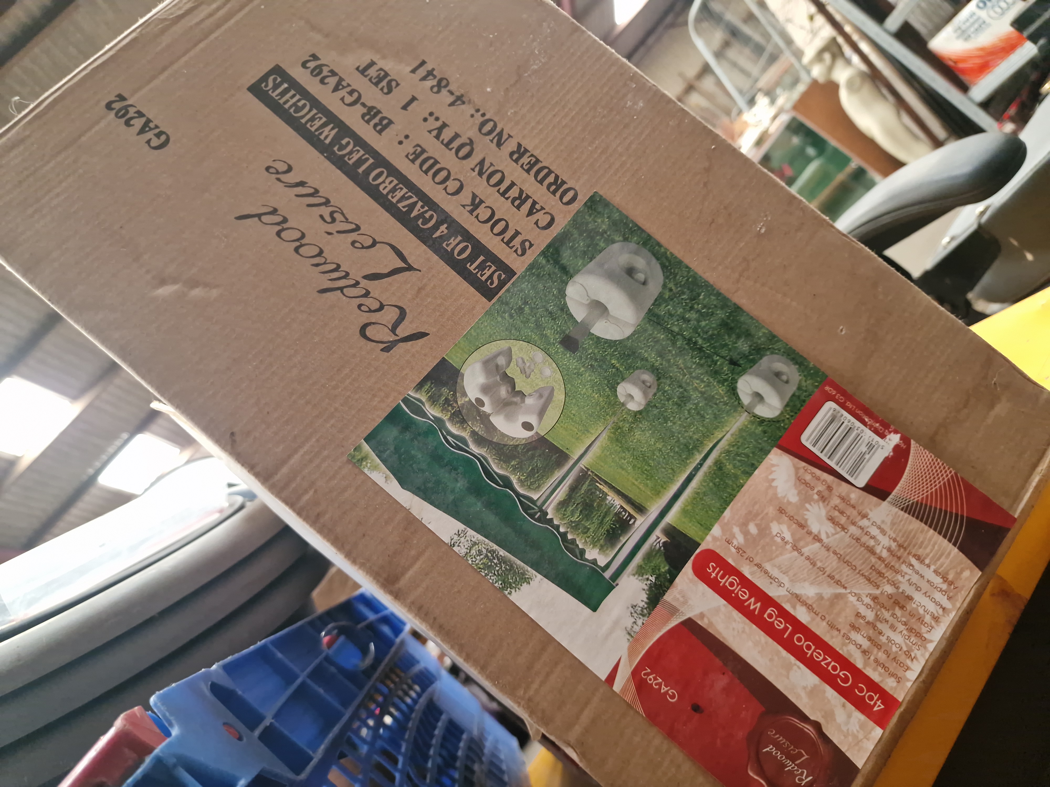 A set of four gazebo leg weights by Redwood Leisure, model number BB-GA292. These units are designed to secure gazebo poles with a maximum diameter of 25mm. The weights are constructed from heavy-duty weather-resistant plastic and are designed to be filled with either water or sand to provide ballast. The product is housed in its original cardboard shipping carton, which bears the Redwood Leisure brand name and references Hamble UK. The packaging includes an EAN barcode 5019553090606 and a Liskeard Auction Rooms lot sticker for Lot 166.