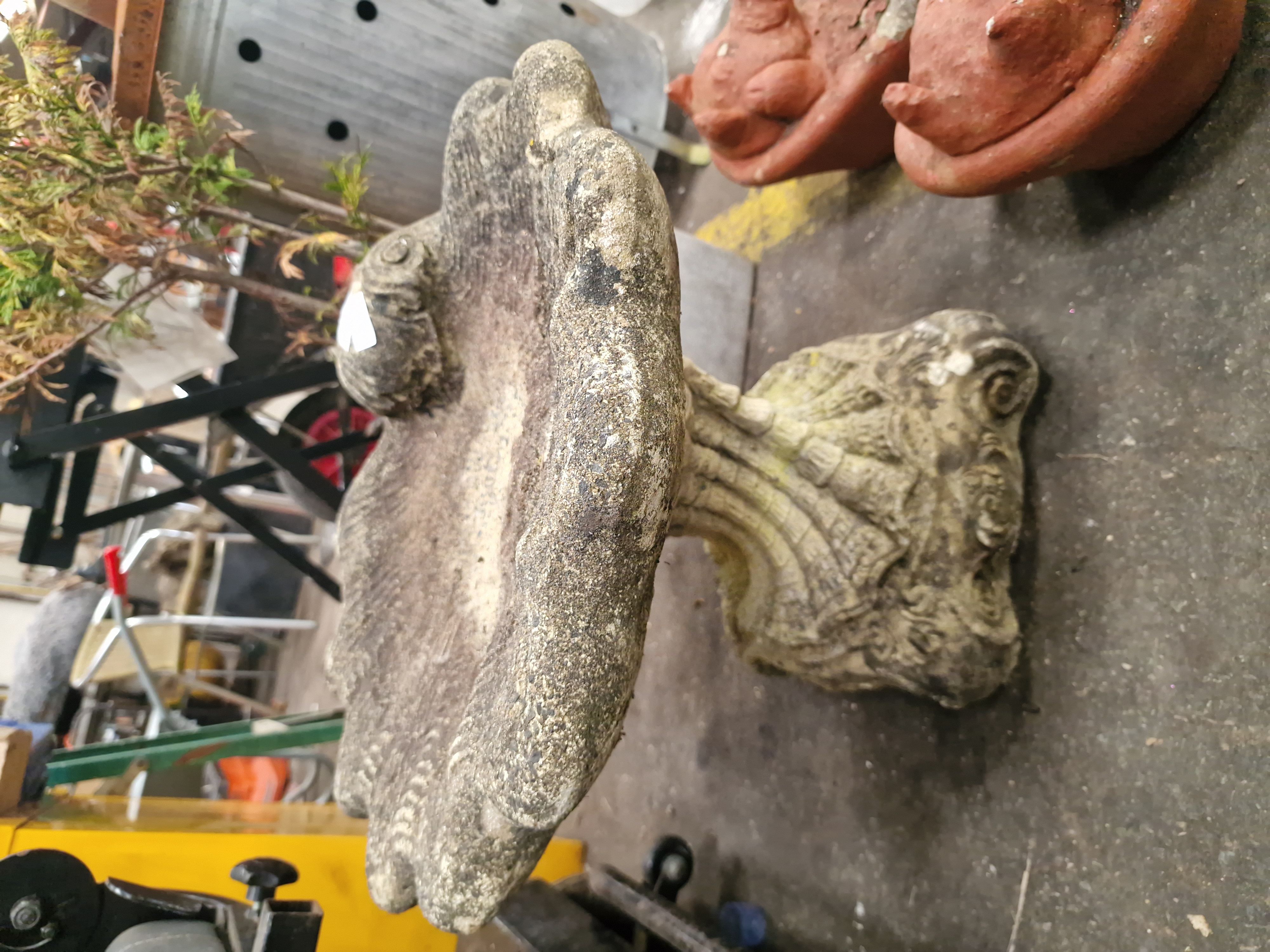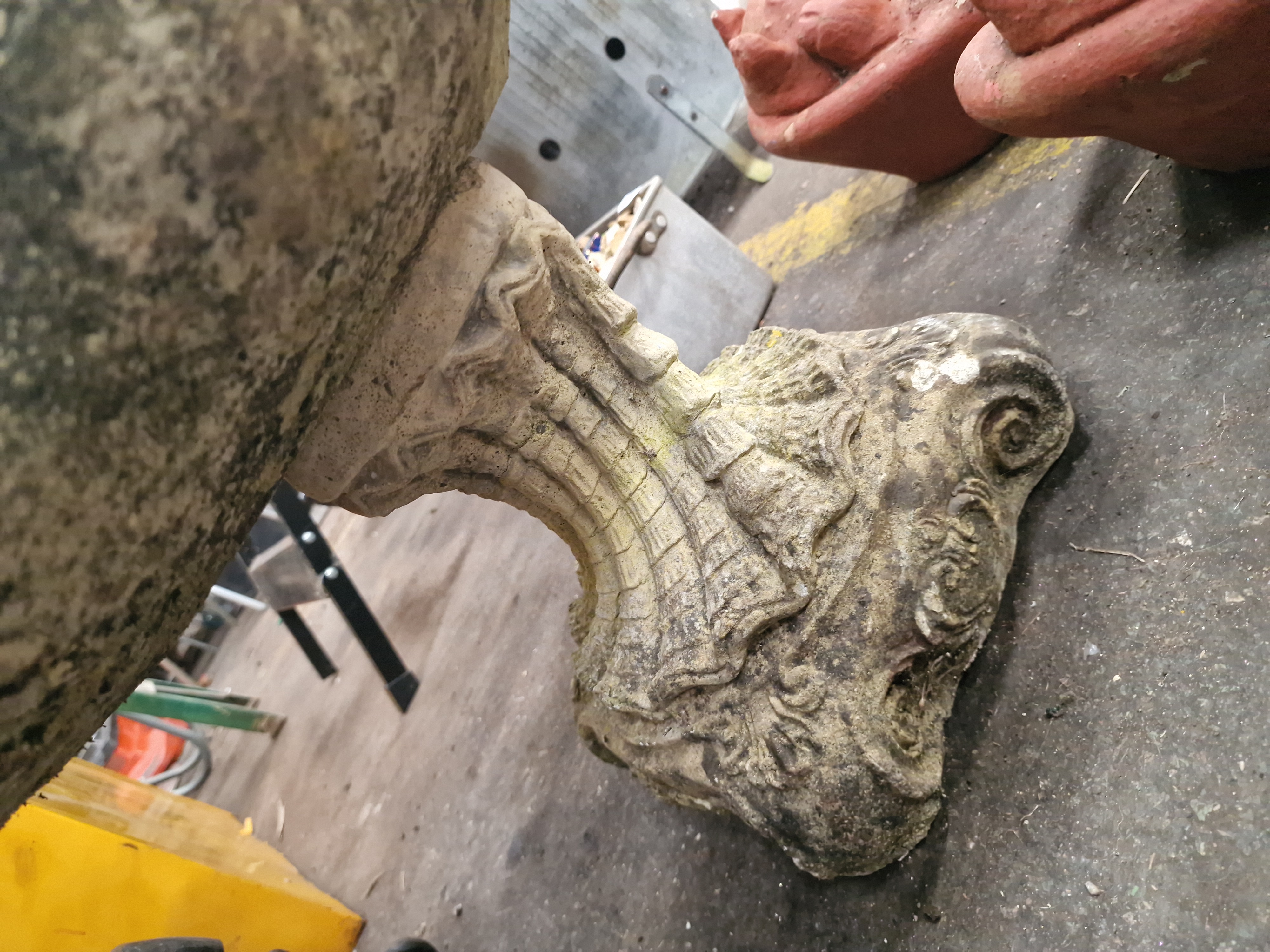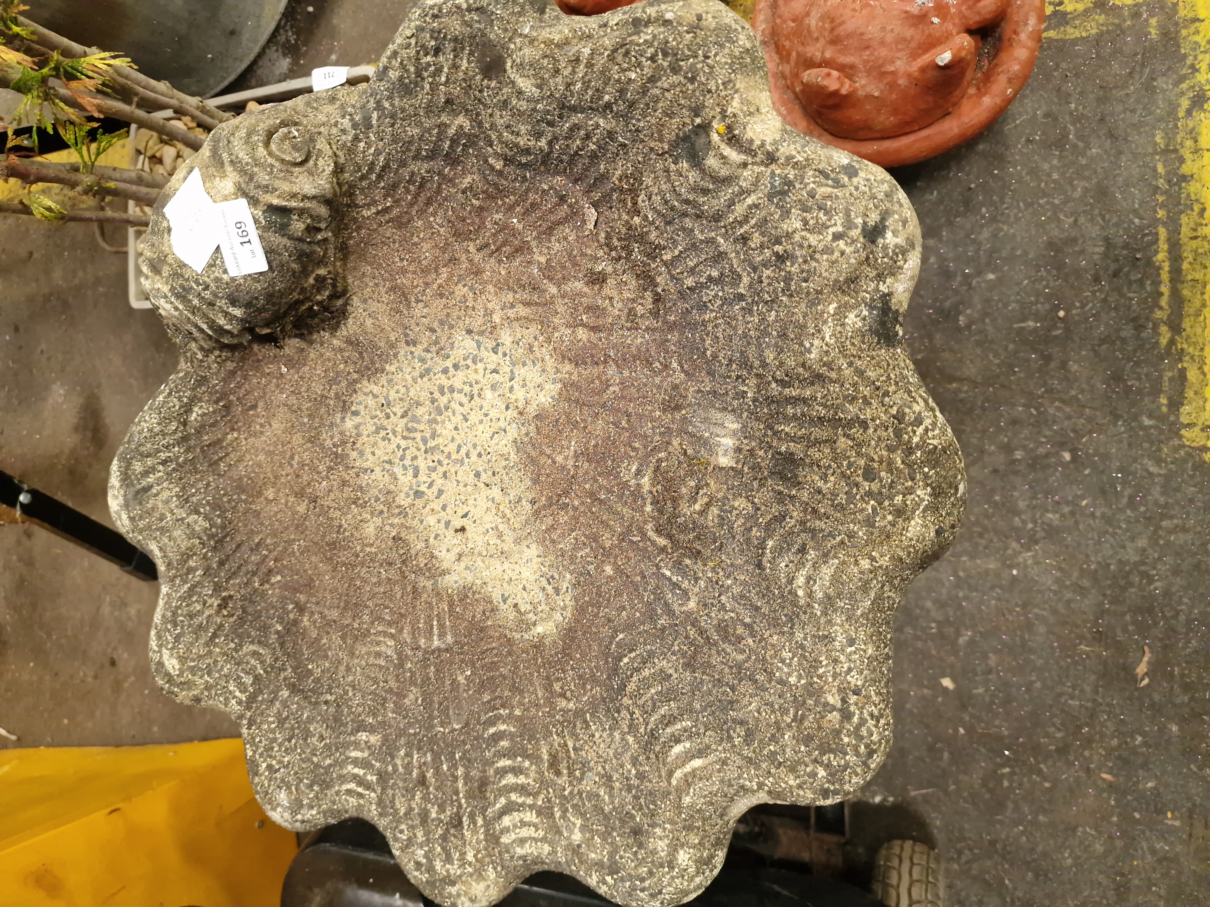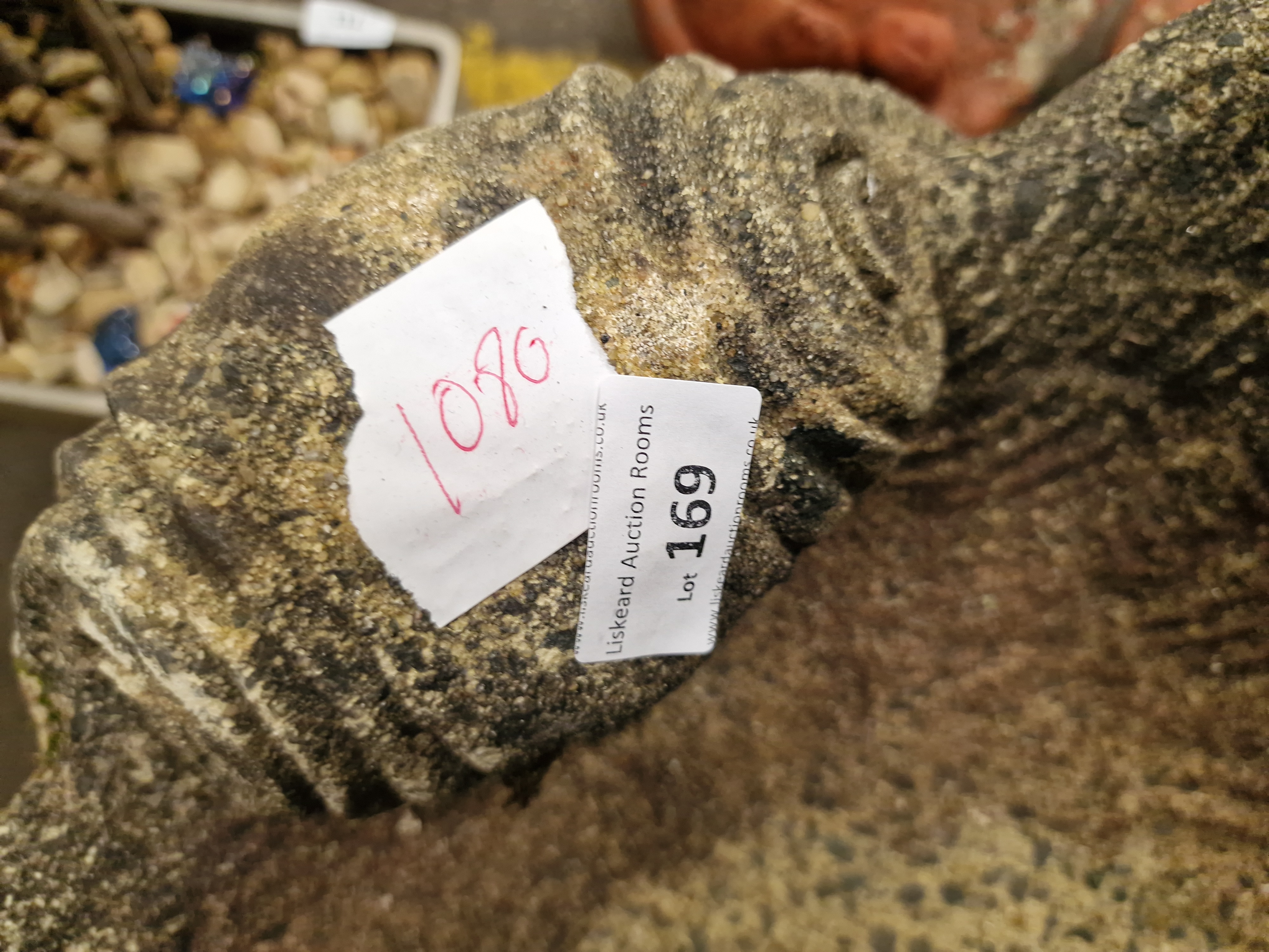 Lot 169: A twentieth-century reconstituted stone bird bath with scalloped bowl and decorative pedestal