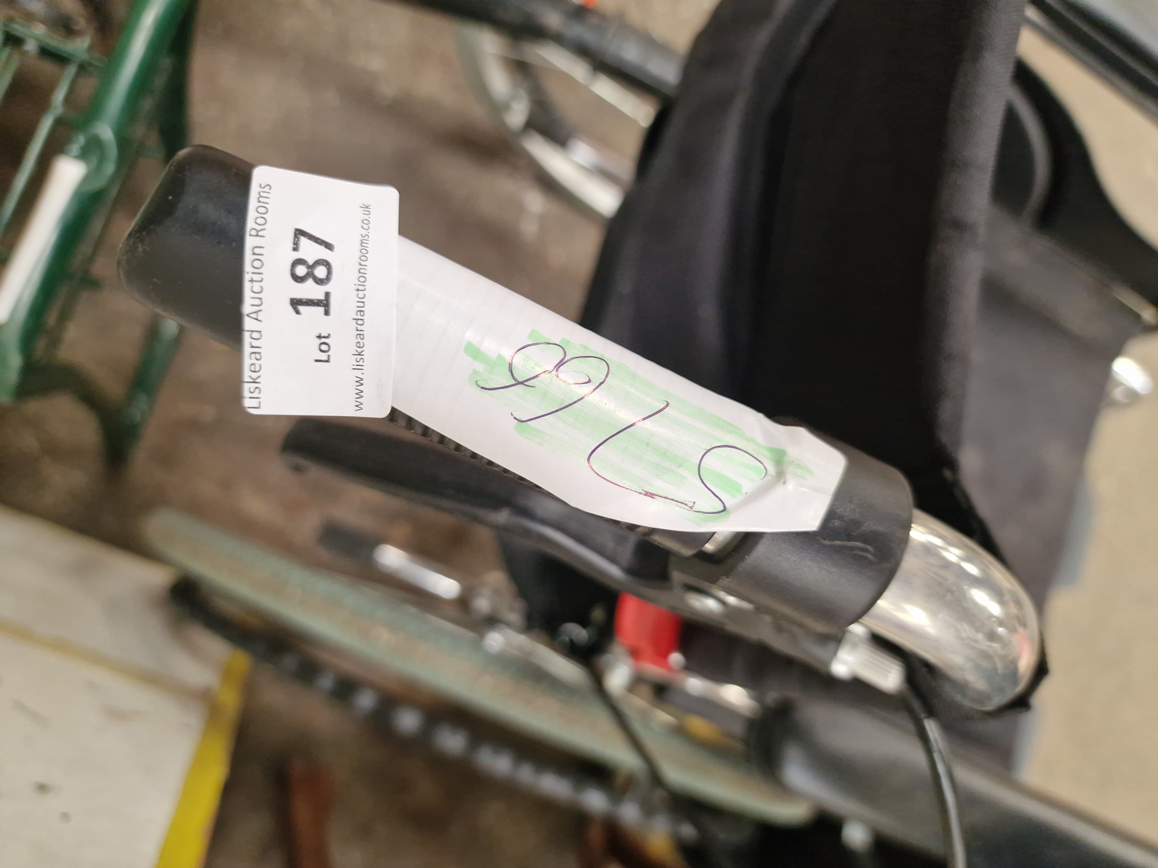 A contemporary manual folding wheelchair featuring a chrome-plated metal frame and a black synthetic fabric seat and backrest. The design incorporates padded black armrests, two large spoked rear wheels with integrated push rims, and two smaller front casters. The chair is equipped with swing-away footrests featuring textured black plastic plates and hand-operated brakes mounted on the push handles. A paper lot sticker from Liskeard Auction Rooms (Lot 187) is attached to the left handle. The frame is constructed of tubular metal with a folding cross-brace mechanism for transport and storage.