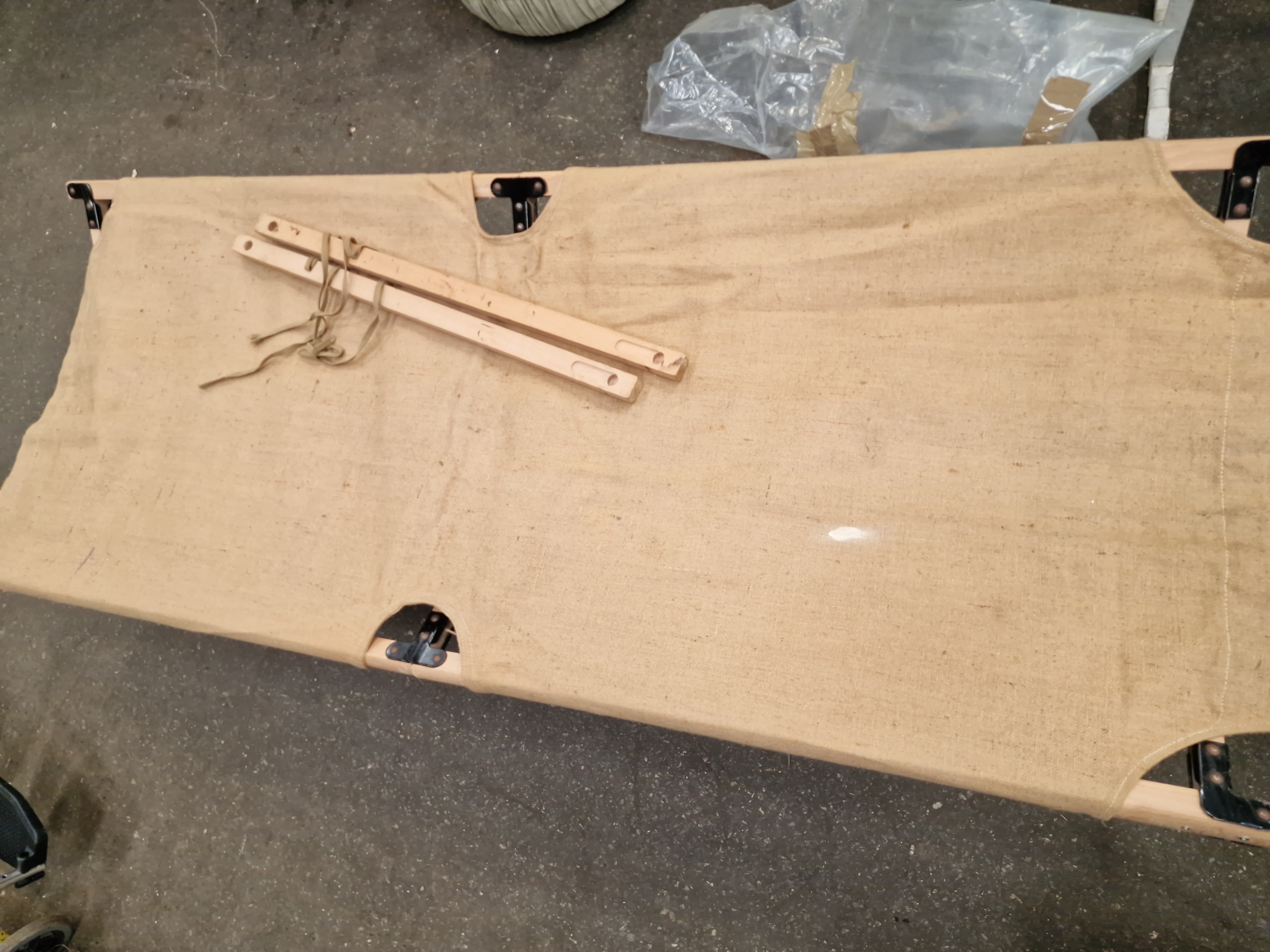 In the style of the Maine Heritage Cot, this contemporary folding camp bed features a light-coloured wooden frame and a tan canvas sling. The structure is supported by three sets of black-painted metal X-frame legs. The lot includes two wooden end-stretchers, one of which retains an attached cord, designed for assembly and tensioning of the bed surface. The construction is reminiscent of traditional military field beds and campaign furniture. No maker’s marks, brand names, or country of origin labels are visible on the frame, fabric, or hardware.