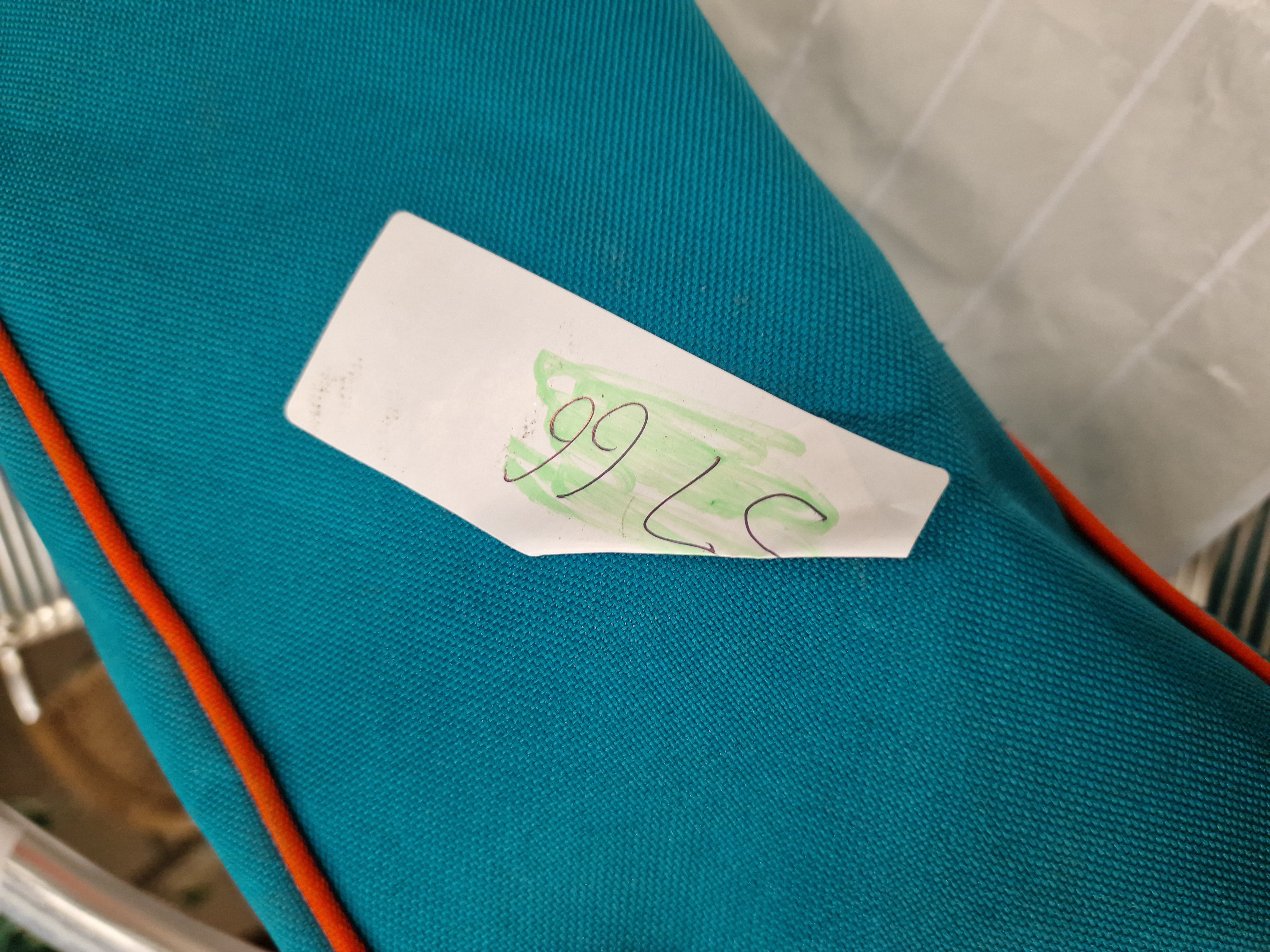 A portable 12V DC mini air compressor featuring a black plastic housing with an integrated analogue pressure gauge. The unit is rated for a maximum pressure of 250 PSI (8 BAR) and operates on a 10A current. It is equipped with a coiled black air hose, a thumb-lock valve connector, and a power cable designed for use with a vehicle auxiliary socket. The compressor is housed in a teal and orange fabric zip-up bag featuring the Physio Sport logo and the Olympic Rings, with a printed notice regarding the licensing of the Olympic symbol from the International Olympic Committee. A lot sticker for Liskeard Auction Rooms (Lot 195) is present on the bag. No manufacturer name is visible on the unit. CFM output is not specified. Hours of usage are not recorded.