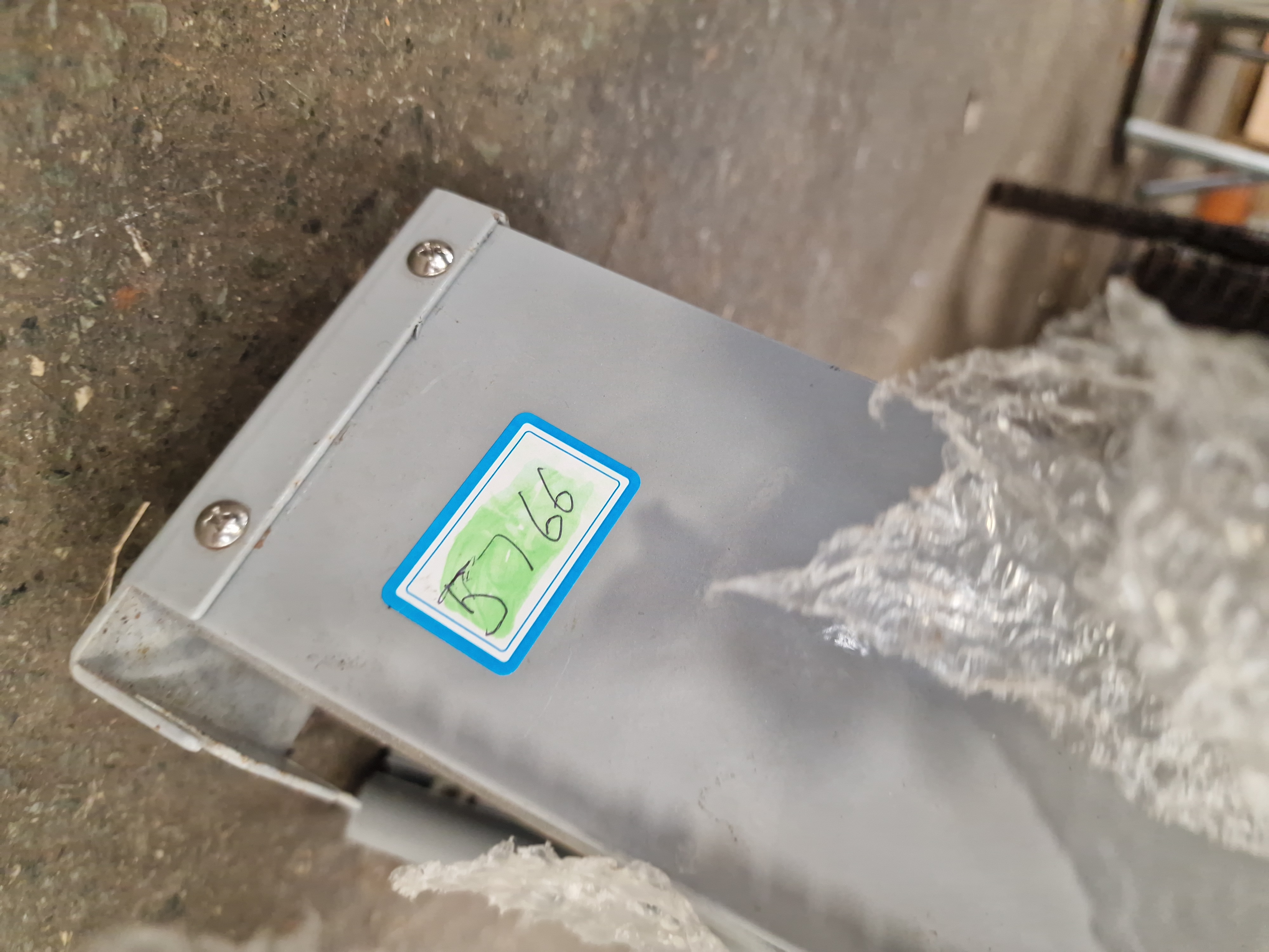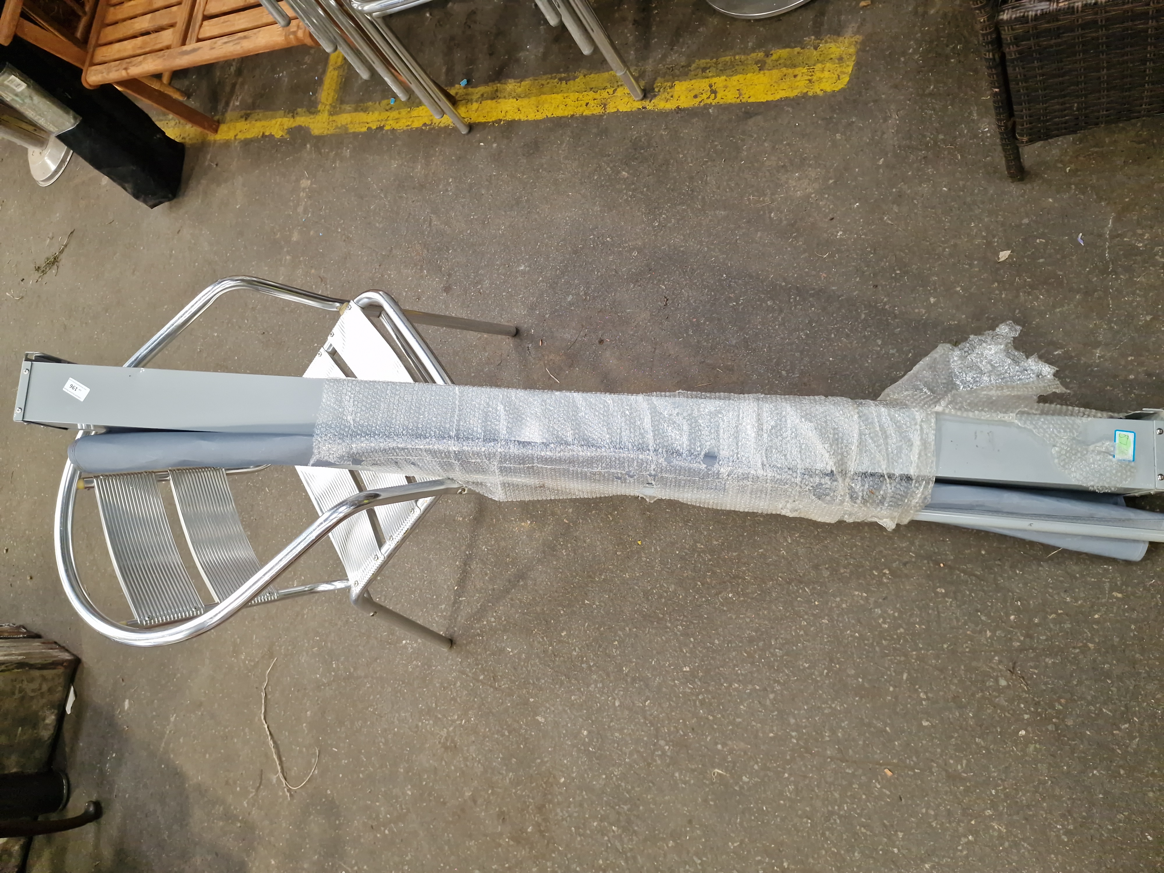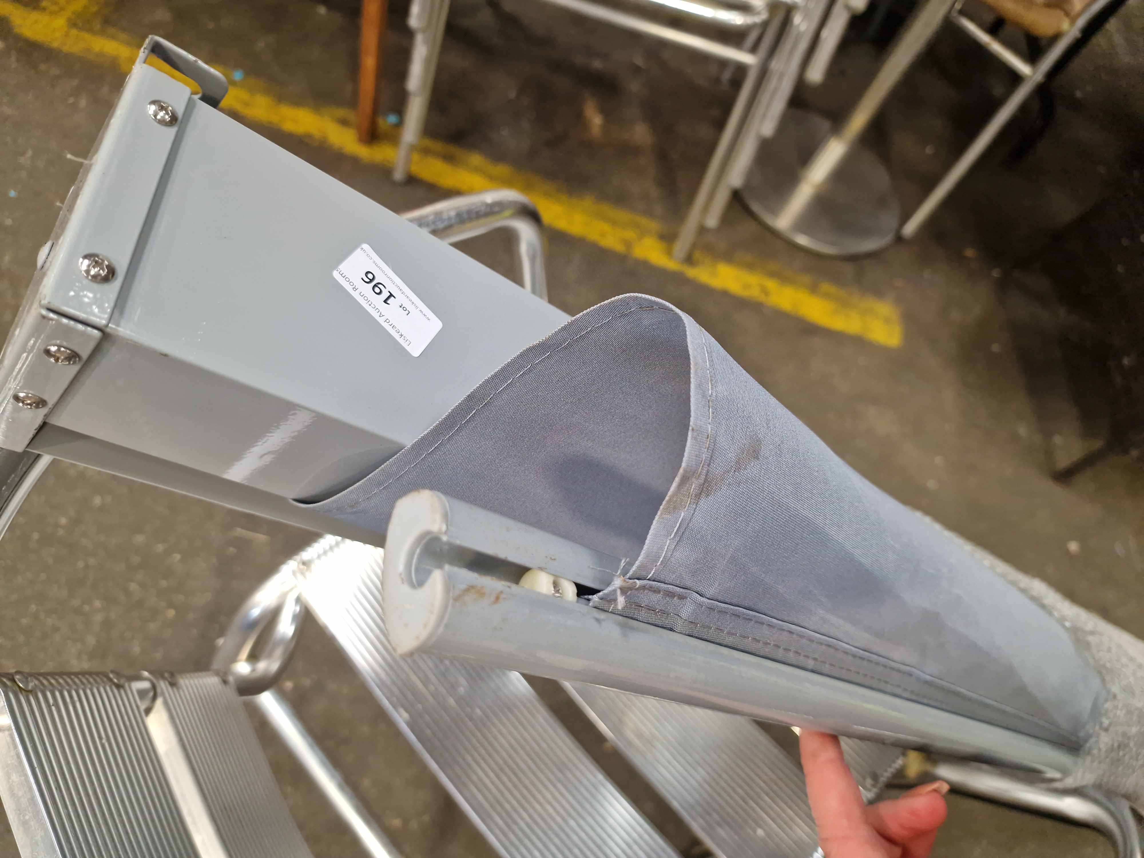 A single manual retractable outdoor side awning or privacy screen. The unit features a grey fabric screen housed within a grey powder-coated metal casing. The item is designed for wall mounting to provide a pull-out barrier for garden or patio use. The unit is loose and partially wrapped in bubble wrap. A small sticker is attached to one end with the handwritten characters B, 7, 6, 6 inside a blue border. The casing also bears a lot sticker for Lot 196 from Liskeard Auction Rooms. No manufacturer brand names or model numbers are visible on the item.