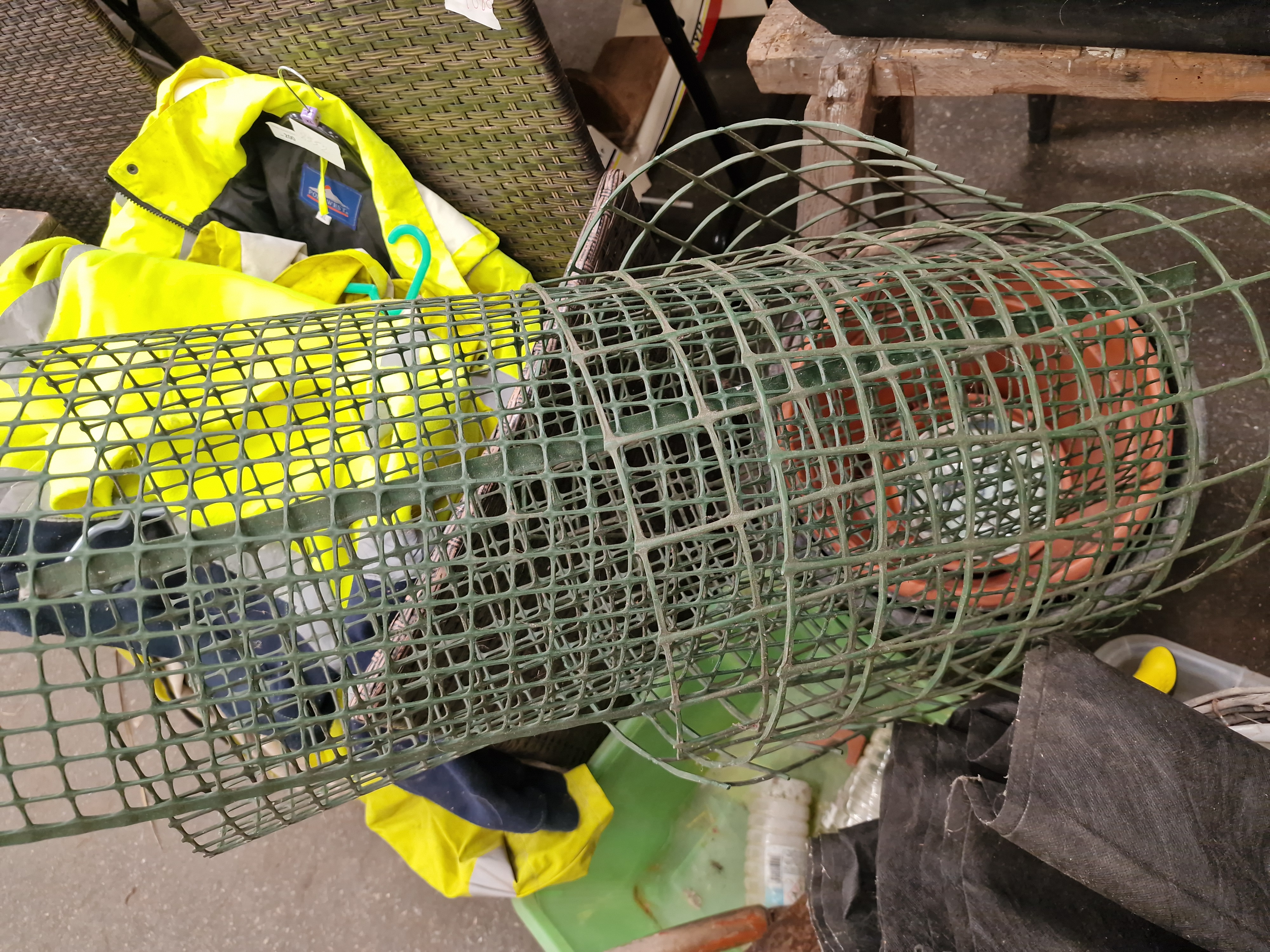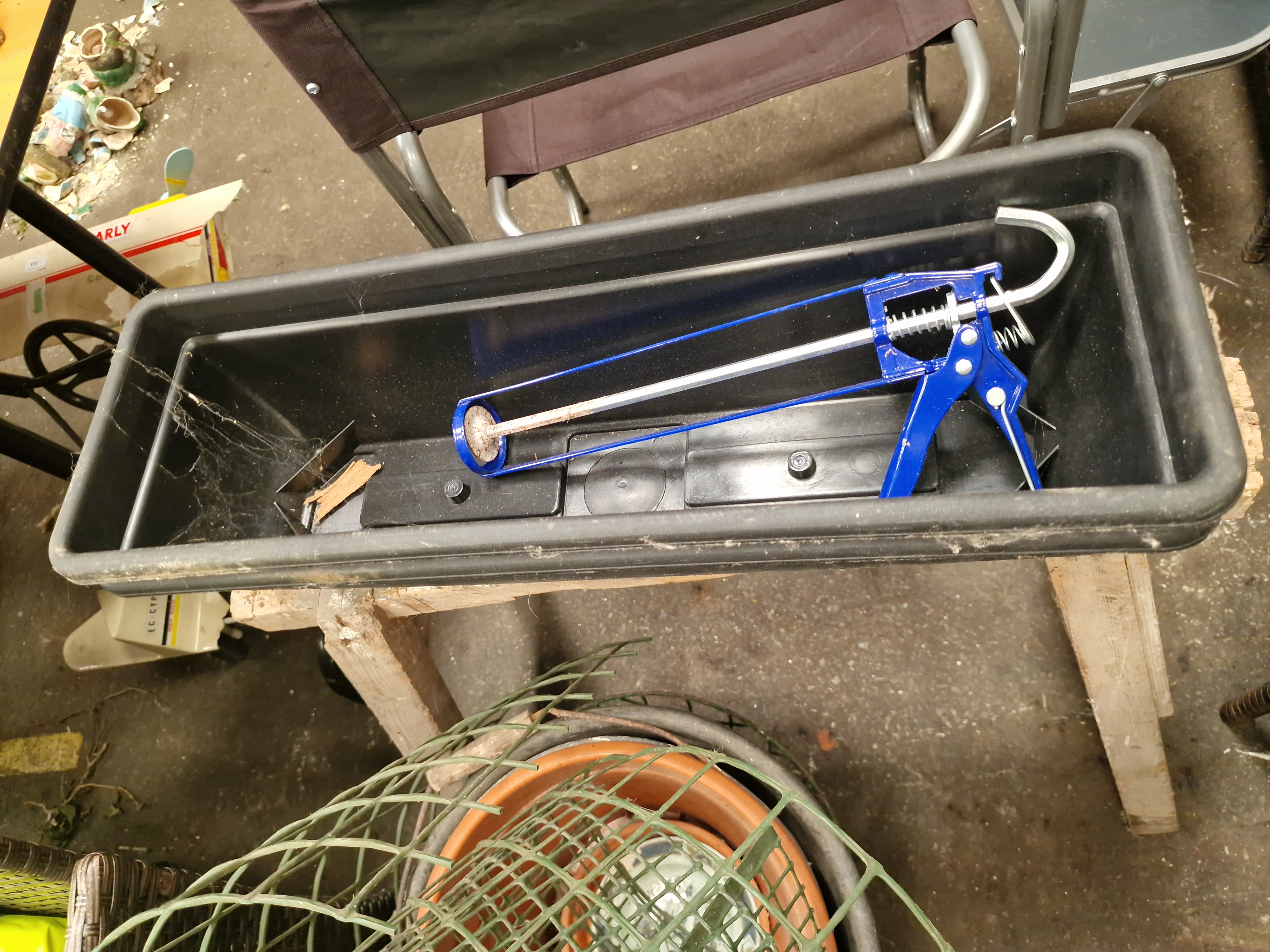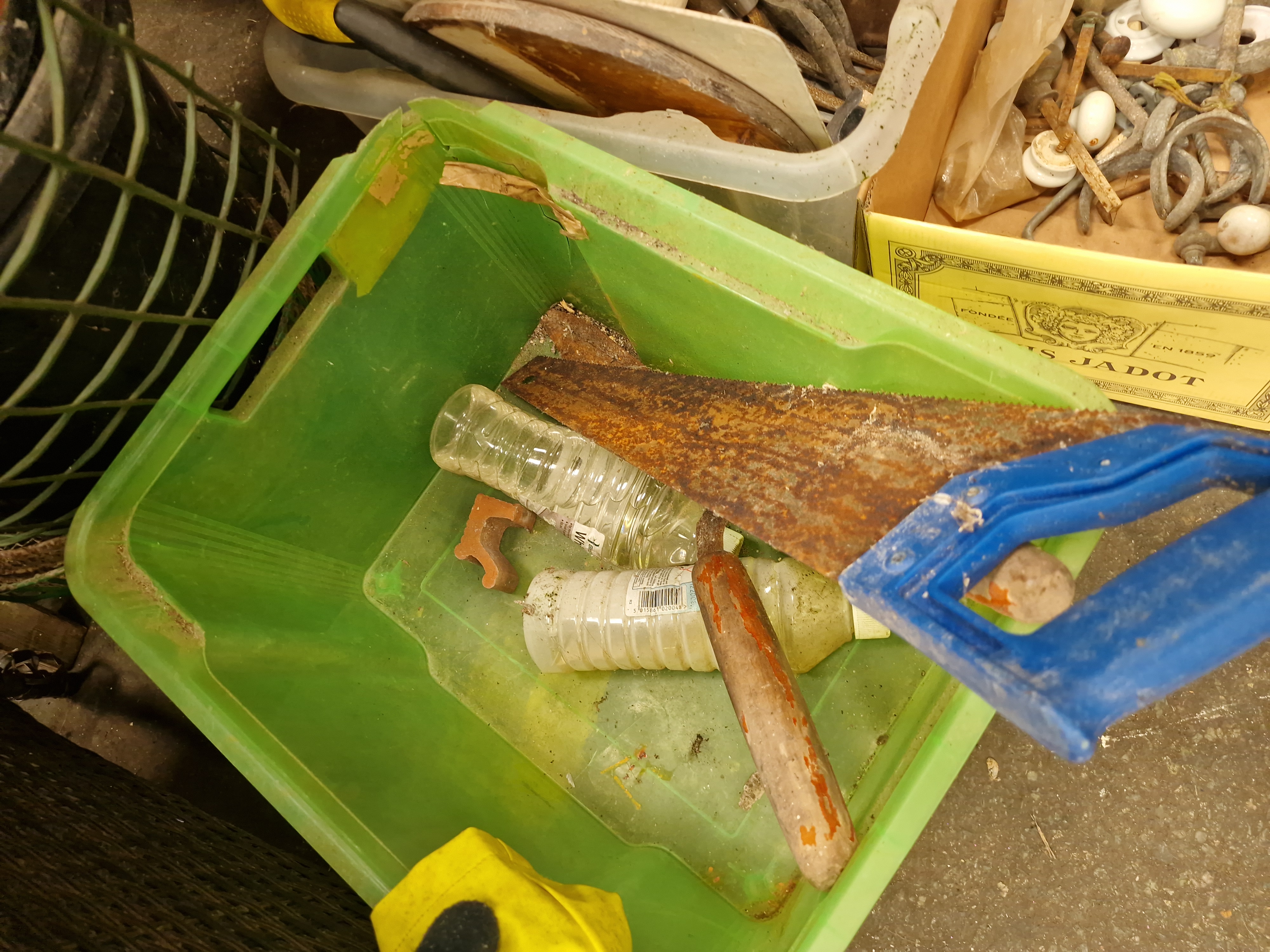 A collection of masonry and hand tools, architectural hardware, and garden sundries. The masonry equipment includes several wooden-handled plastering trowels, a rectangular finishing trowel, and a blue metal skeleton-frame caulking gun. Hand tools include a saw with a blue plastic handle and a garden hand fork with a wooden handle. The architectural hardware consists of white and cream ceramic door knobs with associated metal hooks, fasteners, and latches. Garden items include a roll of green plastic mesh fencing, a wire-framed hanging basket with a woven rim and fabric liner, and multiple plastic plant pots in terracotta and black, including a trough-style planter. Miscellaneous items include a yellow reflective work jacket by Portwest, a wooden wine crate marked Louis Jadot, Fondée en 1859, and various plastic storage containers and crates.