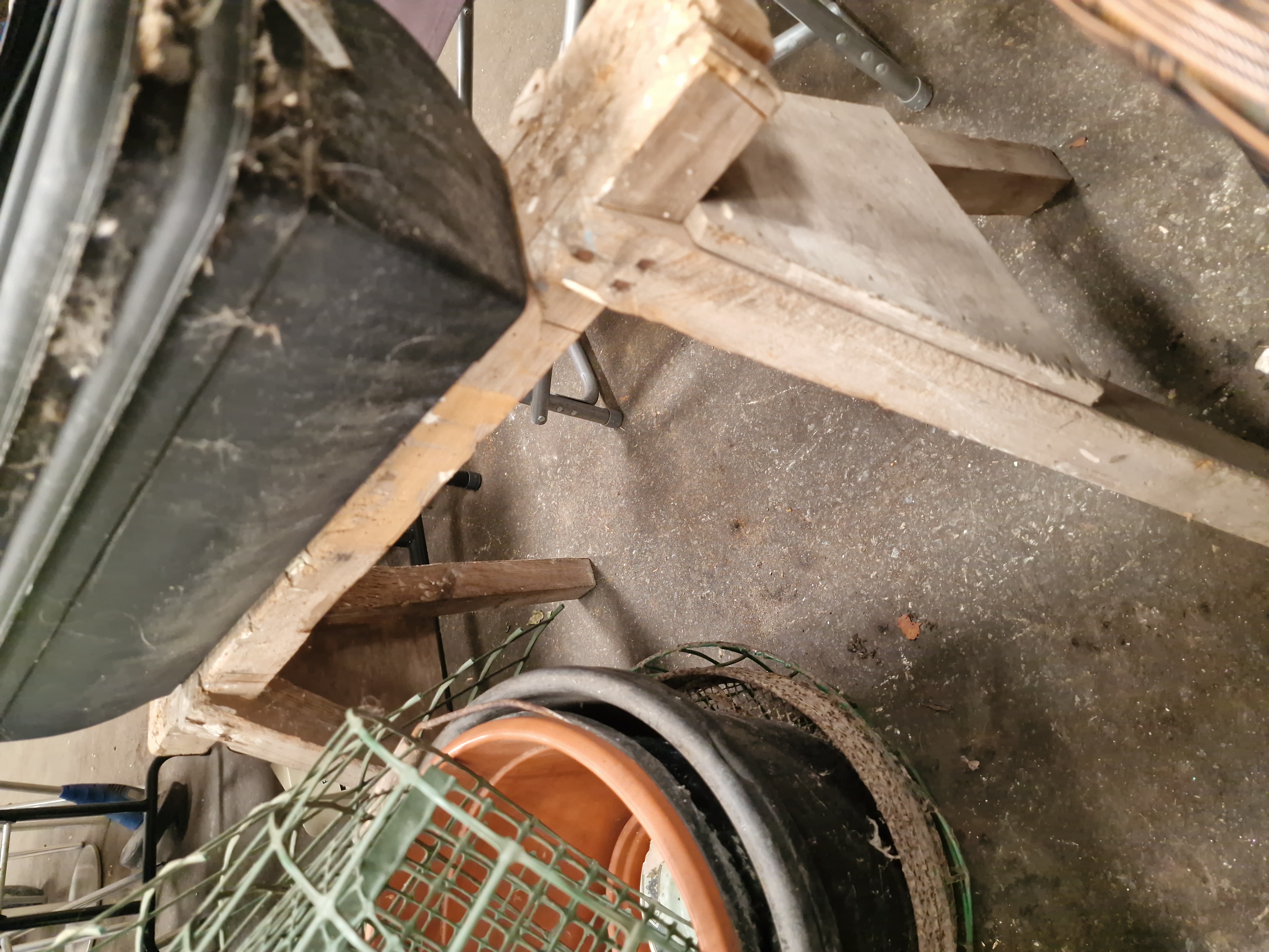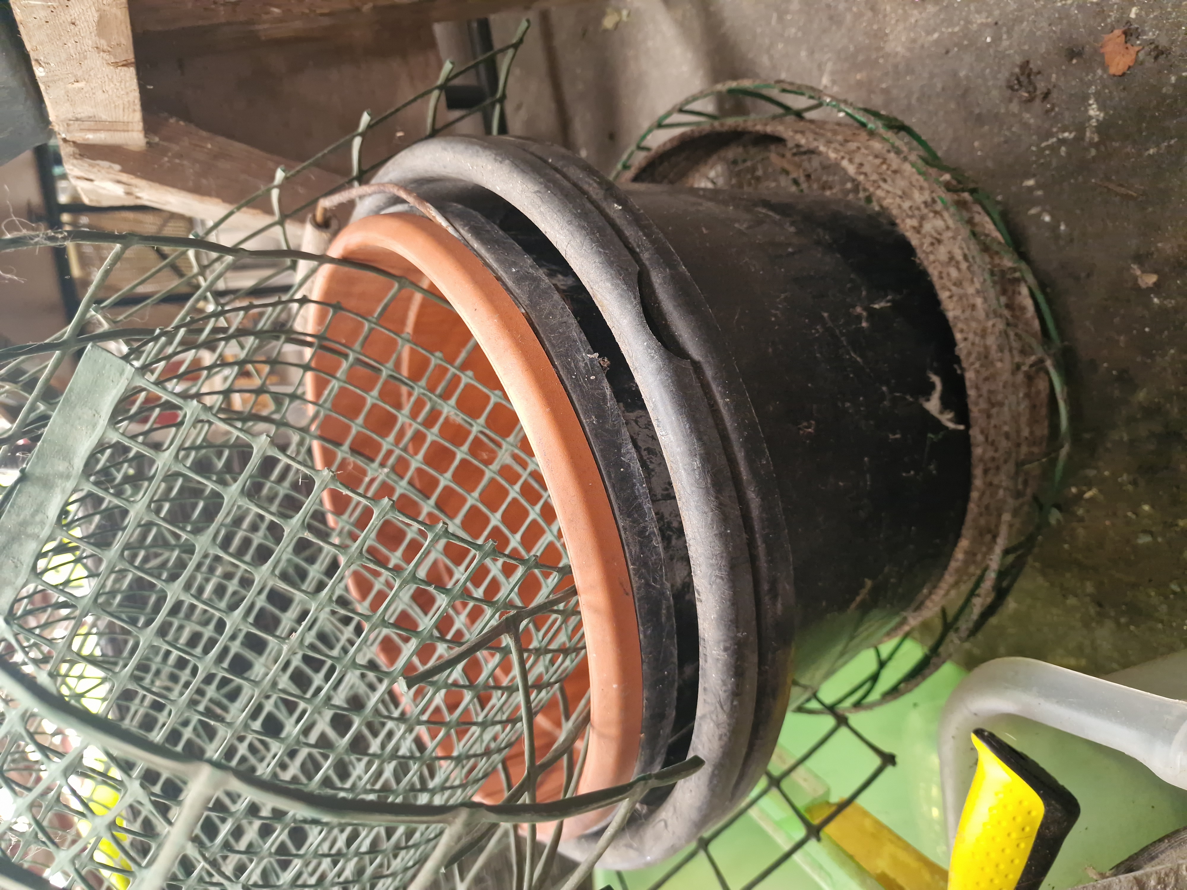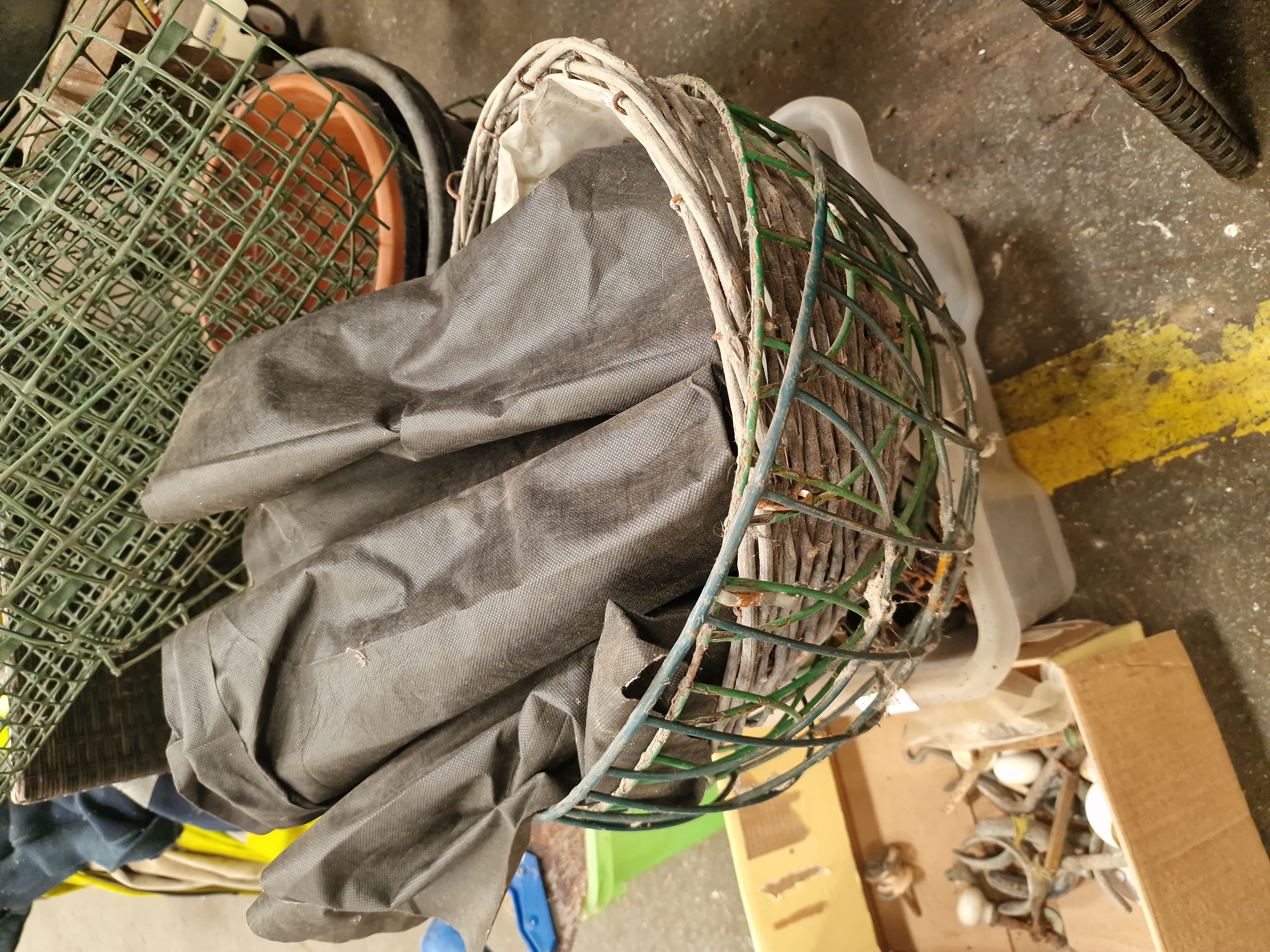 A collection of masonry and hand tools, architectural hardware, and garden sundries. The masonry equipment includes several wooden-handled plastering trowels, a rectangular finishing trowel, and a blue metal skeleton-frame caulking gun. Hand tools include a saw with a blue plastic handle and a garden hand fork with a wooden handle. The architectural hardware consists of white and cream ceramic door knobs with associated metal hooks, fasteners, and latches. Garden items include a roll of green plastic mesh fencing, a wire-framed hanging basket with a woven rim and fabric liner, and multiple plastic plant pots in terracotta and black, including a trough-style planter. Miscellaneous items include a yellow reflective work jacket by Portwest, a wooden wine crate marked Louis Jadot, Fondée en 1859, and various plastic storage containers and crates.