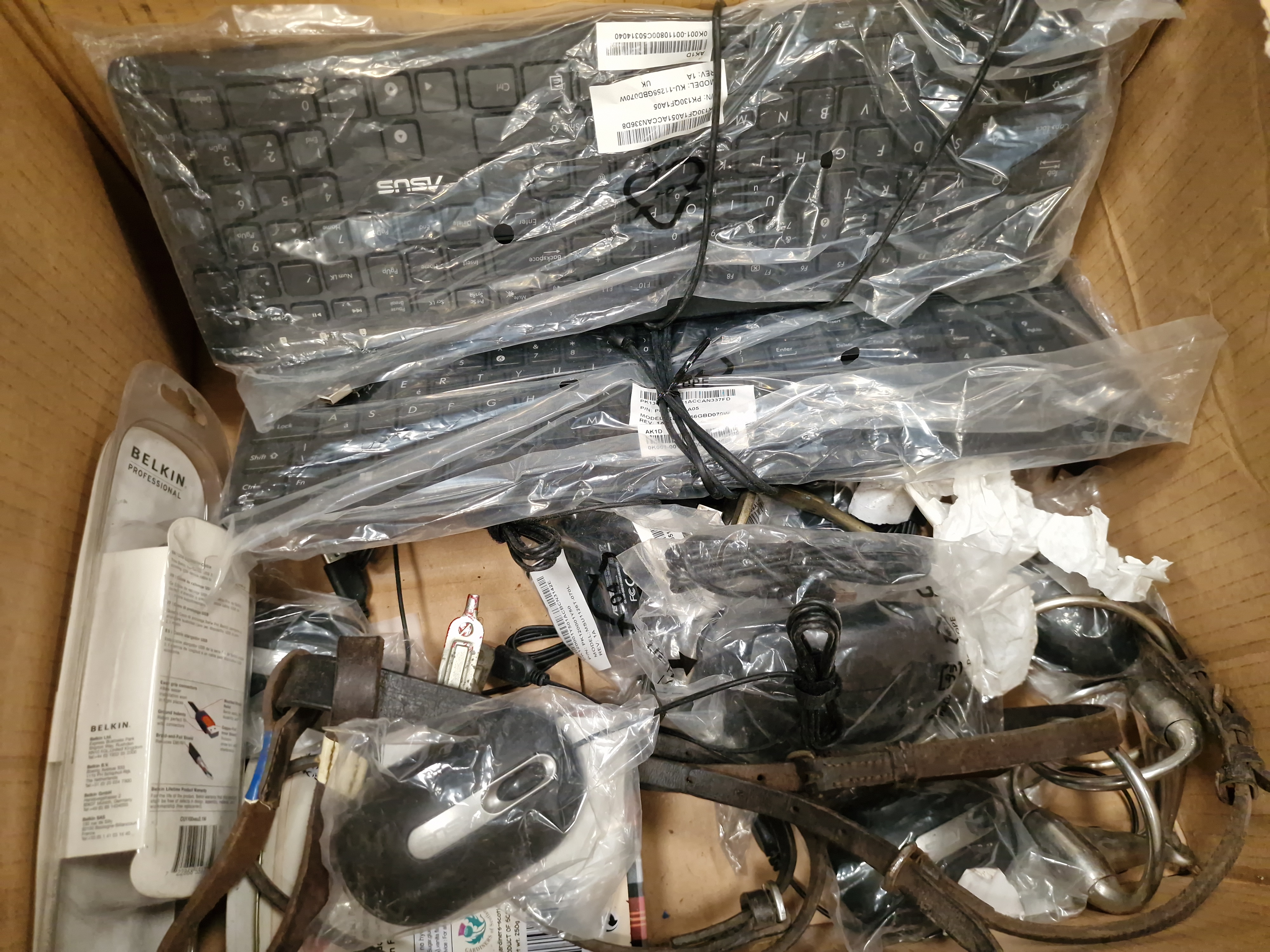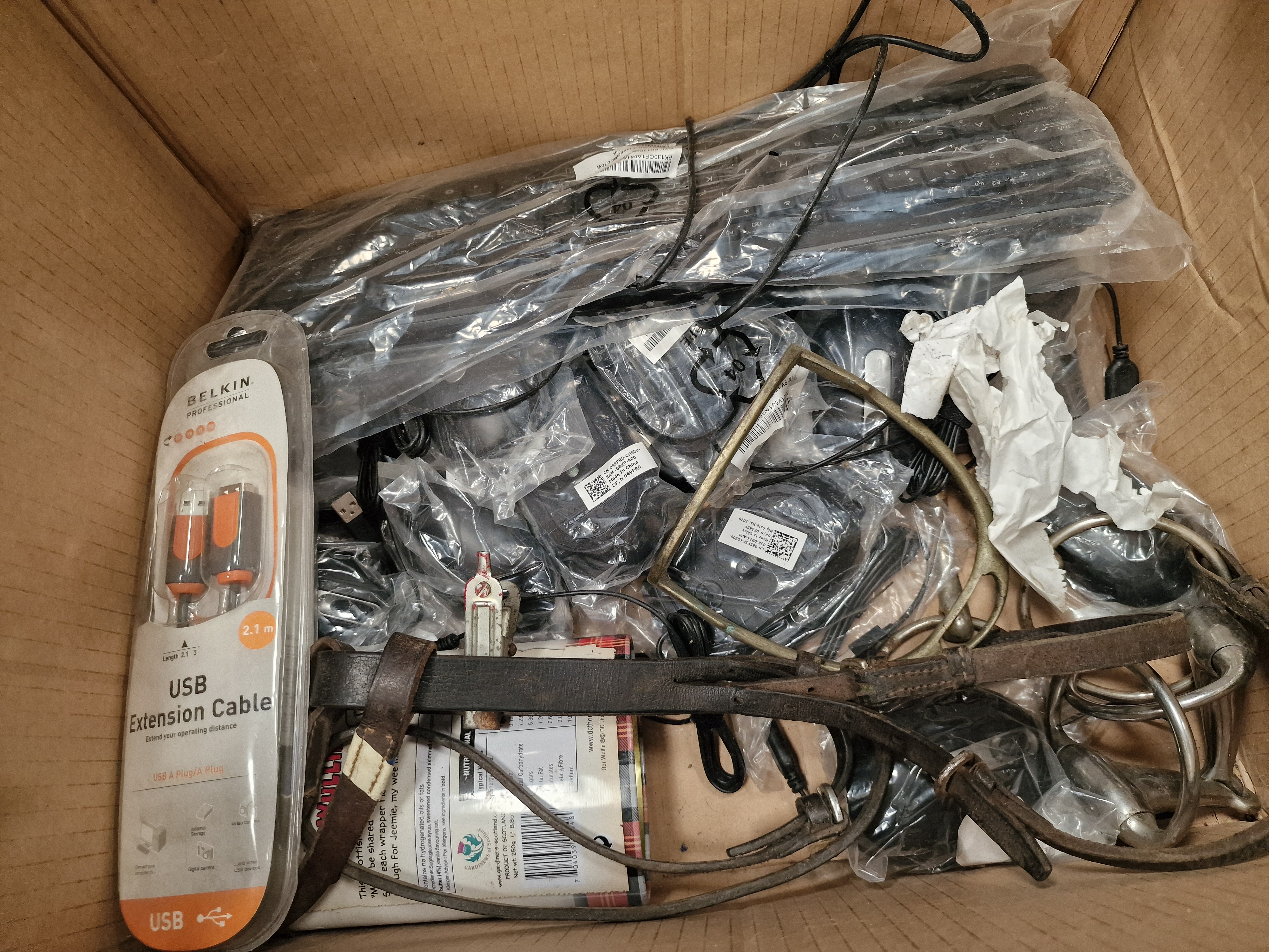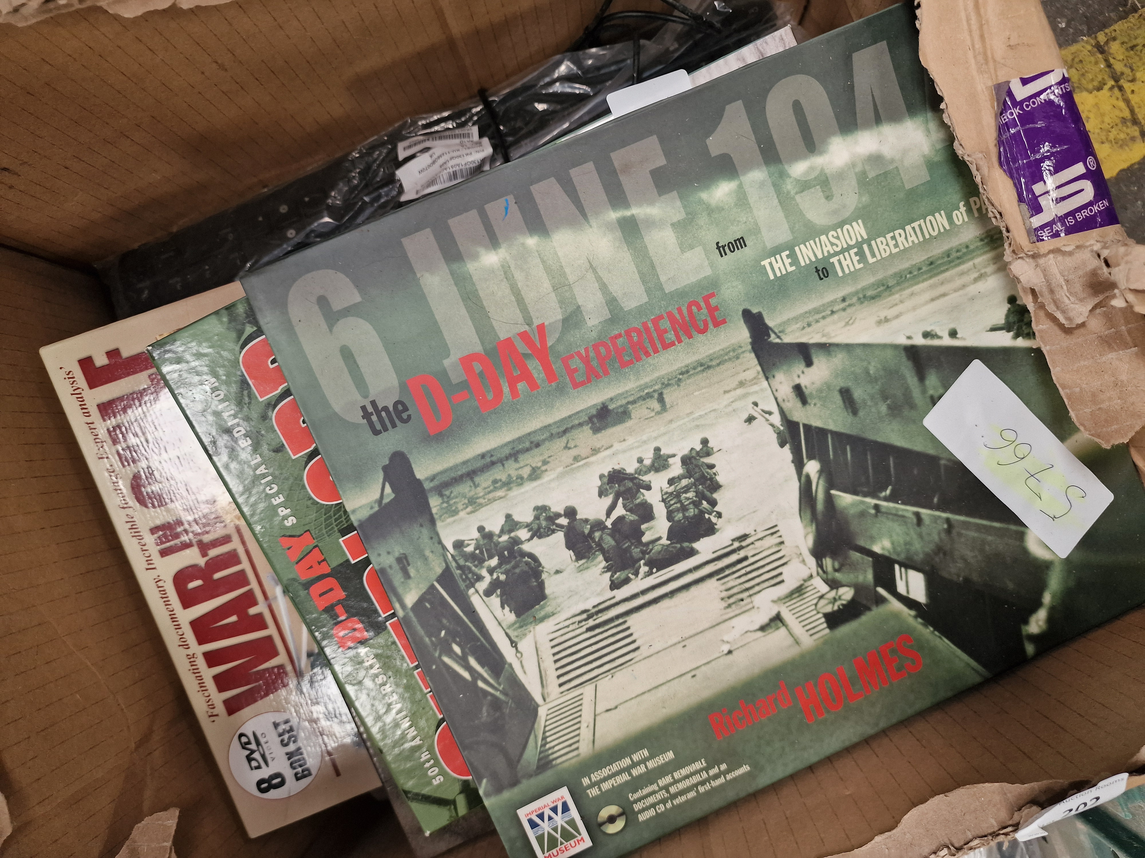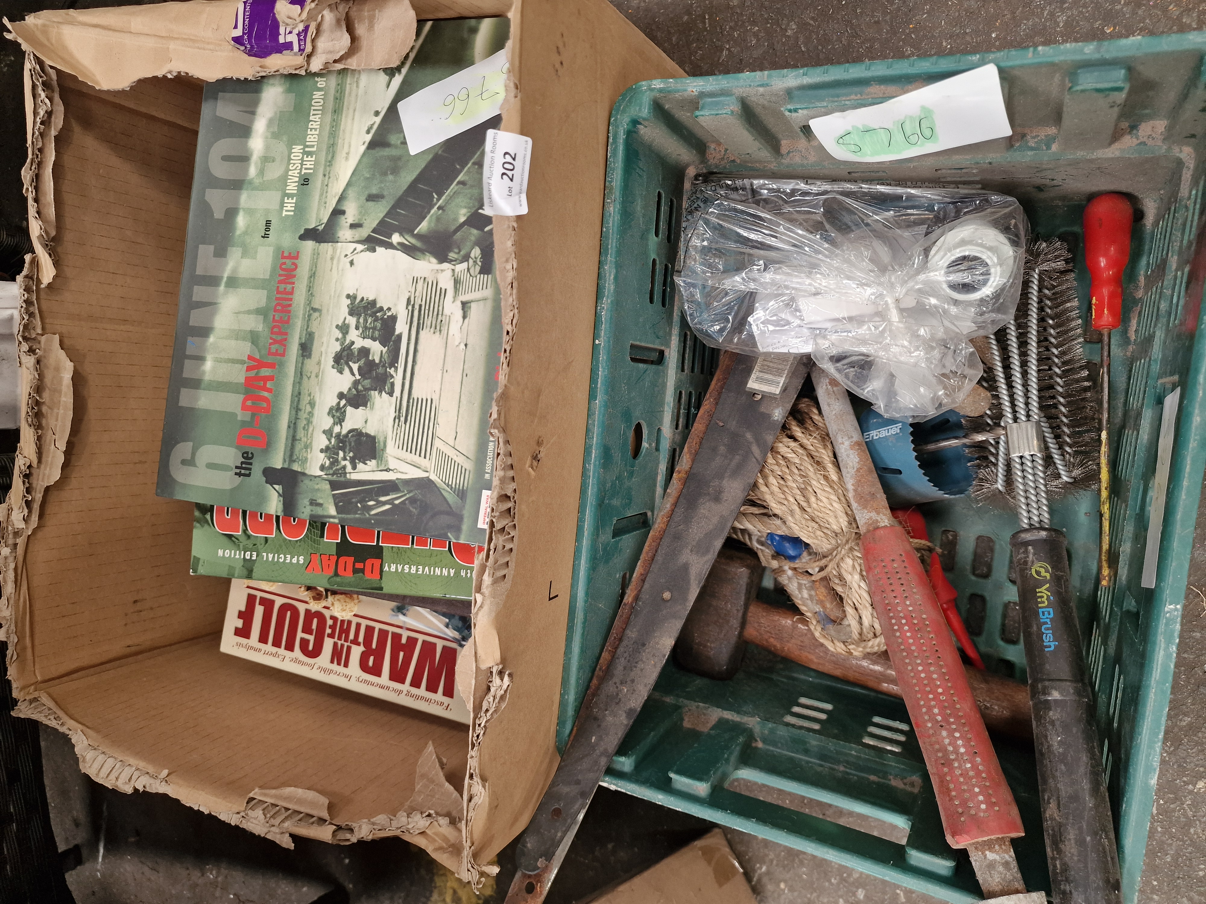 A diverse assortment of items comprising military history publications, workshop tools, and electronic accessories. The media section includes a copy of 6 June 1944: The D-Day Experience by Richard Holmes, produced in association with the Imperial War Museum, featuring removable documents; a D-Day Special Edition 50th Anniversary book; and a War in the Gulf 8-DVD box set. The tool collection, contained within a green plastic crate, includes a large sledgehammer with a wooden haft, an Erbauer-branded blue hole saw bit, a heavy-duty wire brush marked YmBrush, a rusted metal pry bar, and various screwdrivers. Also present is a length of coiled natural fibre rope and miscellaneous hardware. The electronics include multiple black computer keyboards, with at least one bearing the ASUS logo, several computer mice in plastic packaging, and a Belkin Professional USB A Plug-to-A Plug extension cable in its original retail blister pack. Additional items include a white plastic trailer lighting board with light clusters and triangular reflectors, a selection of used brown leather equestrian tack including straps and buckles, a large white moulded plastic component in protective wrapping, and a Gardiners of Scotland decorative fudge tin.