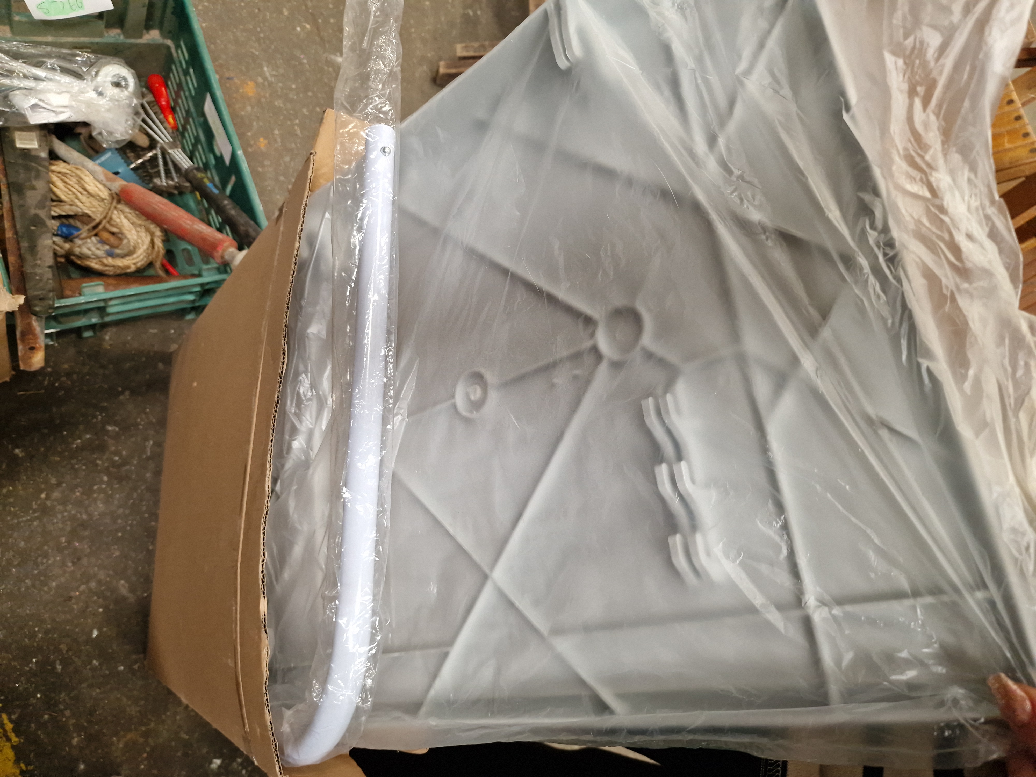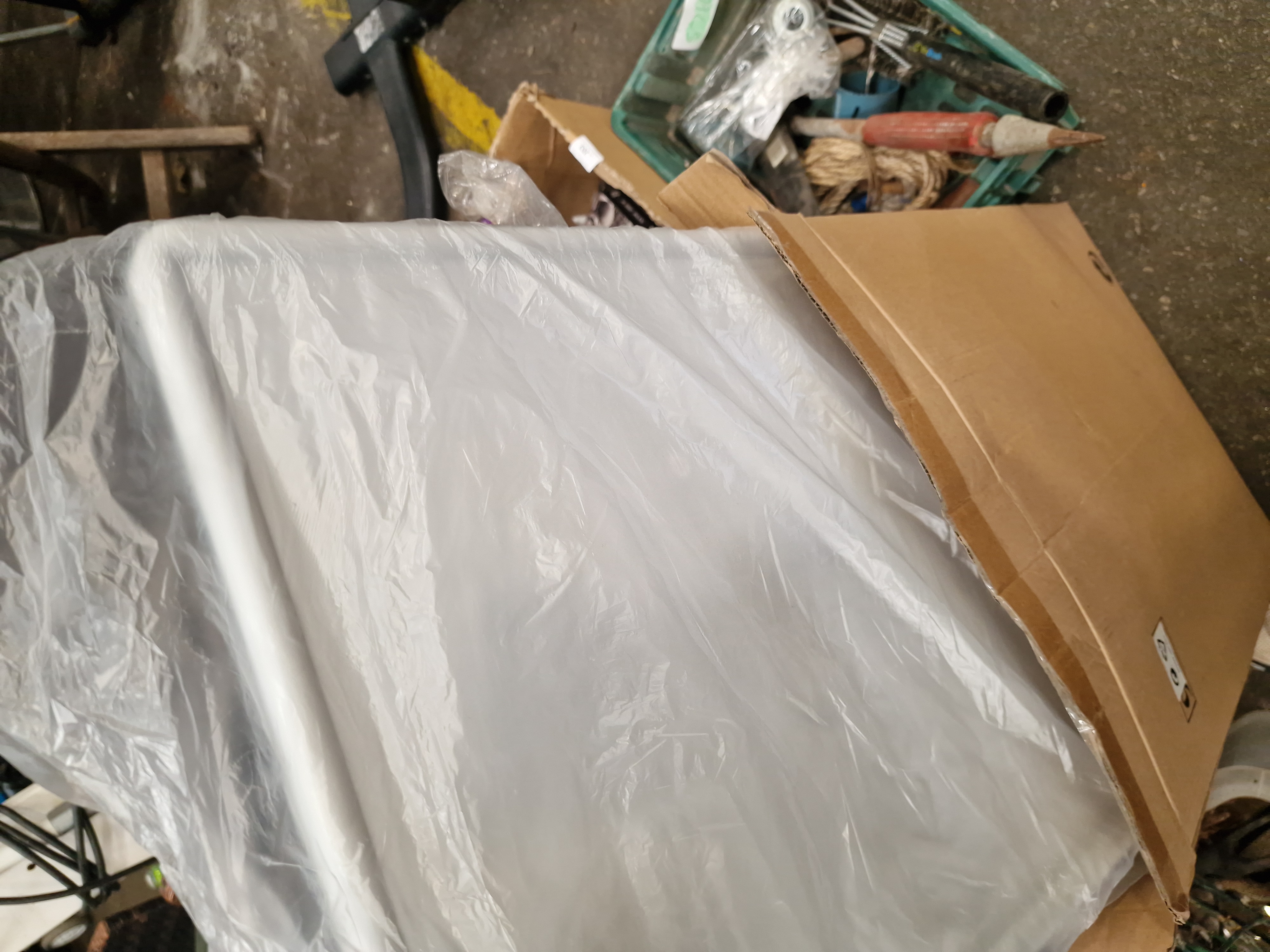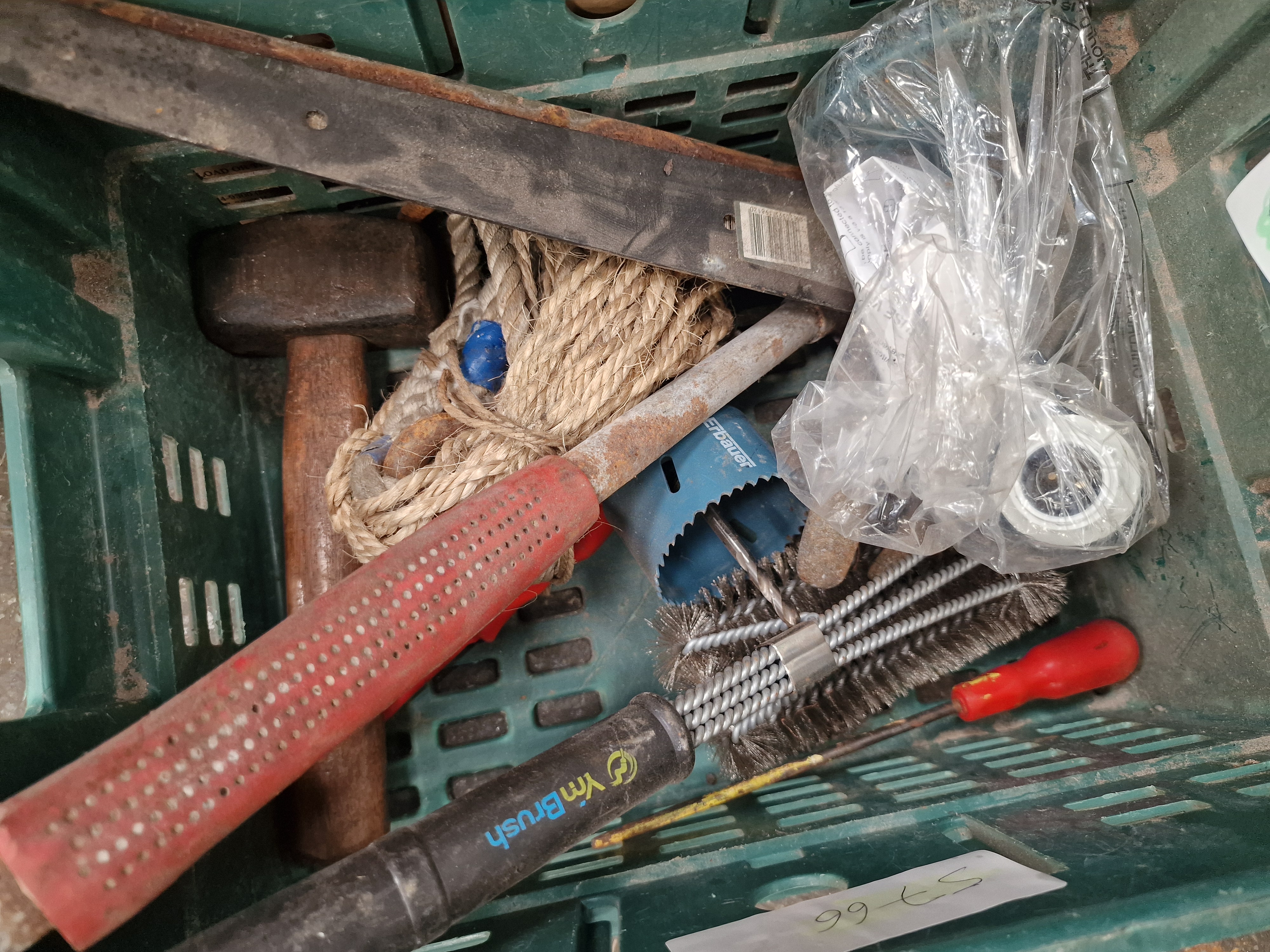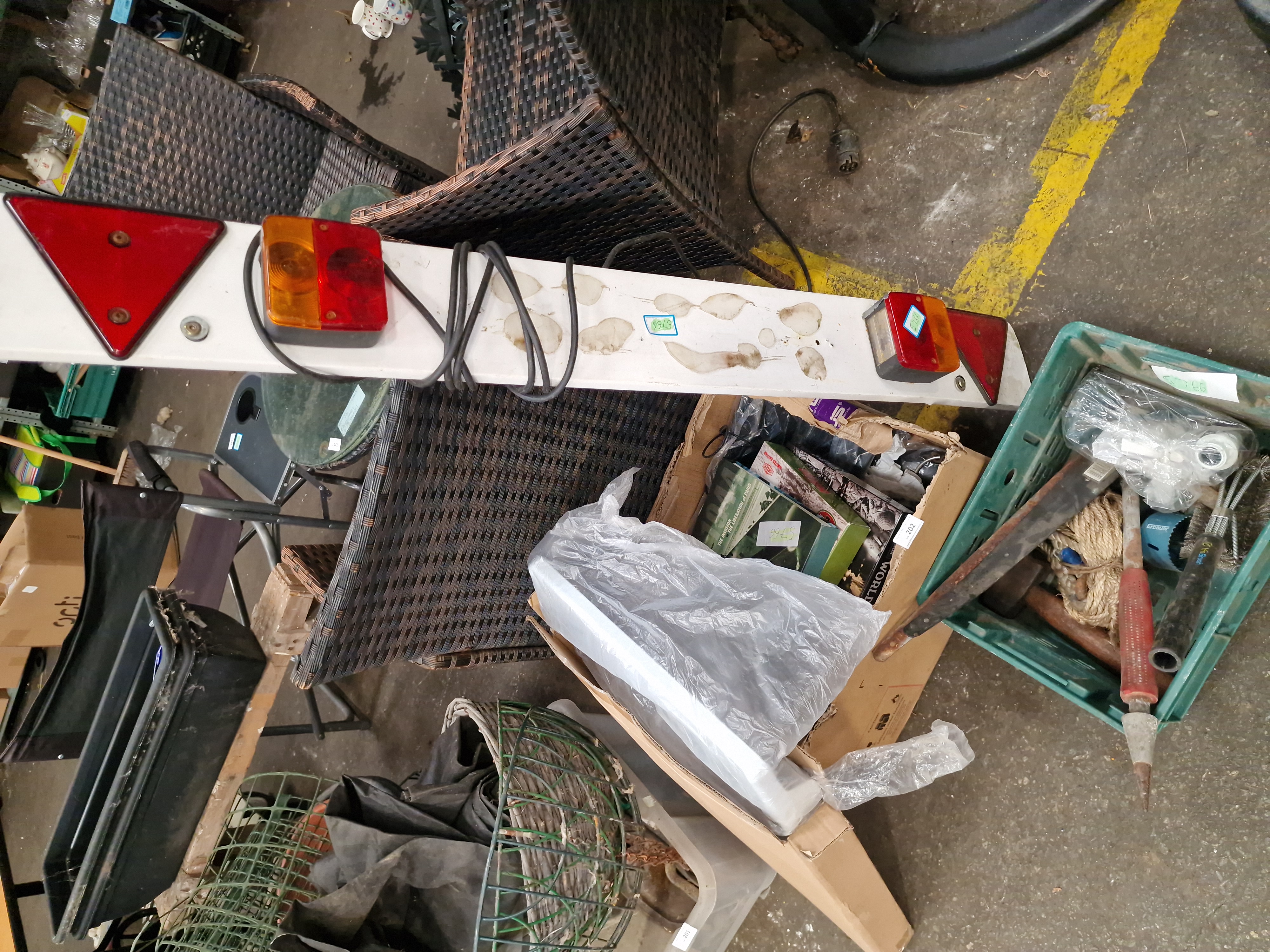 A diverse assortment of items comprising military history publications, workshop tools, and electronic accessories. The media section includes a copy of 6 June 1944: The D-Day Experience by Richard Holmes, produced in association with the Imperial War Museum, featuring removable documents; a D-Day Special Edition 50th Anniversary book; and a War in the Gulf 8-DVD box set. The tool collection, contained within a green plastic crate, includes a large sledgehammer with a wooden haft, an Erbauer-branded blue hole saw bit, a heavy-duty wire brush marked YmBrush, a rusted metal pry bar, and various screwdrivers. Also present is a length of coiled natural fibre rope and miscellaneous hardware. The electronics include multiple black computer keyboards, with at least one bearing the ASUS logo, several computer mice in plastic packaging, and a Belkin Professional USB A Plug-to-A Plug extension cable in its original retail blister pack. Additional items include a white plastic trailer lighting board with light clusters and triangular reflectors, a selection of used brown leather equestrian tack including straps and buckles, a large white moulded plastic component in protective wrapping, and a Gardiners of Scotland decorative fudge tin.