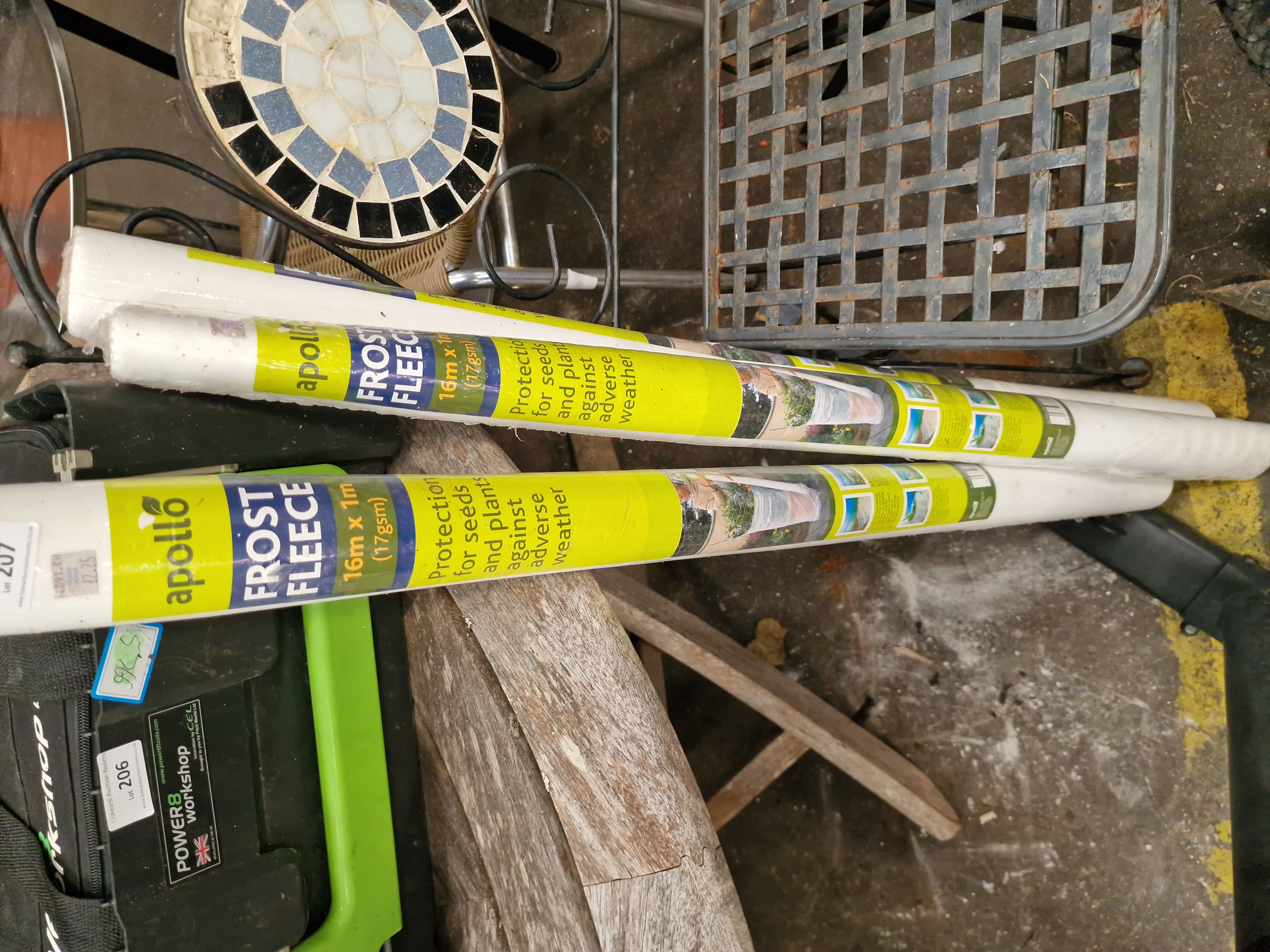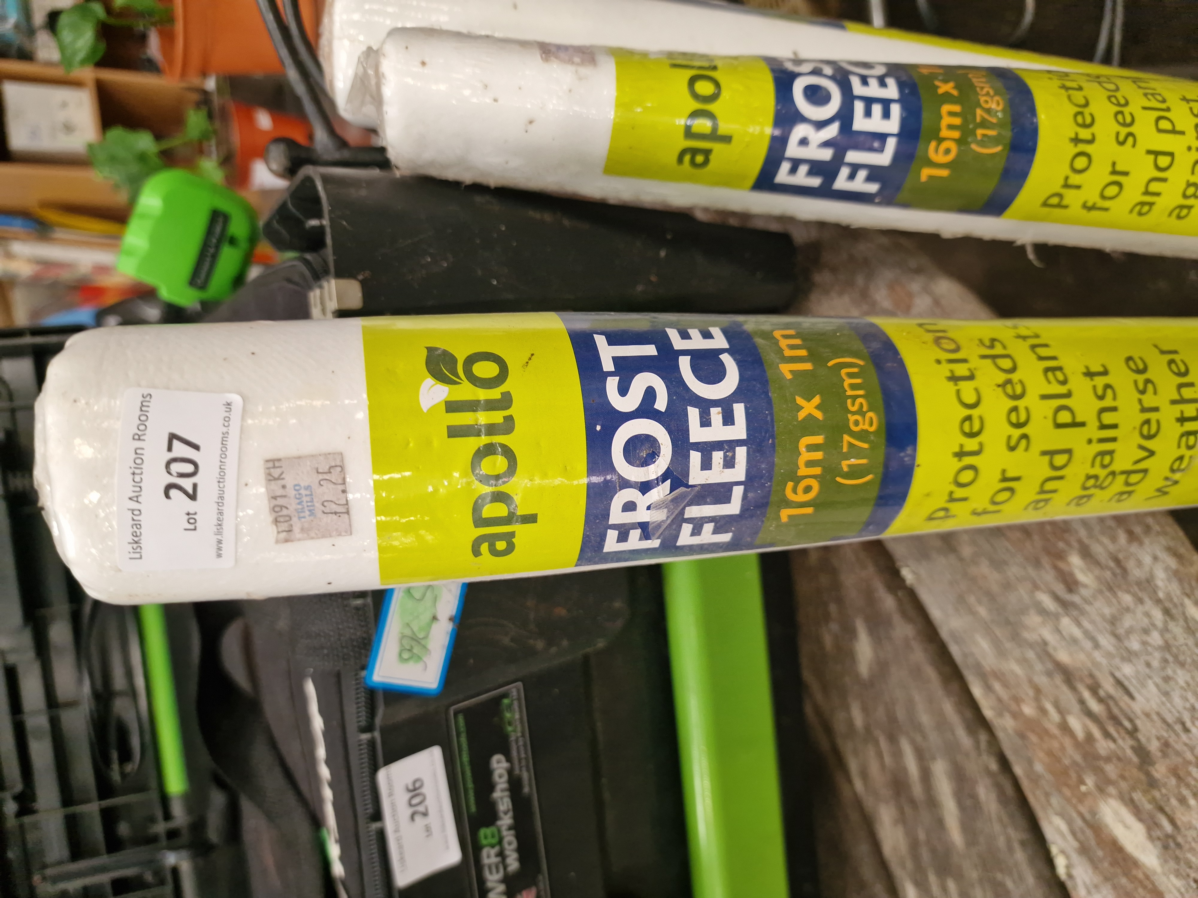 Three rolls of Apollo brand frost fleece for horticultural use, intended for the protection of seeds and plants from adverse weather conditions. The material is a 17gsm non-woven fabric. Each roll is fitted with a manufacturer label detailing the brand name, dimensions, and weight. Visible markings include a Trago Mills price tag of £2.25 and a Liskeard Auction Rooms lot label for Lot 207.