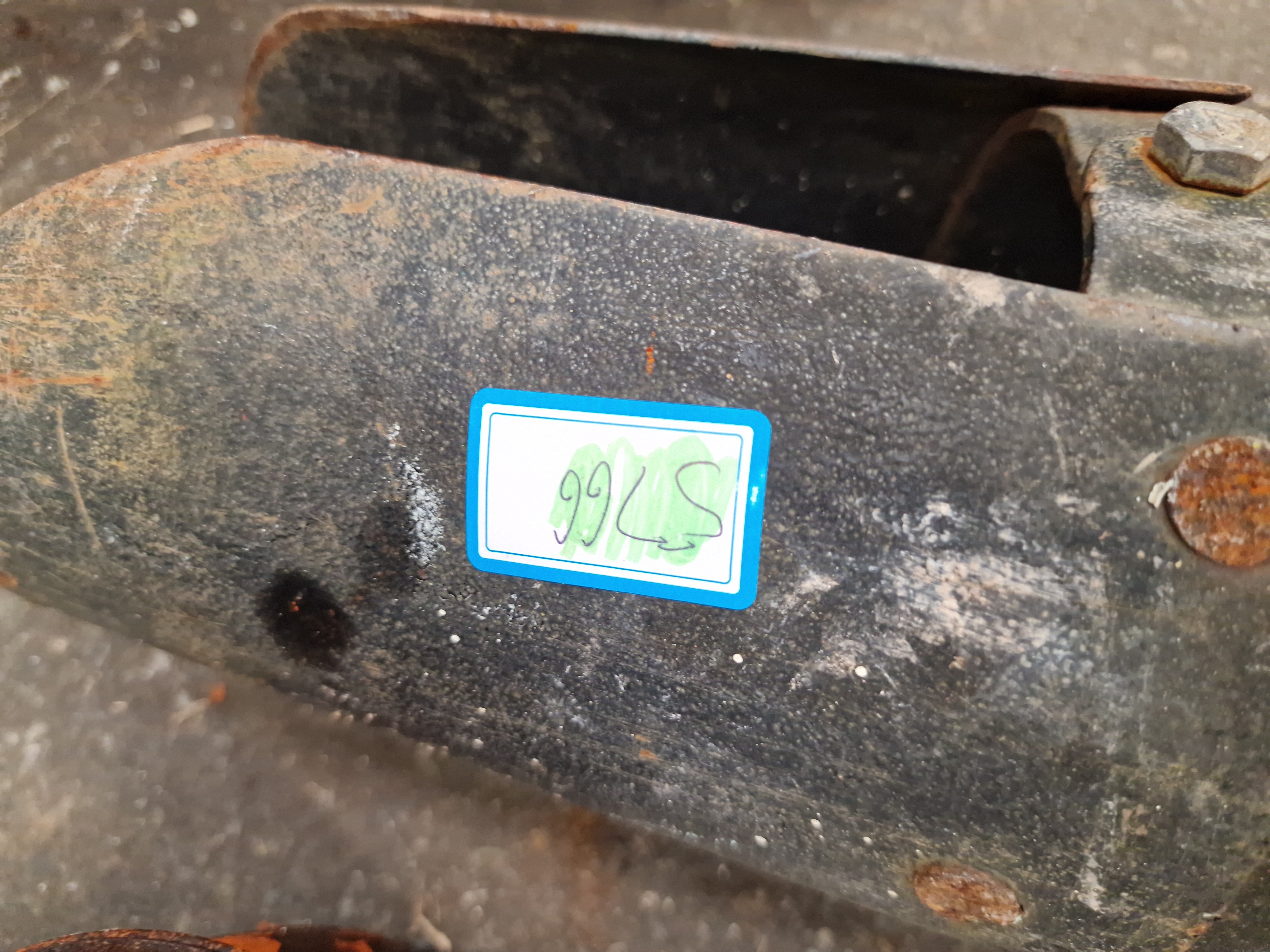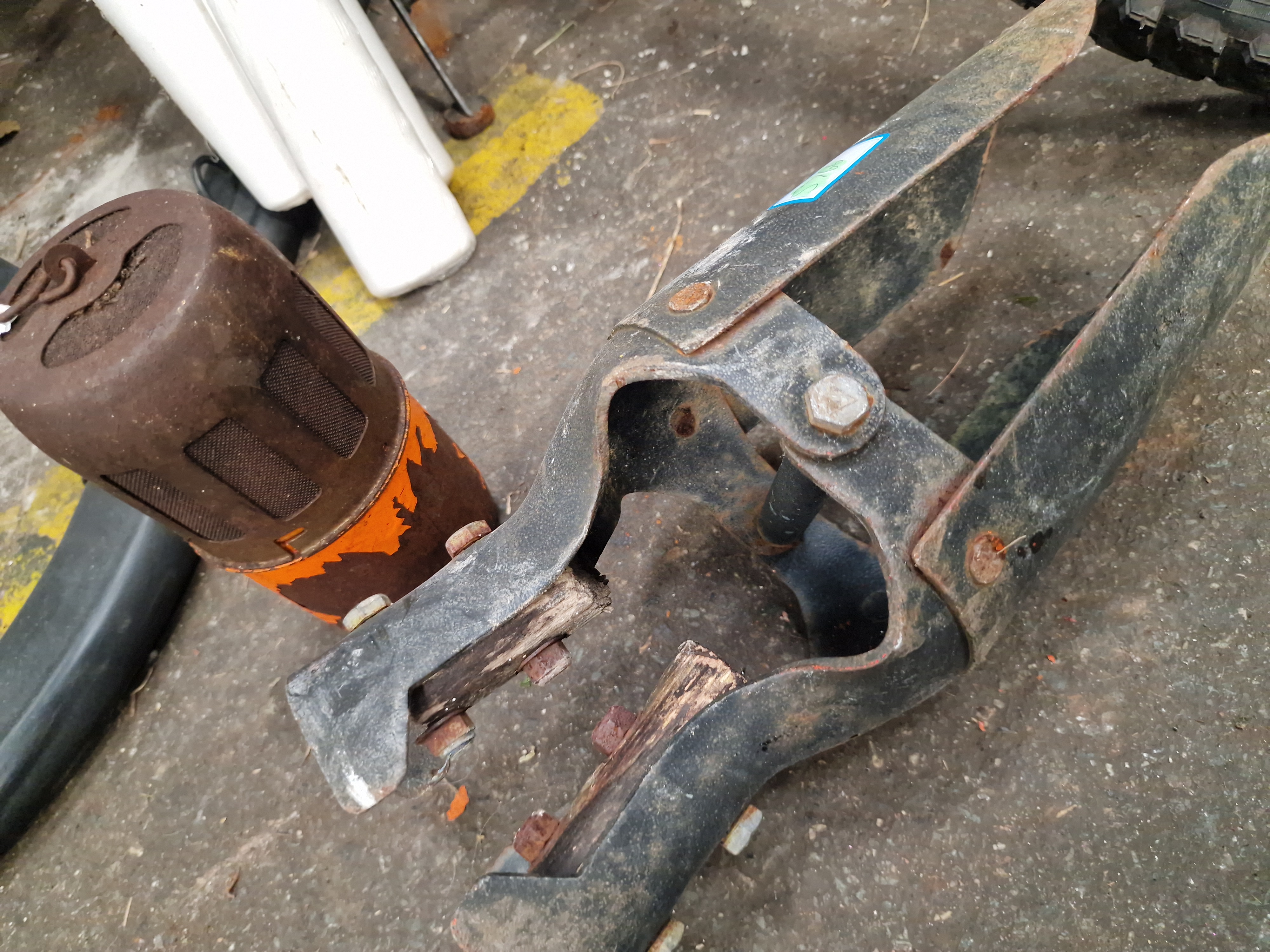 This lot consists of two industrial or agricultural tool components. The first item is a manual double-handled post hole digger head. It is constructed from heavy-gauge steel and retains remnants of a black painted finish. One blade bears a blue-bordered white rectangular adhesive label with the handwritten characters 9945 in green ink. The head features a bolted assembly and mounting sockets for handles. The second item is an industrial pump suction strainer or foot valve. It features a cylindrical body, likely cast iron or steel, with integrated metal mesh screens. One end of the cylinder shows remnants of bright orange paint. A white identification tag is attached to the top via a wire.
